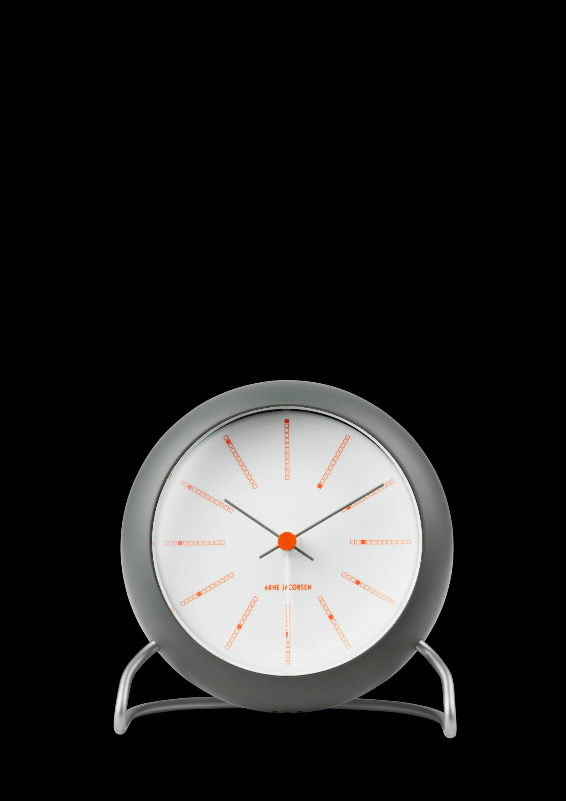 Arne Jacobsen var kendt som en arkitekt som lavede total design når han tegnede bygninger. I 1971 tegnede Arne Jacobsen Nationalbanken i København. Til den smukke marmor beklædte bygning, tegnede Arne Jacobsen Bankers uret. Designet var moderne for sin tid og er det stadig. Den grå matte overflade på uret er en hyldest til Arne Jacobsens favorit materiale, det grå marmor som National Banken er beklædt i. De orange detaljer er en moderne fortolkning af den røde prik.