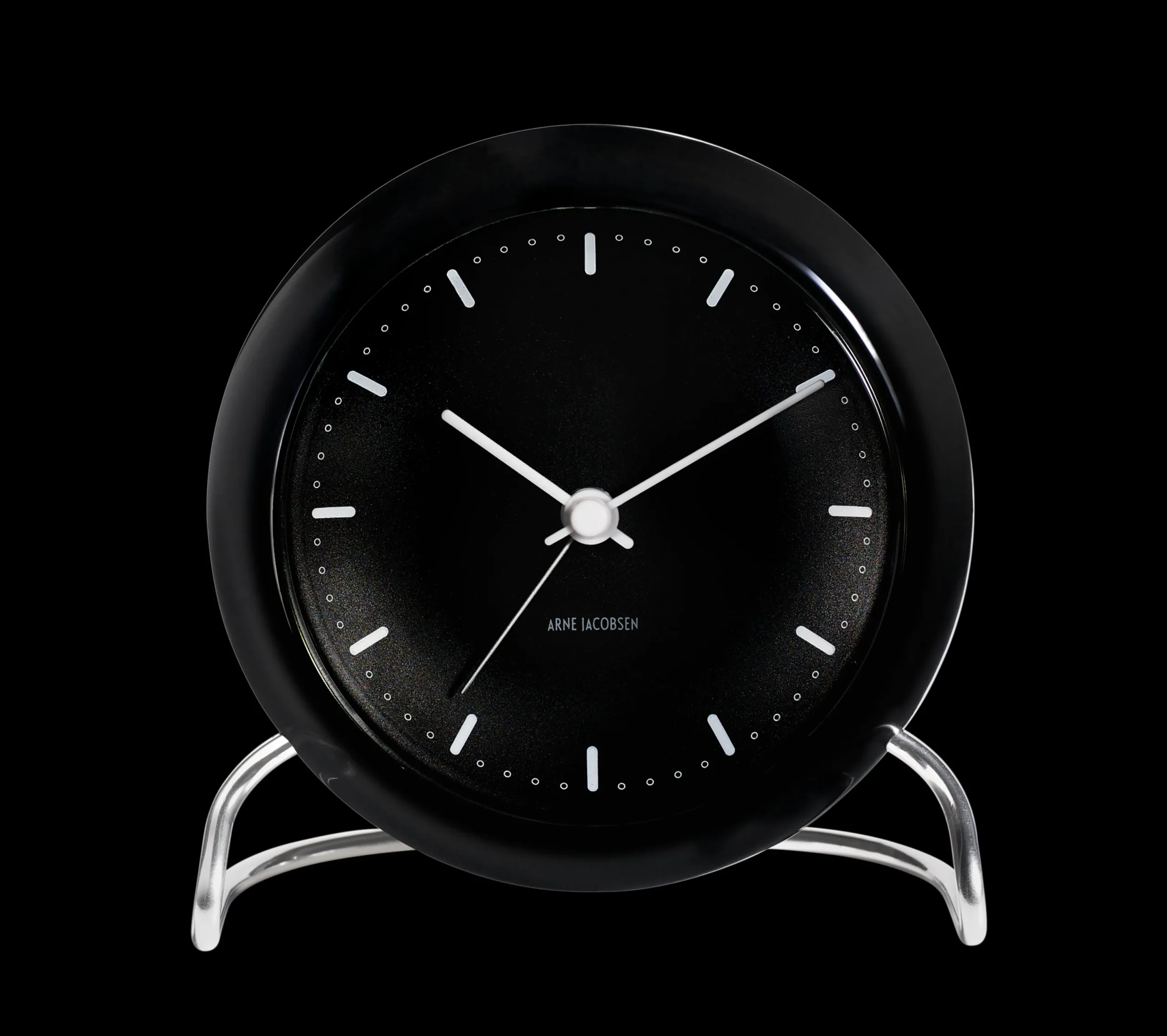 Arne Jacobsens bordur blev oprindeligt udviklet i 1939 til elvareproducenten LK med en klassisk, enkel urskive. Men Jacobsen designede også en række andre ure heriblandt City Hall uret til Rødovre Rådhus. City Hall uret er elsket af danskerne for sit universelle udtryk, og derfor var det oplagt også at lave City Hall uret som bordur. Udover at være et dekorativt indslag overalt i hjemmet har uret de nødvendige vækkeursfunktioner til alarm, snooze og lys. En sensor gør, at både lys og snooze aktiveres ved en let bevægelse med hånden over uret. En fin gaveide til en særlig anledning.
