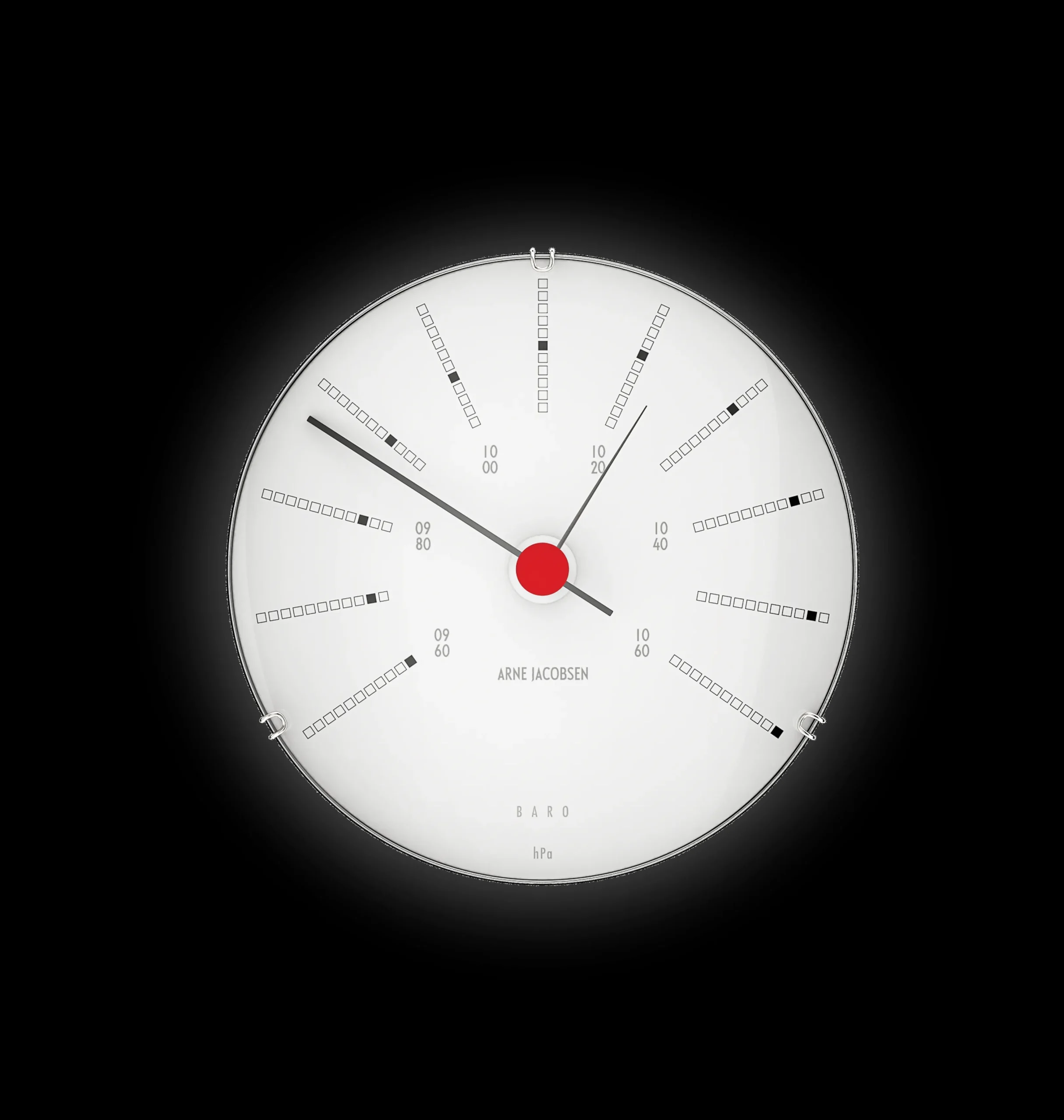 Arne Jacobsen vejrstationen giver ikke kun et overblik over luftfugtighed, temperatur, lufttryk og tiden – vejrstationen er også smuk, enkel og dansk design til væggen. Den danske og internationalt anerkendte arkitekt Arne Jacobsen har sat sit markante aftryk på alt fra arkitektur til interiør, møbeldesign og grafik. Arne Jacobsen fremstår i dag stadig, som en af verdens førende modernister. Blandt Arne Jacobsens markante bygninger er Nationalbanken (1971), hvortil han skabte væguret Bankers. Inspirationen til de nye vejrstationer er fundet i dette ur.nVejrstationen består af vægur (tid), Barometer (lufttryk), Hygrometer (luftfugtighed) og Termometer (temperatur). Alle måler Ø 12 cm.