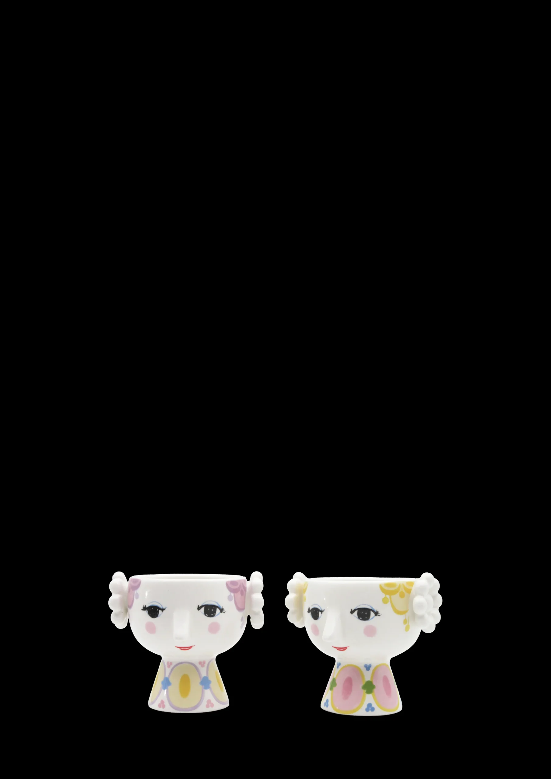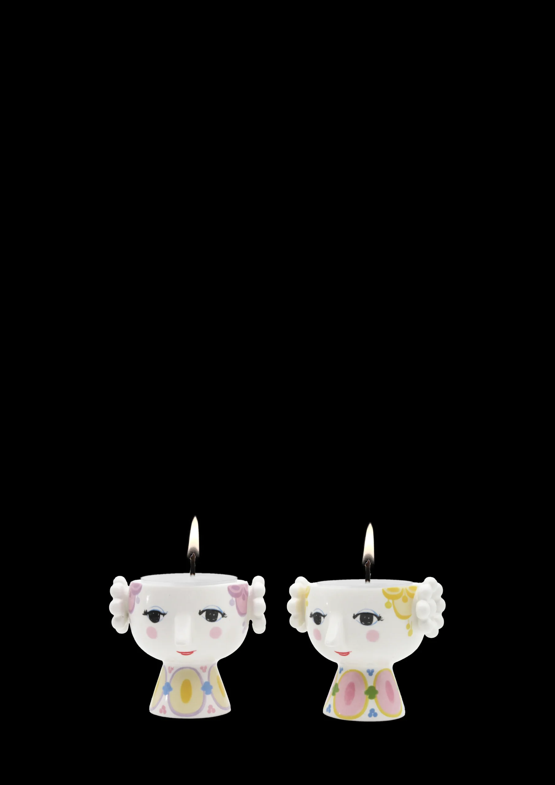 Prikker, tern, striber og cirkler på én gang? Selvfølgelig, kan du næsten høre Bjørn Wiinblad sige. Med sit glade smil, de blussende kinder og farverige dekorationer rummer Eva på alle måder essensen af Bjørn Wiinblad som person og kunstner – også når hun tager form som fyrfadslysestage. Glad og drømmende skaber hun liv og personlighed i indretningen med sit poetiske udtryk og sine sprudlende farver. Fyrfadslysestagerne med en højde på 6 cm og en diameter på 6,5 cm kommer som et par med hver deres personlighed – den ene Eva har gult hår og den anden lavendelfarvet hår. De er udsmykket med farverige kjoler i et mix af begge nuancer, og når et tændt fyrfadslys placeres i dem, lyser de op og gør hverdagen lidt mere farverig. Med deres underfundige smil kan man næsten forestille sig, at de har en lille hyggelig samtale, når de står der på bordet, skænken eller i vindueskarmen og skaber stemning. De er lavet af blankglaseret keramik med farvet decal og er inspireret af Bjørn Wiinblads originale Eva-figurer, der havde brede hoveder med blomsterdekorationer og en kegleformet krop. Ansigtet med de mandelformede øjne og den spidse næse er Wiinblads oprindelige streg, og de farverige kjolemønstre er en nyfortolkning af Bjørn Wiinblads illustrationer fra arkiverne.