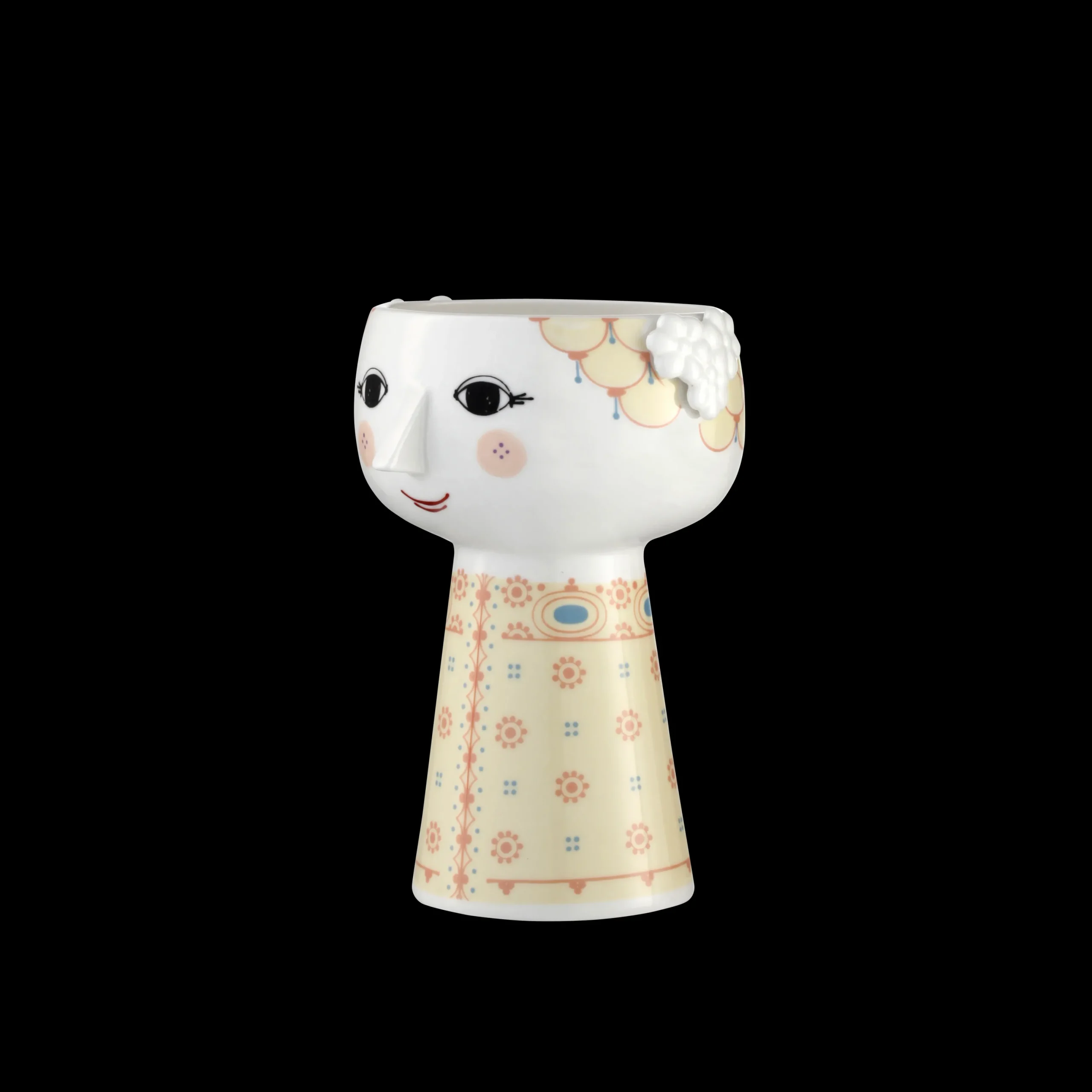 Den fine Eva-vase i gule nuancer fra Bjørn Wiinblad er 15 cm høj. Med en diameter på kun 9 cm er den helt perfekt til mindre blomsterbuketter eller en frisk hyacint. Vasen er lavet i blankglaseret porcelæn med rosa-farvet decall og et elegant blomstermønster i relief på begge sider. Mønsteret på vasen er hentet fra Wiinblads illustrationer, hvor ansigtet er den originale streg fra de allerførste EVA-vaser.