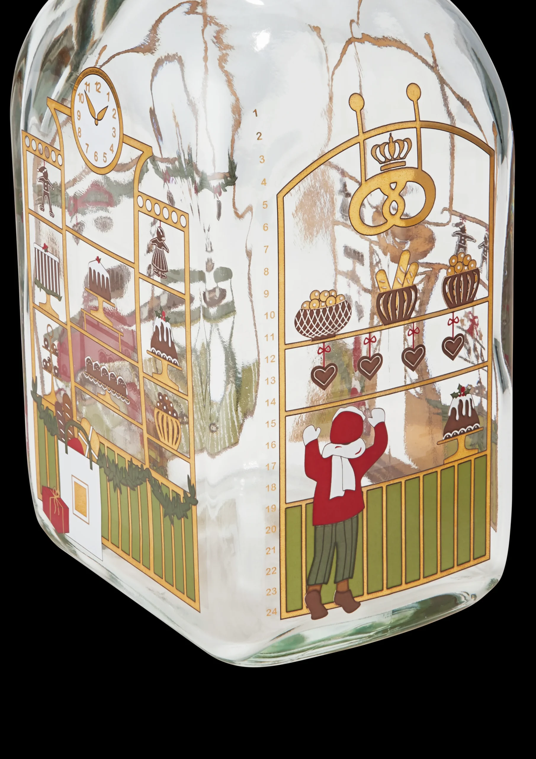 Med kunstner Jette Frölichs nostalgiske og mesterlige papirklip inviterer Holmegaard Christmas dig til et kig ind gennem ruderne i det gamle, traditionelle bageri. På Holmegaard Christmas Juleflaske 2023 tager Jette Frölich os med ind i det gamle, traditionelle bageri, der byder på klejner og vaniljekranse, julehjerter og overdådige julekager med sukat, rosiner og glasur. Ned fra de afrundede vinduer hænger honningkagekoner side om side med honningkagemænd. Julestemningen strømmer ud af bageriet og trækker dig med ind i en lomme af drømme og nostalgi. Hvem har ikke stået uden for et butiksvindue ved juletid med næsen trykket mod ruden og drømt om velduftende julebag og uimodståelige gaver til jul? Juleflasken er 21 cm høj og indeholder 73 cl. Motivuniverset på juleflasken pryder hele Holmegaard Christmas 2023-serien i forskellige variationer. Alt sammen med udgangspunkt i refleksionerne over julens magi og juleflaskens stemningsfulde historie om børnenes juleglæde og forventningen til den store aften. Tåler ikke opvaskemaskine.