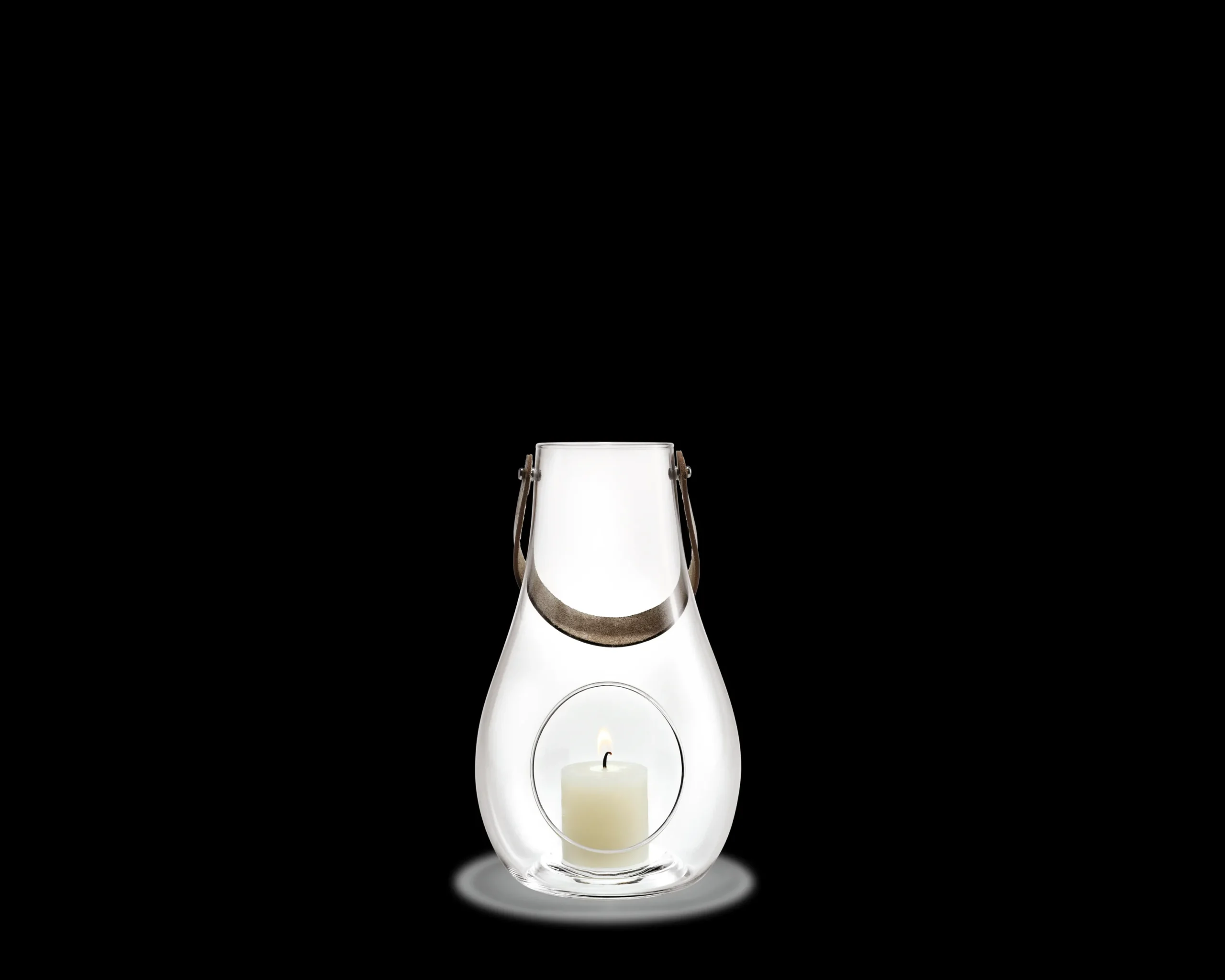 Brug Design with Light lanternen året rundt. Til sommeraftener på terrassen, til dekoration på gulv, bord, trappe og vinduer – og som en stilfuld juledekoration tilsat et par kogler, gran og kanelstænger i bunden. Maria Berntsen har skabt den mobile lyskilde i glas og kernelæder til at sprede hygge i skandinavisk stil. Denne lanterne er 24,8 cm høj, men den findes også i en lille version på 16 cm, en stor version på 29 cm og en gulvversion på 45 cm. Lanternerne findes i både klart glas og er smukke at kombinere. En god gaveidé til en særlig anledning. Hvert stykke mundblæst glas er unikt og håndlavet af glaspusteren, som omhyggeligt blæser den rigtige mængde luft gennem den smalle pibe. Luftbobler i glasset er derfor uundgåelige og udgør en del af den charme, der kendetegner mundblæst glas.