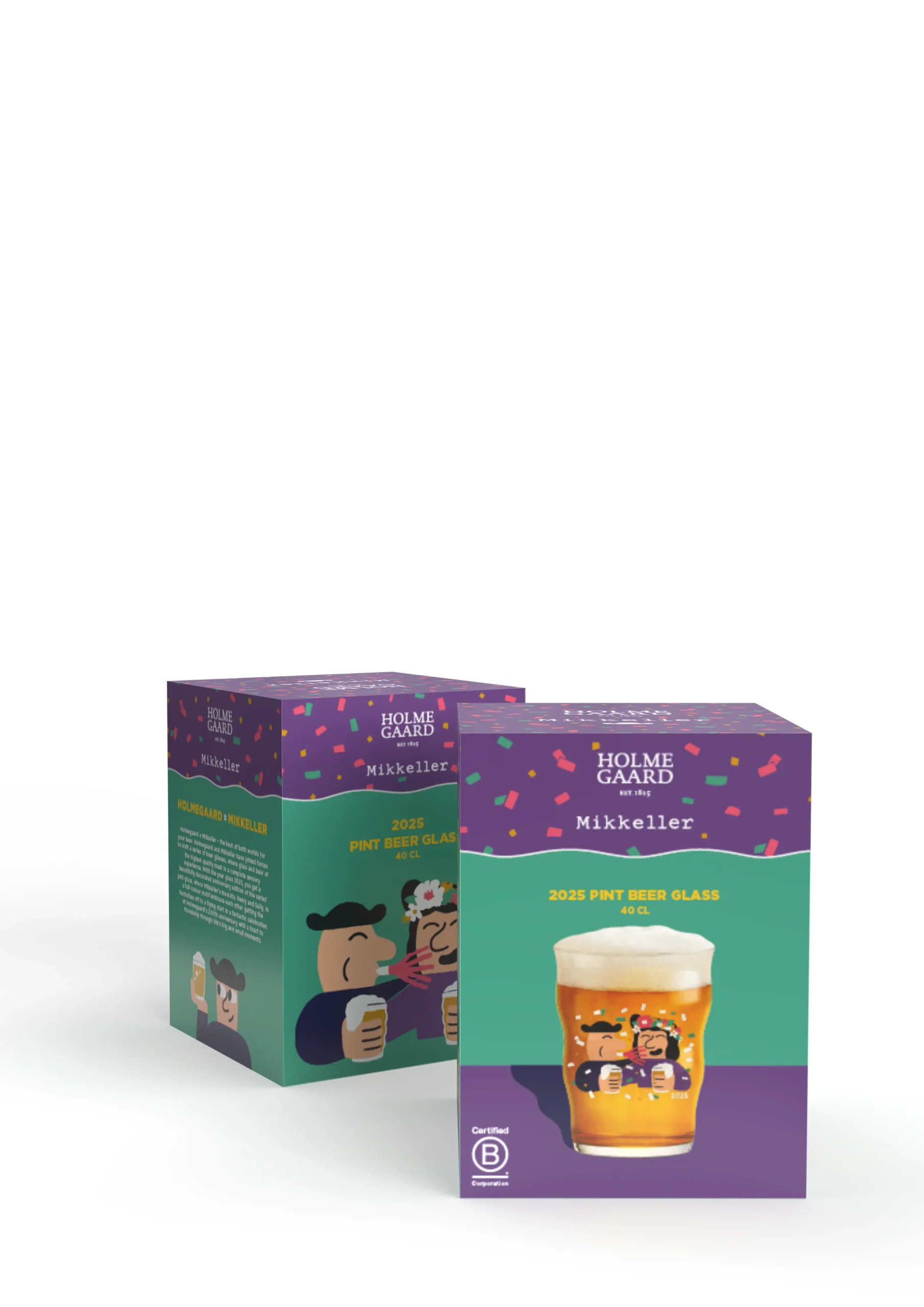 Holmegaard x Mikkeller – det bedste af begge verdener til din øl. I tæt samarbejde har Holmegaard og Mikkeller forenet deres håndværk i en serie af ølglas, hvor glas og øl af den højeste kvalitet mødes i en fuldendt sanseoplevelse. Med 2025-årsglasset får du en smukt dekoreret jubilæumsudgave af seriens pintglas, hvor Mikkellers maskotter, Henry og Sally, i et fuldfarvet motiv omfavner hinanden og fløjter festlighederne i gang til en fantastisk fejring af Holmegaards 200-årsjubilæum med en skål for godt venskab gennem livets både store og små øjeblikke, mens konfettien flyver om ørerne på dem. Henry har den ikoniske sorte hat på og er iført en mørkeblå T-shirt, mens Sally med en smuk blomsterdekoration i håret bærer en lilla T-shirt. I 200 år har Holmegaard været en passioneret pioner med et hjerte af ild, der har udfordret glassets potentiale og lagt fundamentet for generationers refleksioner i glas og defineret dansk glashistorie. Og det fantastiske jubilæum går selvfølgelig heller ikke ubemærket hen i Holmegaard x Mikkeller-serien, der nu udvides med et festligt dekoreret 2025-årsglas. Inden for hver deres håndværk skubber Holmegaard og Mikkeller grænserne for, hvad der kan lade sig gøre og går aldrig på kompromis med hverken kvalitet eller kreativitet. Det er innovation og fornyelse, der danner grundstenene hos både Holmegaard og Mikkeller, og kompromisløst og med et skarpt øje for detaljen bliver begge brands ved med at overraske og inspirere. Holmegaard er kendt for at skabe refleksioner i glas gennem generationer. Og serien med Holmegaard x Mikkeller-ølglas er den oplagte gaveidé til ølelskeren. Serveret i hvert sit specialdesignede glas vil du opleve både den enkelte øl og glassets fulde potentiale udfolde sig.