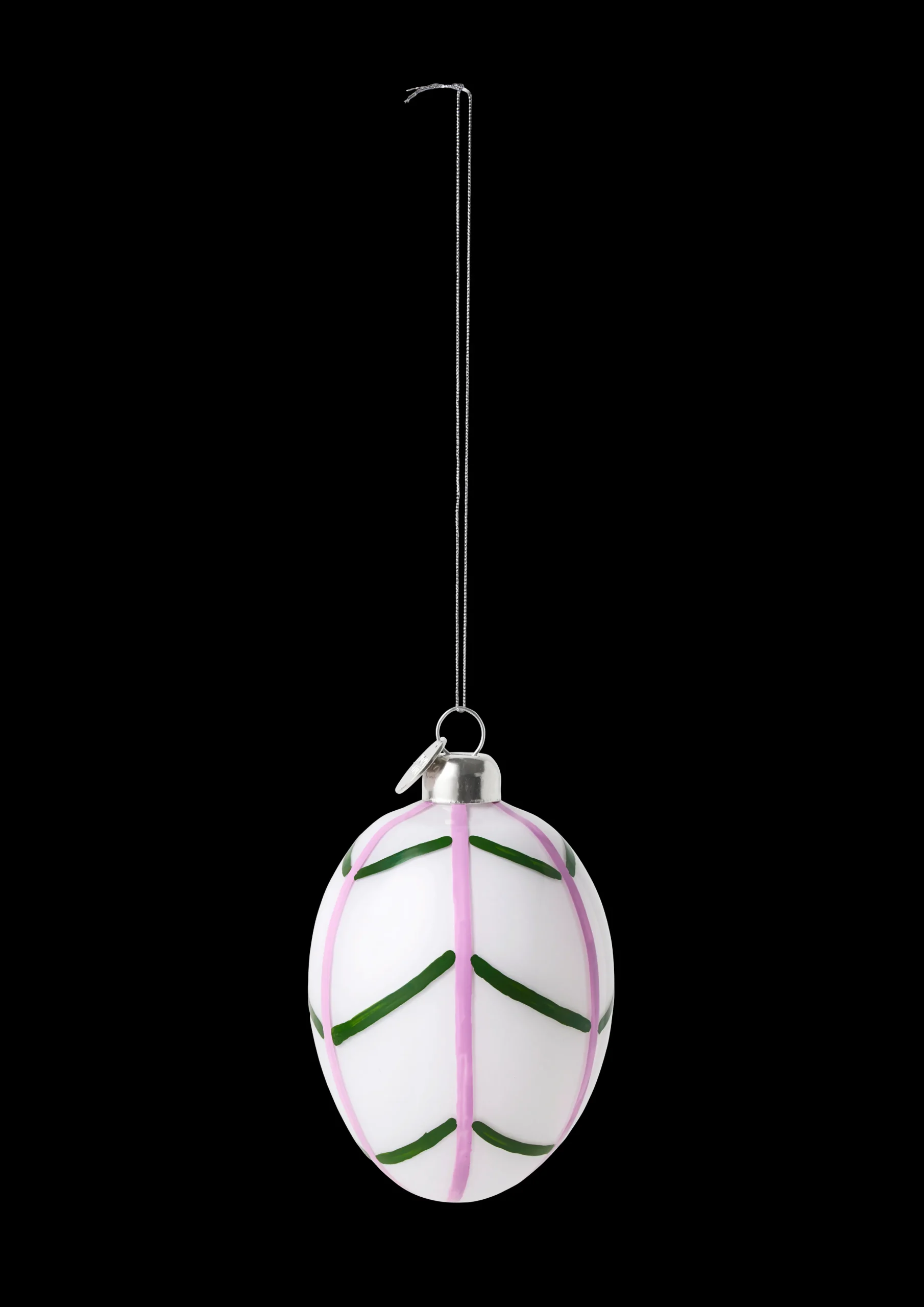 De fine Souvenir-påskeophæng i mundblæst borosilikatglas fra Holmegaard er inspireret af forårets optimisme og klare farver. Dette ophæng måler 7,5 cm og fortolker de første blade, der modigt folder sig ud efter den lange vinter. Enkelt og minimalistisk fornemmer du bladets linjer, der er malet i hånden med lethed og poesi. De klare, lilla striber skaber en moderne kontrast til den klassiske mørkegrønne, og forenet på den hvide baggrund giver det et rent og enkelt udtryk. Et sølvfarvet ophæng gør det nemt at hænge æggene på afklippede grene – eksempelvis i en stor vase – hvor de vil skabe øjeblikkelig påskestemning i boligen. De kan også hænges i vinduet, hvor de vil reflektere forårssolens stråler og kun blive endnu smukkere. Og et påskeophæng fra Holmegaard er også en oplagt værtindegave til påskefrokosten med familien eller vennerne.