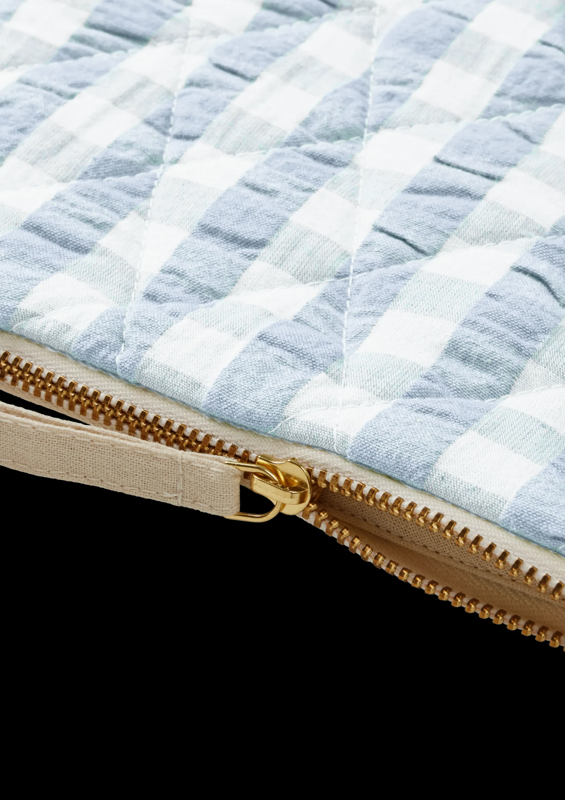 Dalila Toilettaske måler 20x14cm og kan bruges til makeup, rejsedokumenter, skriveredskaber eller andre mindre genstande, som du gerne vil holde styr på i tasken eller derhjemme. Den lille pouch er syet i 100% økologisk Bæku0026Bølge-bomuld, i farvekombinationen lys blå/hvid. Som en del af JUNAs bæredygtige designfilosofi er pouchen produceret af overskudsstof fra produktionen af JUNA-sengetøj.
