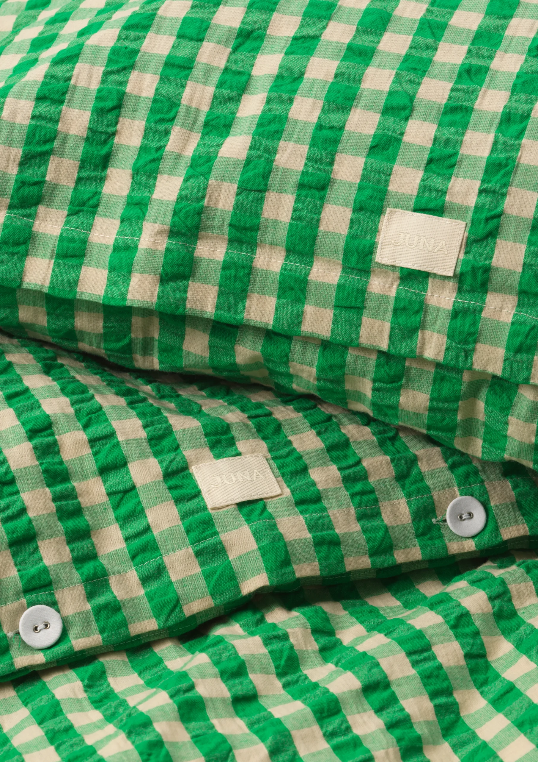 Det sæt tøj du bruger allermest tid i, er dit sengetøj. Derfor er sengetøj fra Juna skabt med intentionen om at være sanseligt, behageligt og 100% økologisk og bæredygtigt, så du trygt kan lægge dig til ro hver aften og få en god nats søvns. Juna handler om glæden ved at omgive sig med tekstiler, der gør livet smukkere, blødere, mere farverigt og sjovere. Derfor er farver og mønstre en stor del af Juna og giver sengetøjet en hyggelig og uhøjtidelig følelse. Den velkendte og klassiske ternede vævning fortolkes i en moderne farvepalet og det er netop kombinationen af det nostalgiske og nyskabende er med til at skabe en unik og glad stemning i indretningen. Den ternet Bæk u0026 Bølge i grøn/sand har en skøn friskhed og sprødhed over sig – nærmest som nyudsprungne bøgeblade. Materialet er 100% økologisk bomuld, der både er OEKO-TEX®-mærket og GOTS-certificeret. Pudebetrækket lukkes med kuvertlukning, mens dynebetrækket lukkes med knaplukning. Har du flere forskellige sengesæt fra Juna, kan du mixe og matche de forskellige farver og mønstre på kryds og tværs og skabe din helt egen stil i soveværelset. Bæk u0026 Bølge er vævet, så det har en helt speciel tekstur, der lader luften cirkulere mellem huden og dynen – perfekt til de varme sommernætter. Det giver en god nats søvn, så du kan restituere og lade op til en ny dag. Og så er det ovenikøbet strygefrit, så du kan lade den lune sommervind om tørringen og lægge sengetøjet på direkte fra tørresnoren. Sengesættet består af 1 dynebetræk på 140×200 cm og 1 pudebetræk på 60×63 cm