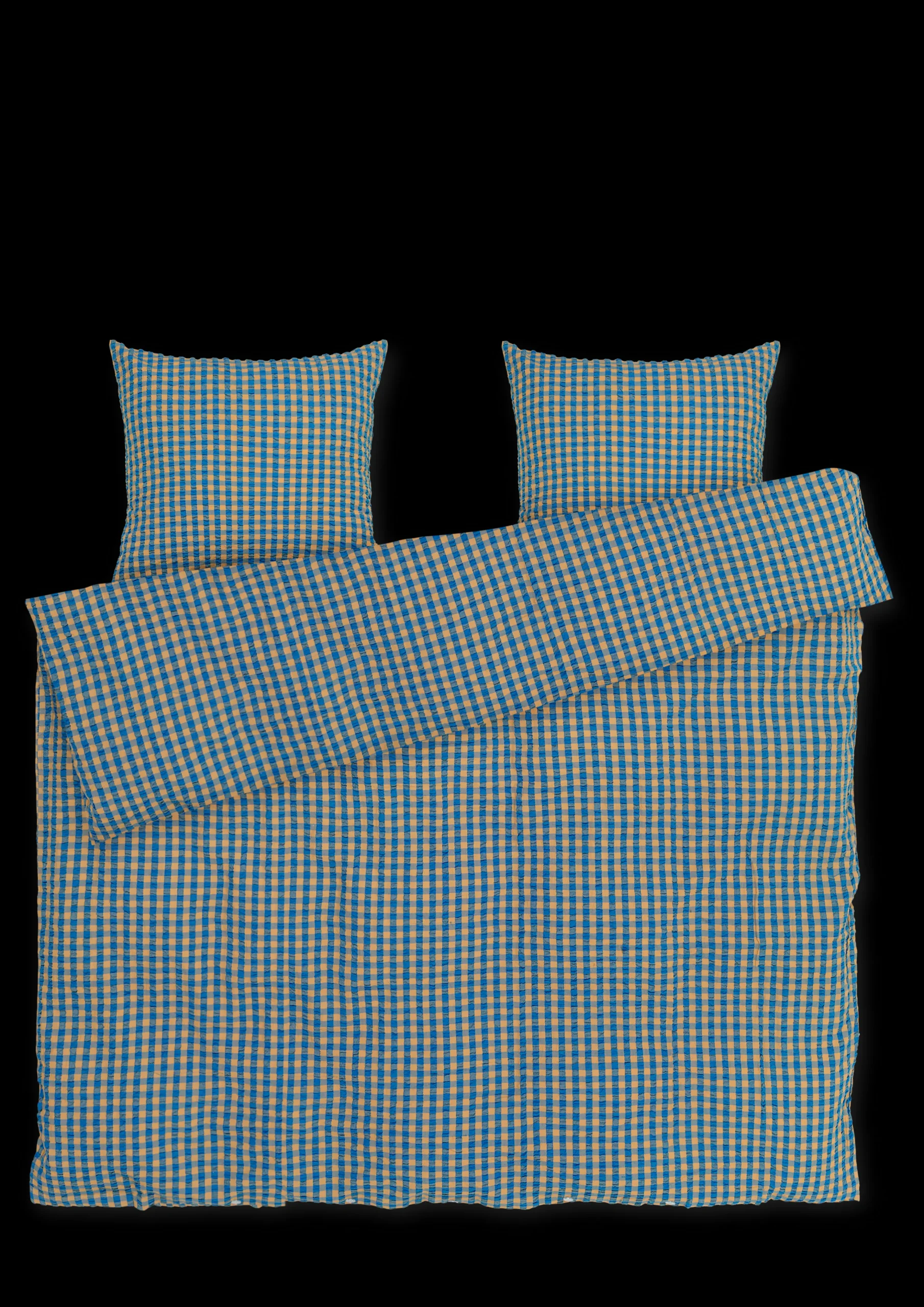 Det nye sengesæt i ternet Bæku0026Bølge kommer i farven blå/okker. Blå har en varm og afdæmpet friskhed over sig, mens okker giver en dybde og ro, der minder om en gåtur ved skov og strand på en smuk efterårsdag. Materialet er 100% økologisk bomuld, der både er OEKO-TEX®-mærket og GOTS-certificeret – og så er det ovenikøbet strygefrit. Pudebetrækket lukkes med kuvertlukning, mens dynebetrækket lukkes med knaplukning. Har du flere forskellige sengesæt fra JUNA, kan du mikse og matche de forskellige farver og mønstre på kryds og tværs og skabe din helt egen stil i soveværelset.