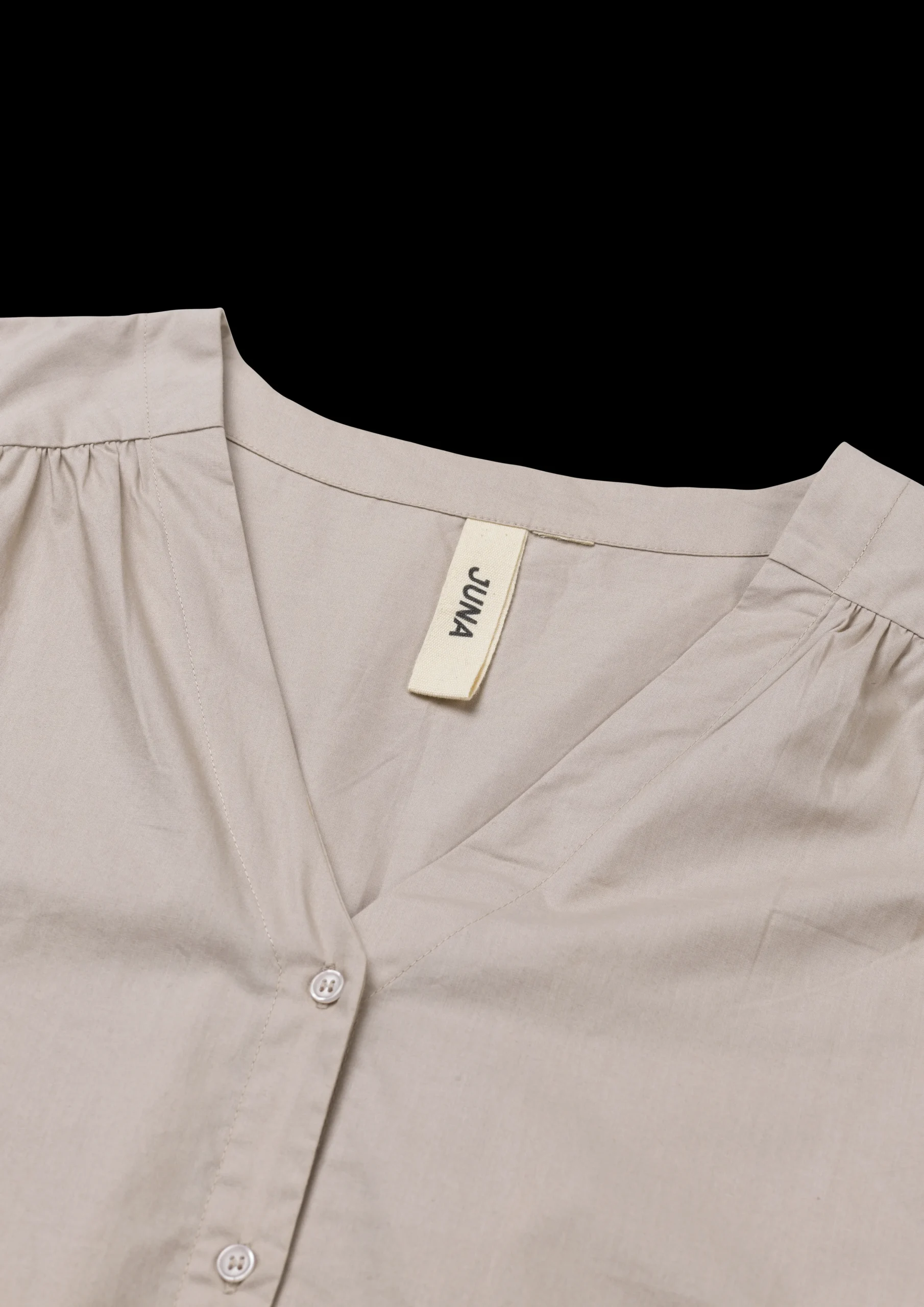 Juna Garderobe er fyldt med det fineste lette og luftige sommertøj, der både kan bruges som nattøj til de varme sommernætter og som en del af en casual sommergarderobe perfekt til lange sommerdage i haven, is på kajen og ture ud i det blå. Som en del af Junas bæredygtige designfilosofi bruges der altid overskudsstof fra produktionen af sengetøj til Juna Garderobe, og lige netop denne vævning og farve er den sidste af sin slags på Junas lager. Juna Soft har en helt unik struktur og kvalitet, der nærmest svæver over huden – stilfuldt og elegant. Stoffet kommer i grå farve som passer til alt og er smuk mod solgylden sommerhud. Kjolen i modellen Laura har mange fine detaljer som V-neck, gennemgående knapper, læg ved skuldrene og øverst på ryggen, elastik ved ærmerne, der giver et klassisk og feminint look og går til cirka midt på læggen. Skødesløst og casual, men i et skarpt snit og en lækker stofkvalitet. Tøjet i Juna Garderobe er altid fremstillet i 100% økologisk bomuld, produceres i overensstemmelse med EU standarder og tåler maskinvask op til 40°, hvilket ikke blot er skånsomt for miljøet, men også for tøjet, som får længere levetid ved den lavere temperatur. Bemærk, at dette produkt er stor i størrelsen.