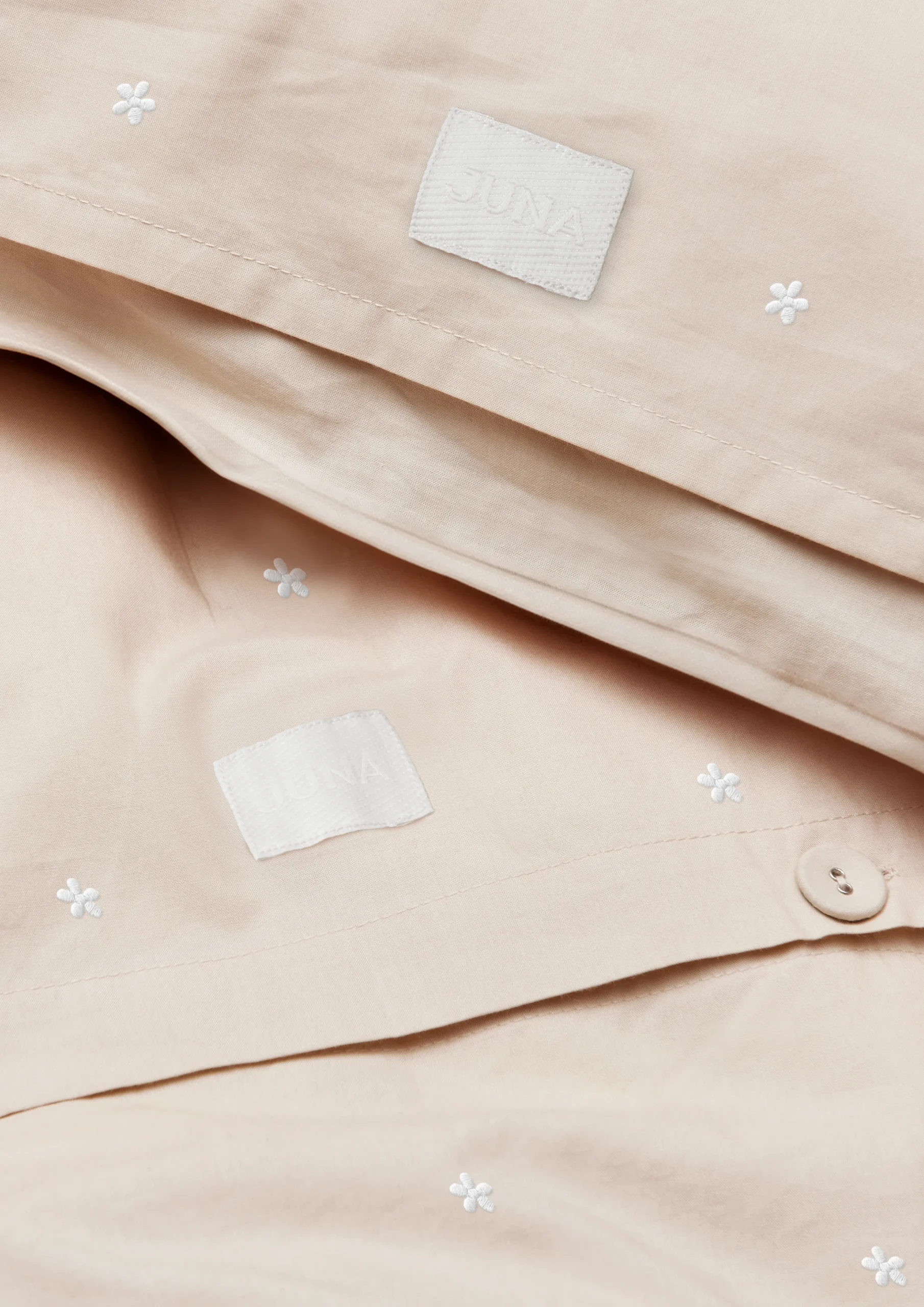 Små blomster til store drømme. Med Daisy-sengesættet fra JUNA får du en nyfortolkning af det klassiske blomsterprint, hvor en broderet blomst i kontrastfarve smukt og stilfuldt spiller sammen med JUNAs altid både enkle og moderne design. Sanseligt, behageligt og produceret ud fra ansvarlige principper. Sådan kender du sengetøjet fra JUNA. Og med Daisy-serien fortsætter JUNA i samme både vidunderlige og ansvarlige stil, hvor uendelige drømme lever og ånder side om side med en passioneret vision for ansvarlighed og cirkularitet nu og i fremtiden. Sengetøjet til dyner med ekstra længde måler 140×220 cm, og i denne smukke sandfarvede version med små broderede blomster i hvid får du en farvesammensætning med masser af hygge og varme, men som fortsat er helt klassisk. Daisy er fremstillet i 100% økologisk bomuld, der både er GOTS-certificeret og OEKO-TEX®-mærket, så du kan nyde en god nats søvn med god samvittighed. Og når du kommer helt tæt på Daisy-sengetøjet, vil du ud over detaljerne med de mange små margueritter også virkelig kunne se og mærke lækkerheden i den tætte og fine bomuldspercale, der giver stoffet en blød og glat tekstur. Samtidig med at være ekstrem behagelig at sove i får du med percalevævningen også et meget slidstærkt og holdbart sengesæt i en eksklusiv kvalitet, som du kan have glæde af nat efter nat – og år efter år. Daisy-seriens hyggelige og klassiske vibe med et moderne tvist skaber en glad og drømmende stemning i soveværelset, i sofaen, i hængekøjen, på altanen, eller hvor du nu tager din dyne og pude med hen. Det er helt op til dig, og med de forskellige Daisy-sengesæt fra JUNA kan du jo sagtens mixe og matche farver på dyner og puder på kryds og tværs og skabe din helt egen stil. (GOTS ”Organic” Certified by Control Union, CU1026087)