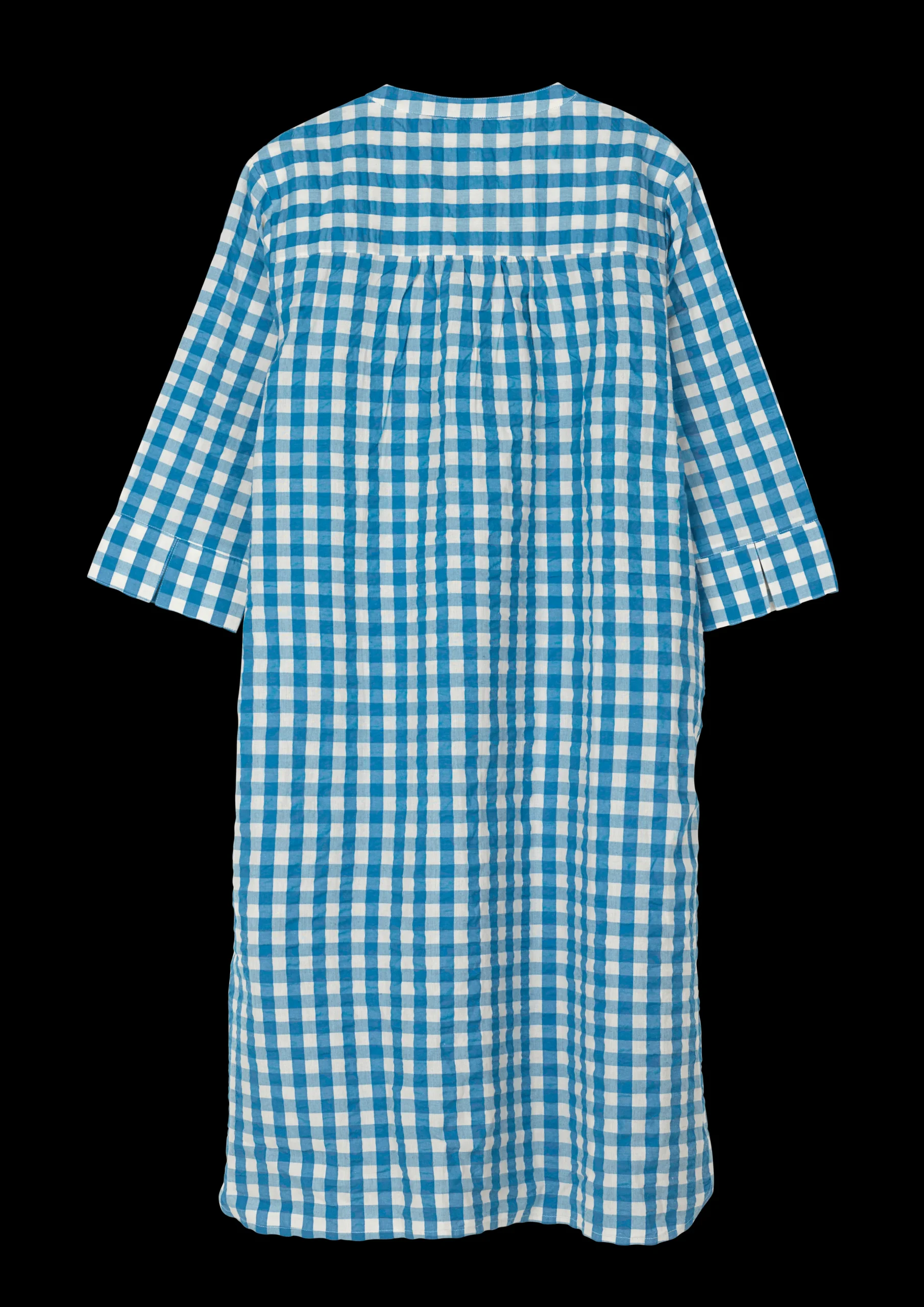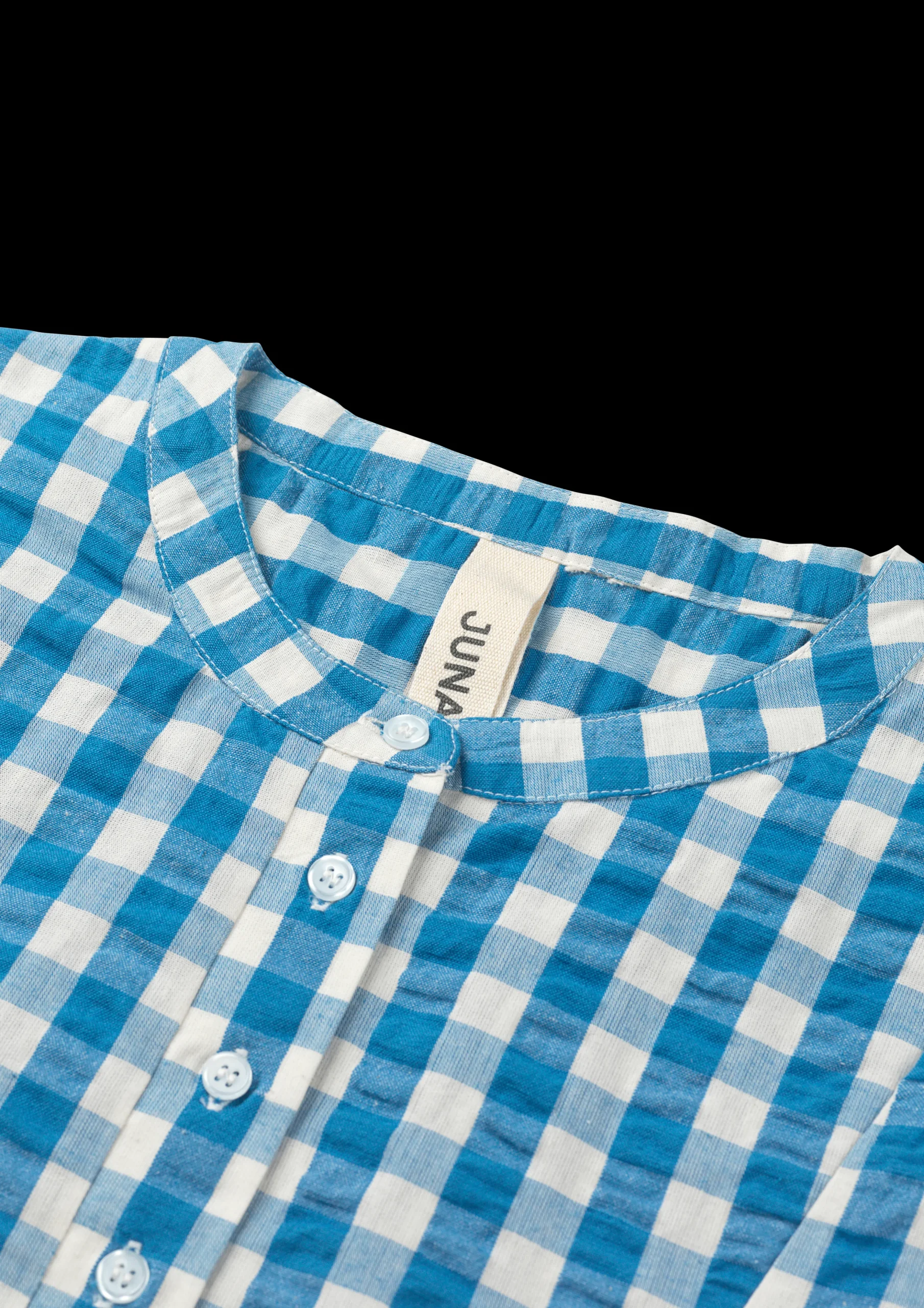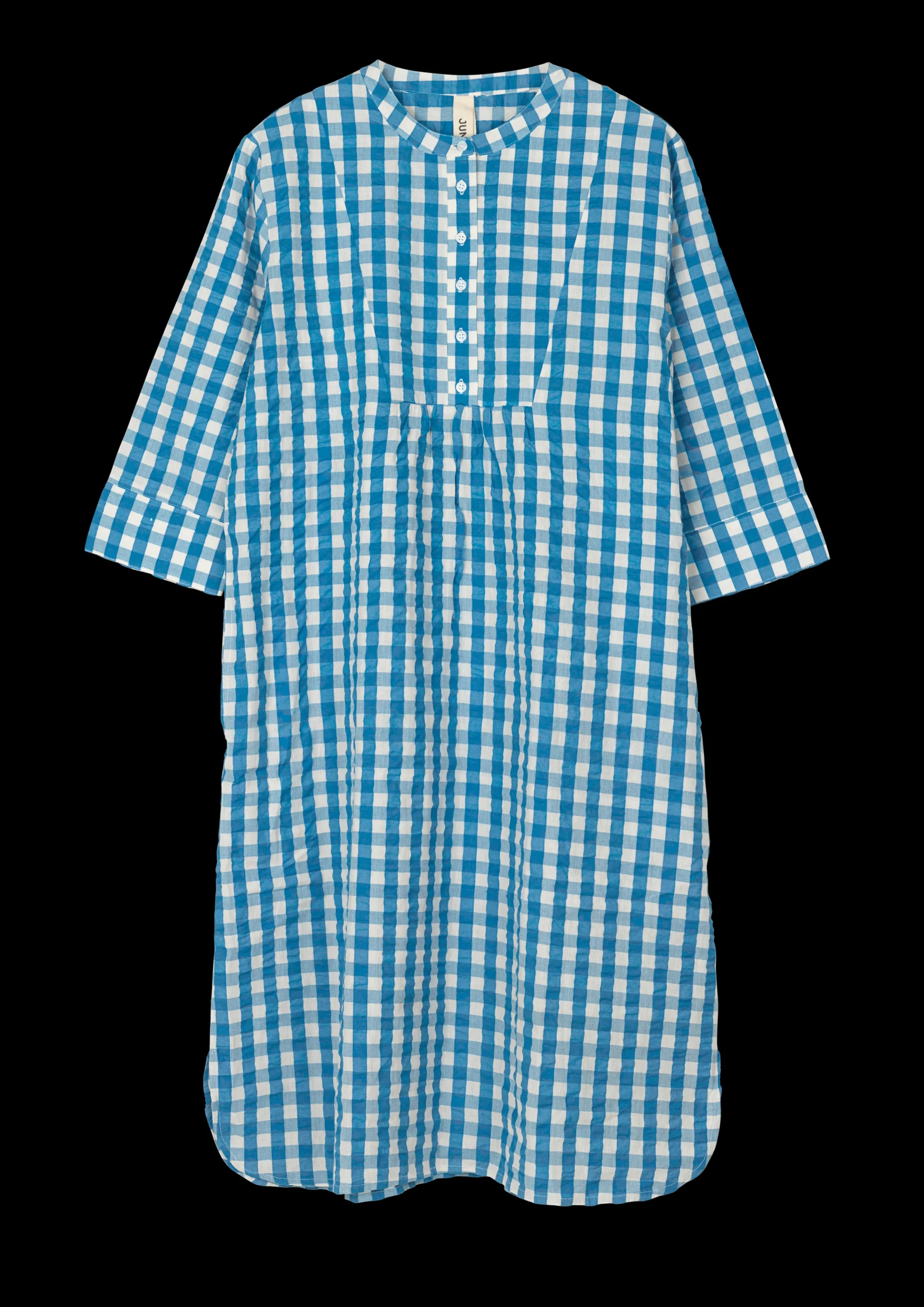 Juna Garderobe er fyldt med det fineste lette og luftige sommertøj, der både kan bruges som nattøj til de varme sommernætter og som en del af en casual sommergarderobe perfekt til lange sommerdage i haven, is på kajen og ture ud i det blå. Sonja kjolen i blå/birk ternet Bæku0026Bølge har en løs pasform og et behageligt snit, der gør den til den oplagte sommerkjole. Kjolen har den fine flæsedetaljer ved knapperne og feminine læg, der giver et let og elegant udtryk. Kjolen går cirka til knæene, har indvendige lommer i siderne og ¾-lange ærmer. Perfekt til både sommerfesten, strandturen og dagen i hængekøjen. Sonja kjolen i Bæk u0026 Bølge blå/birk er fremstillet i 100% økologisk bomuld, der både er OEKO-TEX®-mærket og GOTS-certificeret, produceres i overensstemmelse med EU standarder og tåler maskinvask op til 40°, hvilket ikke blot er skånsomt for miljøet, men også for tøjet, som får længere levetid ved den lavere temperatur. Bemærk, at dette produkt er stor i størrelsen.