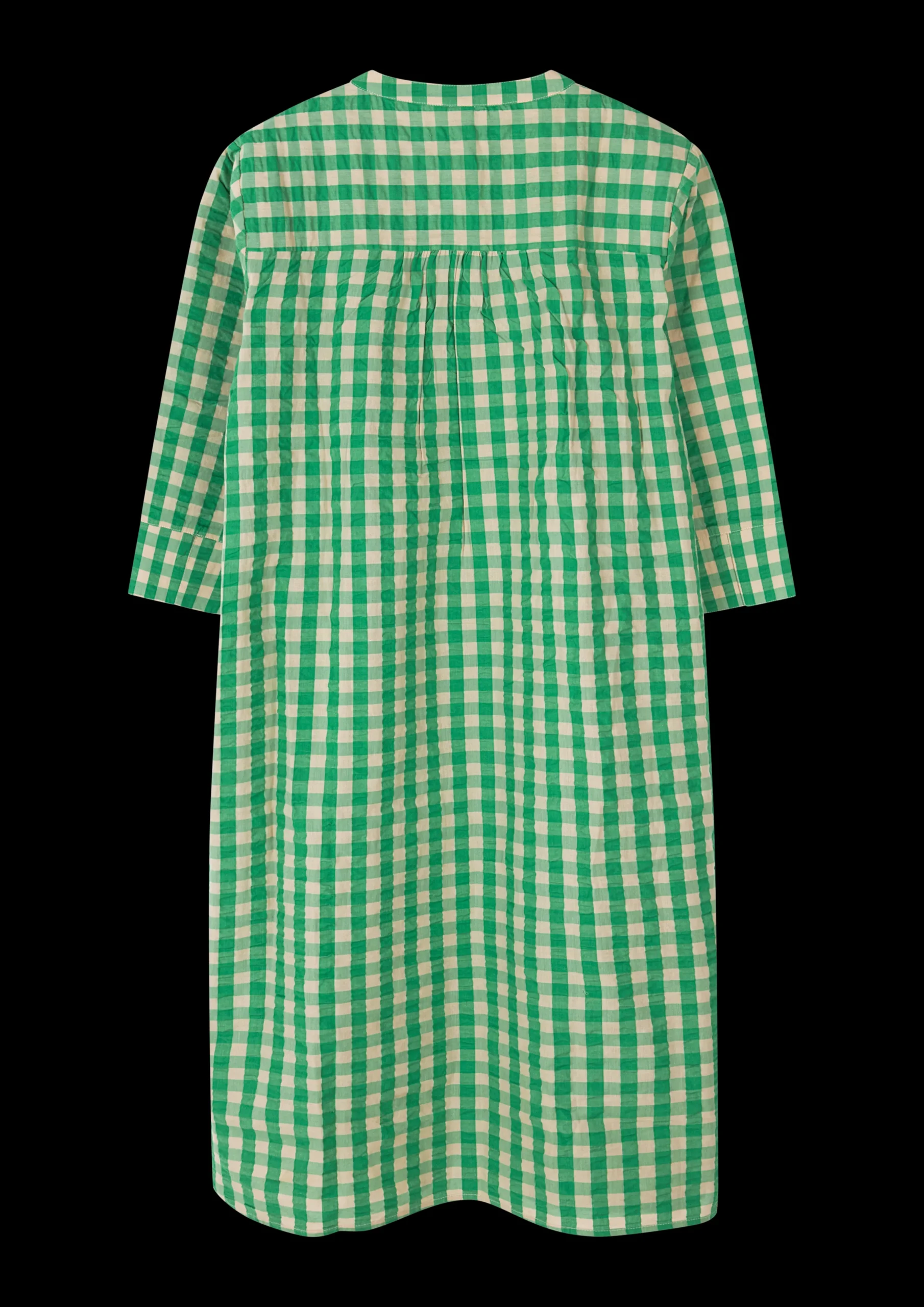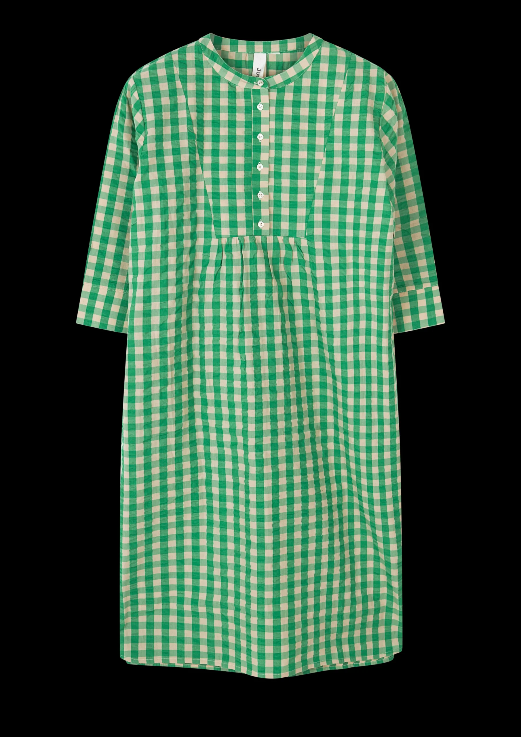 Juna Garderobe er fyldt med det fineste lette og luftige sommertøj, der både kan bruges som nattøj til de varme sommernætter og som en del af en casual sommergarderobe perfekt til lange sommerdage i haven, is på kajen og ture ud i det blå. Sonja kjolen i grøn/sand ternet Bæku0026Bølge har en løs pasform og et behageligt snit, der gør den til den oplagte sommerkjole. Kjolen har den fine flæsedetaljer ved knapperne og feminine læg, der giver et let og elegant udtryk. Kjolen går cirka til knæene, har indvendige lommer i siderne og ¾-lange ærmer. Perfekt til både sommerfesten, strandturen og dagen i hængekøjen. Sonja kjolen i Bæk u0026 Bølge grøn/sand er fremstillet i 100% økologisk bomuld, der både er OEKO-TEX®-mærket og GOTS-certificeret, produceres i overensstemmelse med EU standarder og tåler maskinvask op til 40°, hvilket ikke blot er skånsomt for miljøet, men også for tøjet, som får længere levetid ved den lavere temperatur. Bemærk, at dette produkt er stor i størrelsen.