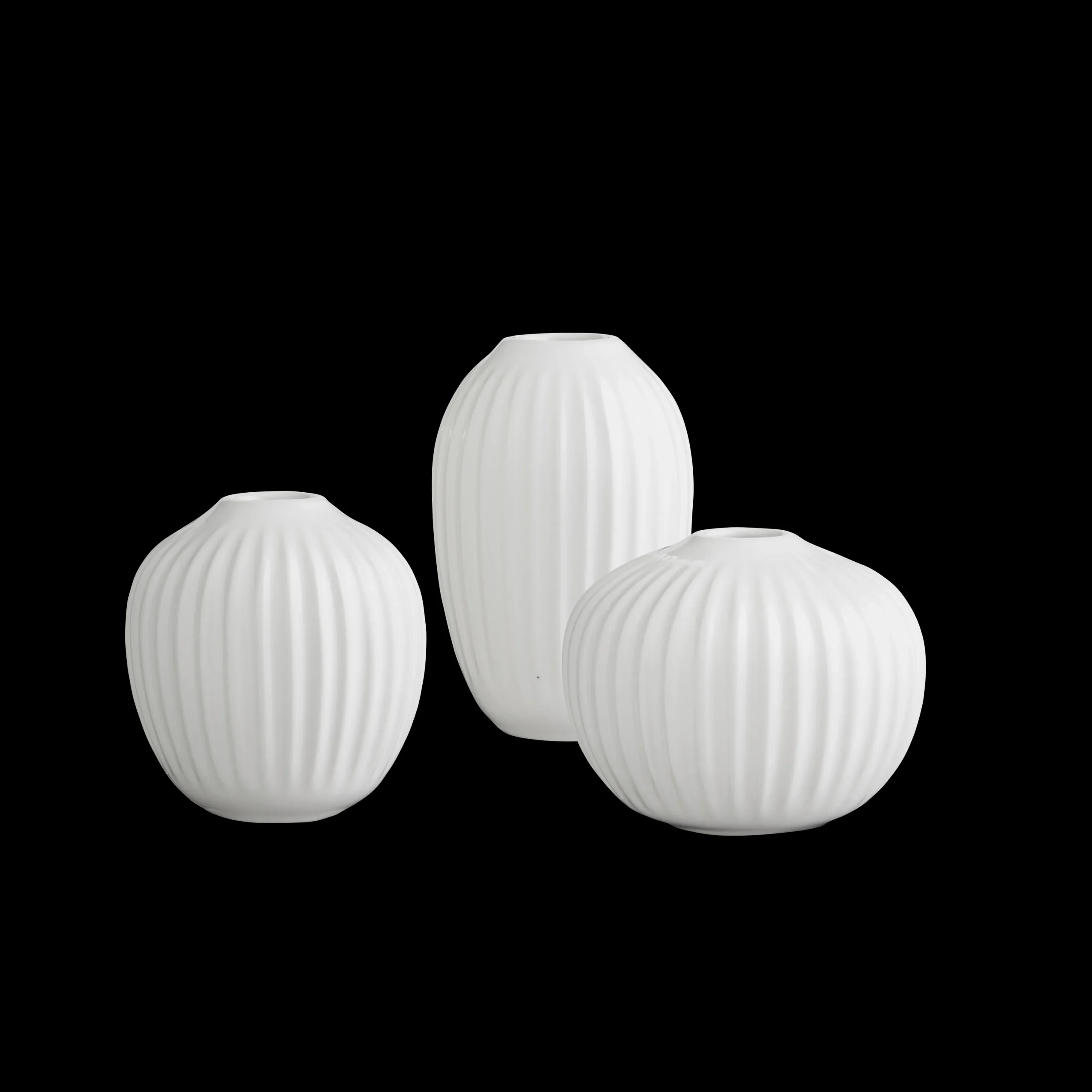Oplev de elegante Hammershøi-vaser i 3-pak i klassisk hvid. Brug de tre søde miniature-vaser som pynt i et skønt tableau eller på bordet fyldt med havens små blomster og friske grene. Miniature-vaserne er præget af de klassiske Hammershøi-riller, der er inspireret af den verdenskendte kunstner Svend Hammershøi, der havde sin gang på Kählers gamle værksted i Næstved.