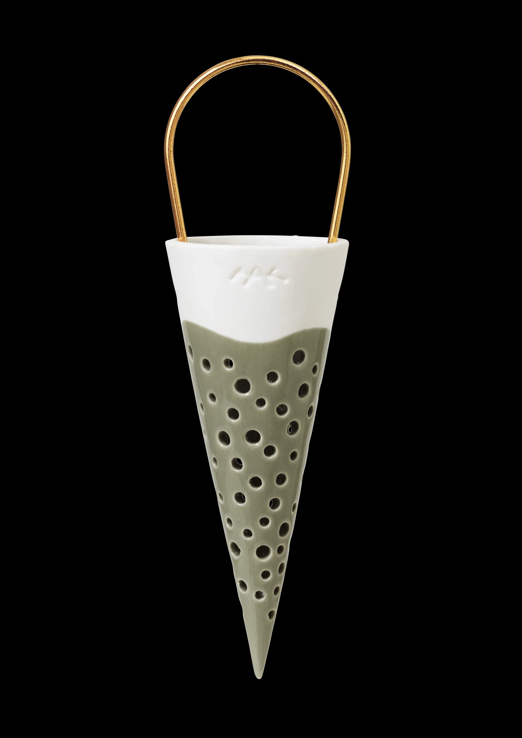 Den smukke Nobili juleserie er som skabt til at få julestemningen ind i stuerne på en moderne, diskret måde. I år tilføres serien to størrelser kræmmerhuse i snehvid og olivengrøn, i henholdsvis H14,5 cm og H18cm. Kræmmerhusene er fremstillet i benporcelæn med blank olivengrøn eller snehvid glasur m. blank guld metalbøjle og passer perfekt som pynt i alle julehjem. Kræmmerhusene er en videreførsel af Nobili juletræer, og har de mange håndskåret små dekorative huller. Kræmmerhusene er udelukkende til ophæng og dekoration. Kræmmerhus hører til på juletræet, og traditionelt skal det fyldes med godter, f.eks. pebernødder eller bolsjer. Kræmmerhuset hører til blandt de ældre former for juletræspynt, og hænger naturligvis sammen med tanken om at pynte træet med spiselige genstande. Designet af designduoen R7B – Mette Bache og Barbara Bendix Becker