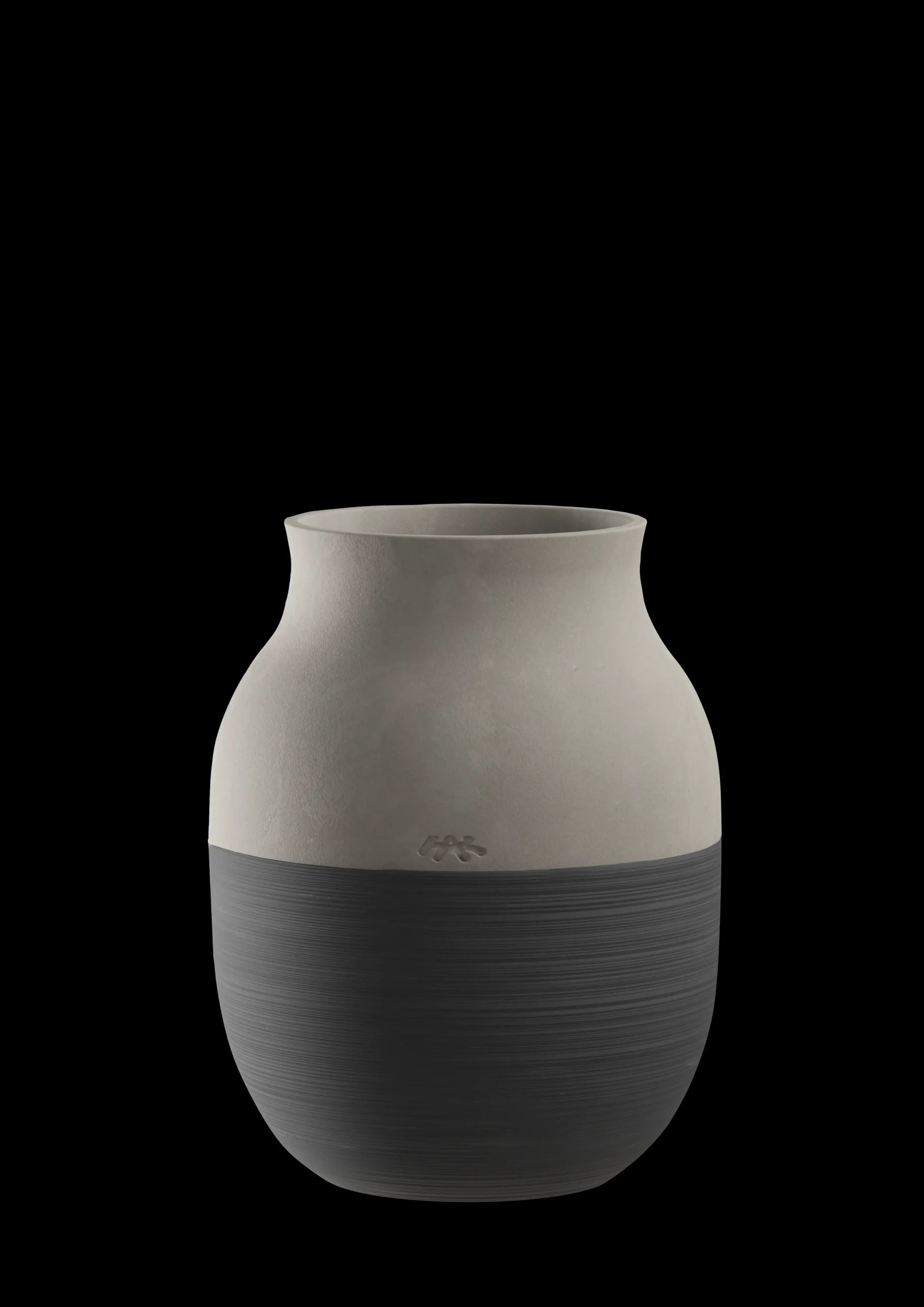 Den kendte og elskede Omaggio-vase fra Kähler er tilbage i en version produceret af restmaterialer fra tidligere produktioner, der ellers ville være gået til spilde. Under titlen Omaggio Circulare er det nye, spændende materialevalg med til at give den populære vase et nutidigt og fremsynet perspektiv med fokus på at reducere miljøpåvirkningen. Formen er som vi kender den med de bløde, organiske linjer, der kendetegnede den moderne Kähler-klassiker skabt i samarbejde med designerne Ditte Reckweg og Jelena Schou Nordentoft, der sammen designer under navnet Stilleben. De formgav Omaggio-vasen tilbage i 2007. I 2024-udgaven har de givet den et helt nyt udtryk, når de med deres innovative tilgang til design sætter de cirkulære materialer på dagsordnen med Omaggio Circulare. Ligesom de to øvrige vaser i serien har den mellemstore vase på 20 cm et raffineret todelt design med en rå top i en naturlig grå, der har taget farve efter de genanvendte materialer, og en håndmalet antracitgrå, der lægger sig smukt på den nederste halvdel af vaserne og skaber tyngde og kontrast. Alle dele i Omaggio-serien er designet til at passe sammen indbyrdes, og det giver et interessant og dekorativt udtryk, når de nye Omaggio Circulare-vaser sættes sammen med andre Omaggio-vaser, urtepotter og lysestager i forskellige størrelser og farver – nogle måske helt uden blomster, planter og lys så designets skulpturelle linjer får lov at tale for sig selv.
