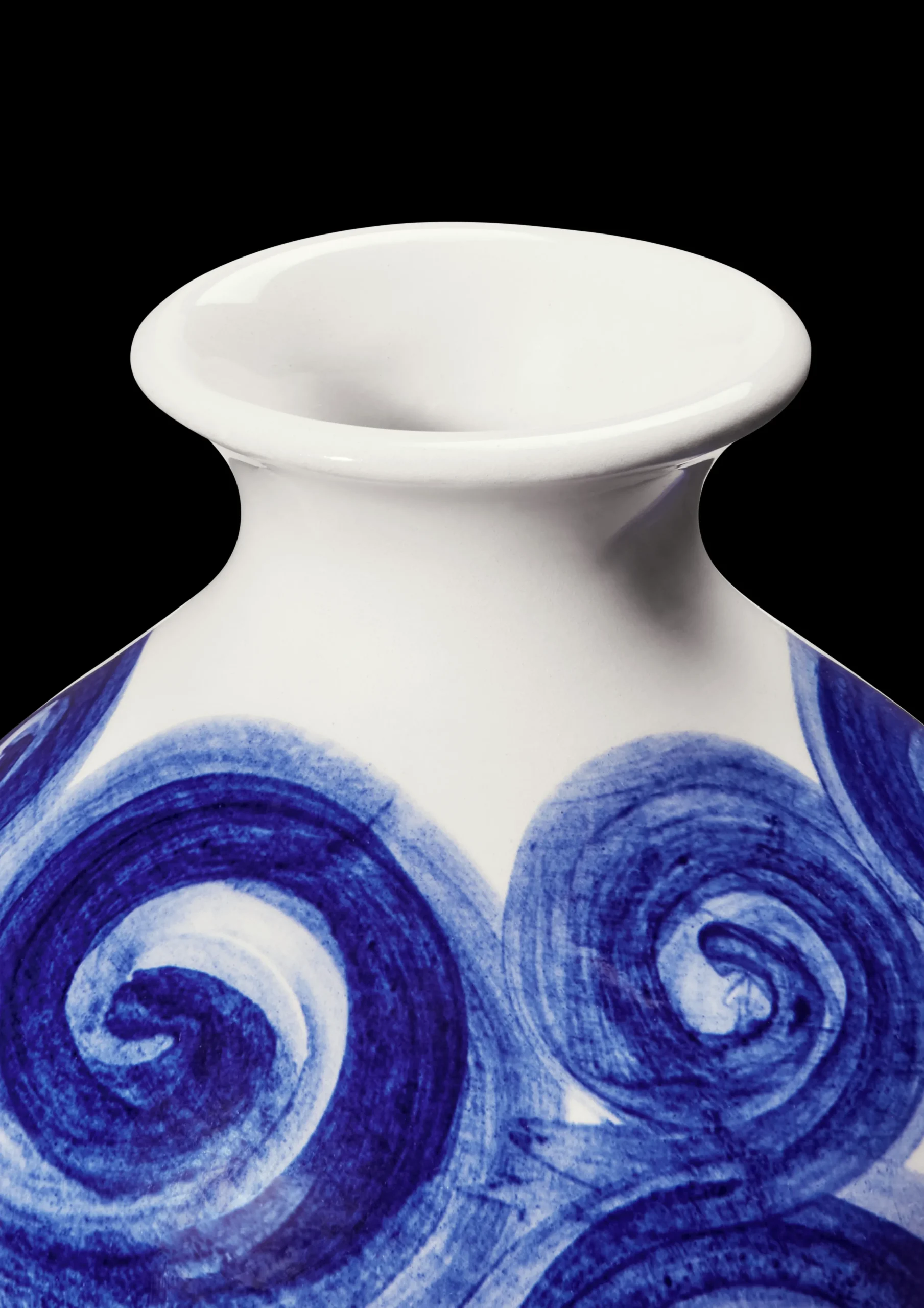 Med vaseserien Tulle hylder Kähler nostalgien og romantikken med håndmalede dekorationer inspireret af de ældre Kähler-vaser. Den lille Tulle-vase på 10 cm i højden og 9,5 cm i diameter er håndmalet og skabt i hånden. Vasen har en cremehvid bundfarve og er malet med snørkler og spiraler i en koboltblå lerfarve, der efterfølgende er glaseret. Selve halsen på vasen er holdt fri for de blå penselstrøg og står derfor enkel og ren i sit udtryk. Vasen er skabt i et lækkert autentisk og kunstnerisk udtryk i en moderne kontekst i en lille størrelse, hvor der til gengæld er blevet leget med at skabe ekstra dybde og liv gennem dybe og fyldige glasurer med oprindelse i det gamle Kähler-værksted. Det er en af dygtigste malerdamer fra dengang, Tulle Emborg, der nu får æren af at lægge navn til Tulle-serien. Og du kan både se og føle, at der er et menneske bag, der har gjort sig umage med at male vasen i hånden for at skabe et ekspressivt og levende udtryk. I dekorationerne fornemmer du også tydeligt den kunstneriske forståelse og de intuitive bevægelser, der gør Tulle-vasen til et lille kunstværk i sig selv og tilfører den en helt særlig nostalgisk au-tenticitet. De runde former skaber en skulpturel og grafisk silhuet, så vasen også sagtens kan stå alene uden blomster som en del af en både romantisk og moderne indretning.nnu003cpu003eNår du køber din Tulle-vase på Rosendahl.com, får du en mulepose til en værdi af 129 kr. med i købet. nnu003cpu003eMuleposen fås kun på Rosendahl.com.nnu003cpu003eFor at keramikken kan ånde, skal den opbevares og tørre med bunden i vejret, da den ellers kan afgive fugt på grund af vandabsorbering.nVi anbefaler altid at sætte møbelsko under vaser og urtepotter for at forhindre kondensvand, som kan være årsag til fugtpletter på underlaget.