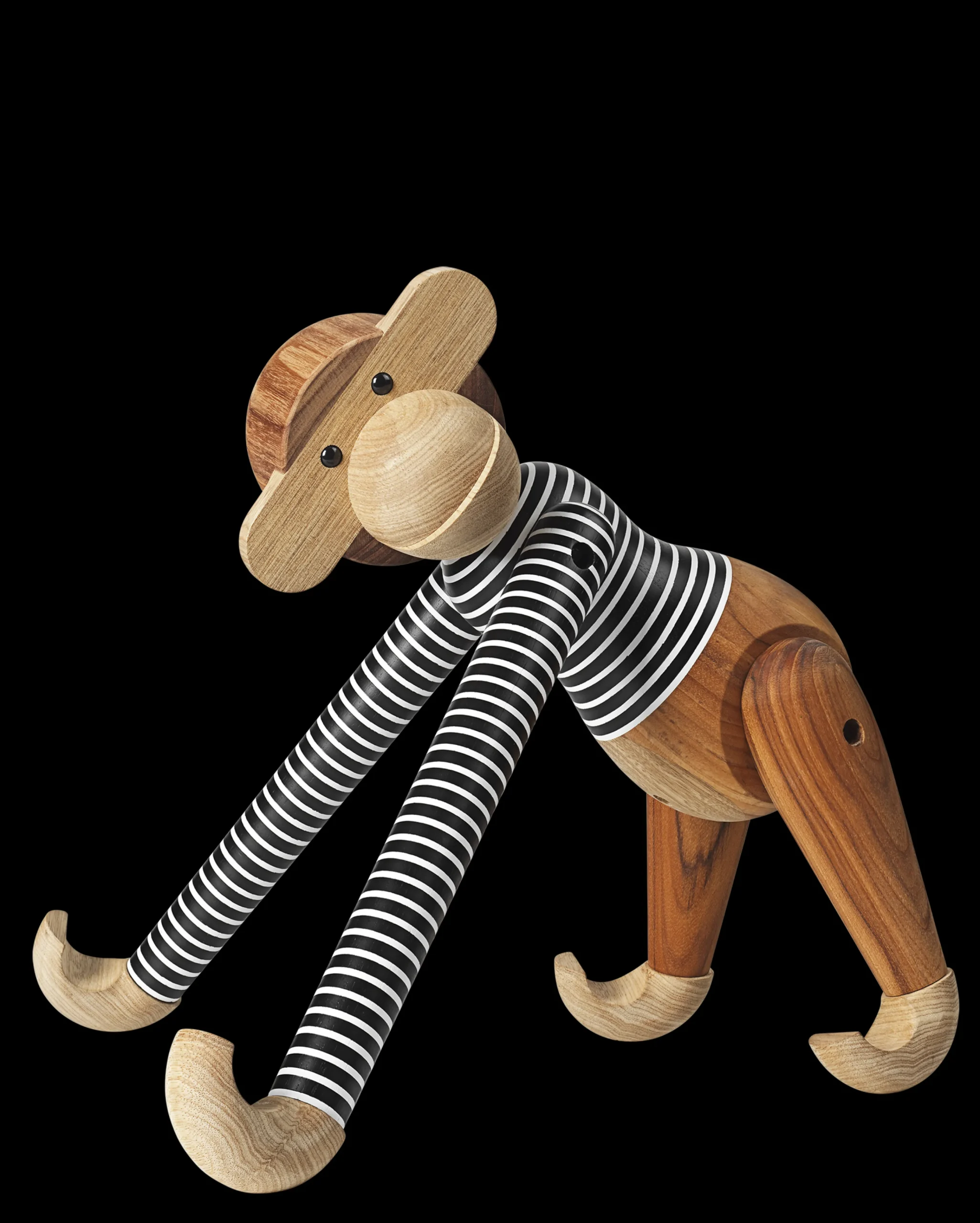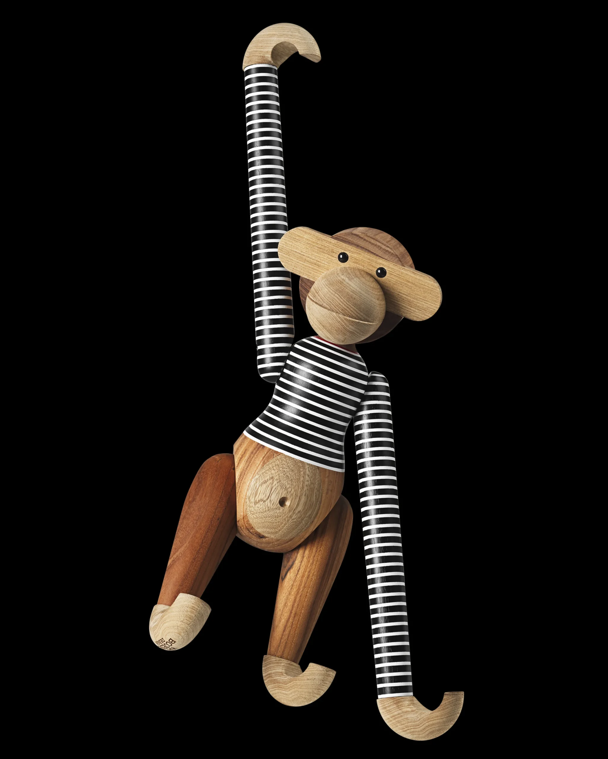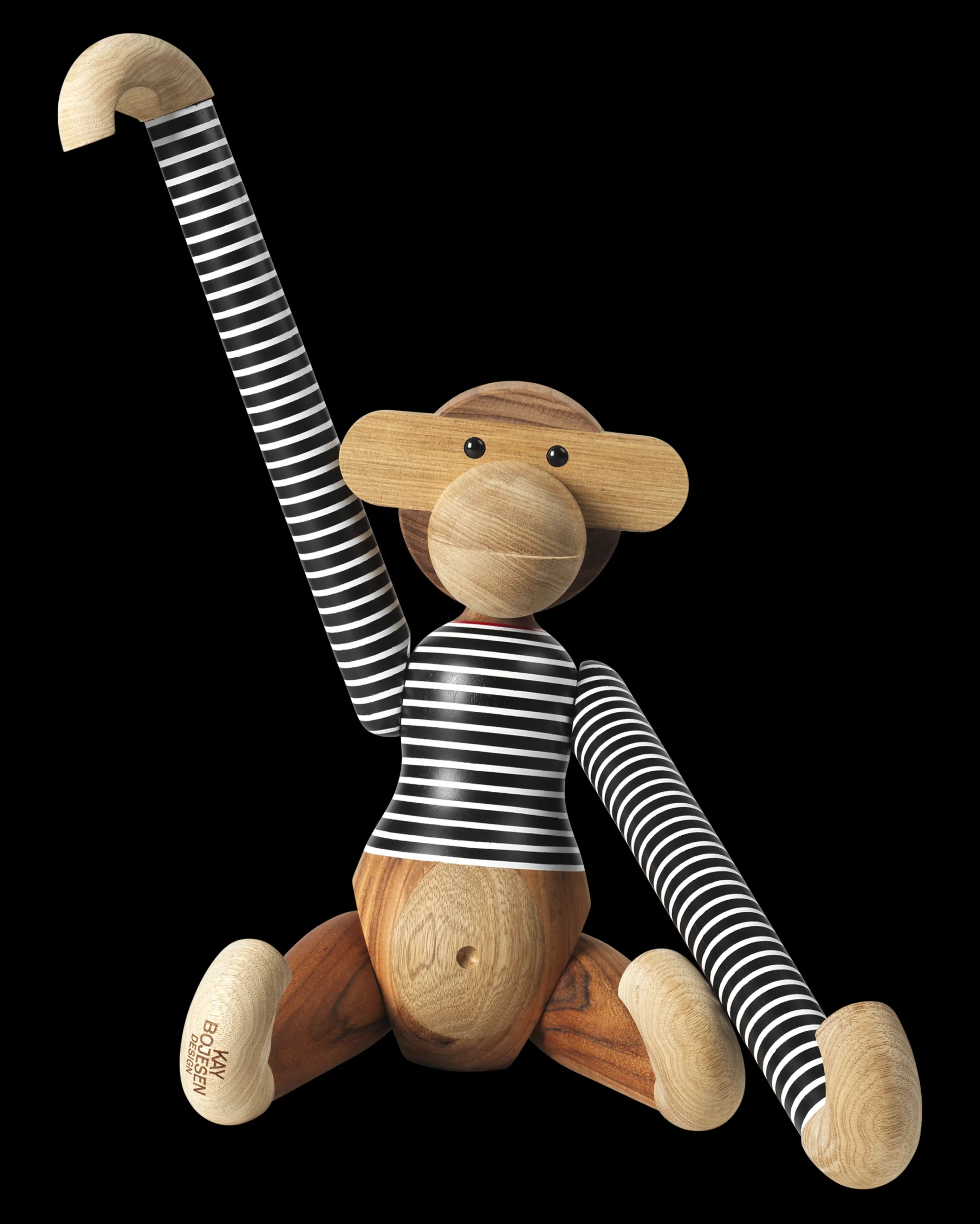 To af de mest ikoniske pejlemærker i dansk designhistorie er gået sammen for at hylde de smilende linjer og glade striber, de hver især har bidraget med til dansk design. Den berømte Kay Bojesen Abe blev skabt tilbage i 1951, da Kay Bojesen ville lave en knage i børnehøjde, så hans børn kunne nå tøjet, men i stedet endte han med at lave et verdenskendt dansk designikon. Nu har den ikoniske Abe selv fået tøj på. Og hvad klæder bedre et dansk designikon end et andet dansk designikon? Den store Kay Bojesen Abe x Nørgaard paa Strøget er fremstillet i FSC®-certificeret teak og limba og måler 47 cm i højden. Du kan få Aben med den flotte påmalede Nørgaard paa Strøget #101 T-shirt i enten denne sort med hvide striber eller hvid med sorte striber. Begge farvevarianter er med den velkendte røde halskant, du kun finder på #101 T-shirts i den eksklusive Nørgaard paa Strøget-version i butikken på Amagertorv i København. Kay Bojesen er synonym med original dansk formgivning og design. Og samarbejdet med Mads Nørgaard binder kærligheden til holdbare og varige produkter sammen og tilføjer samtidig netop den leg og finurlighed, som Kay Bojesen selv elskede at tilføje til sine designs for at sætte fantasien i gang og skabe originale fortællinger i træ. Den ikoniske Abe i nye klæder er en sjov og uhøjtidelig fejring af begge designikoner, hvor vi med et glimt i øjet i fællesskab hylder humoren og de smilende linjer med farver og striber, der trækker tråde langt ind i dansk designhistorie.u003cbru003eDer kan opleves variation i striberne, hvilket betyder, at hver abe sin helt egen unikke personlighed. Det skyldes, at striberne bliver omhyggeligt påført hver enkelt Abe x Nørgaard på Strøget gennem en håndholdt proces.