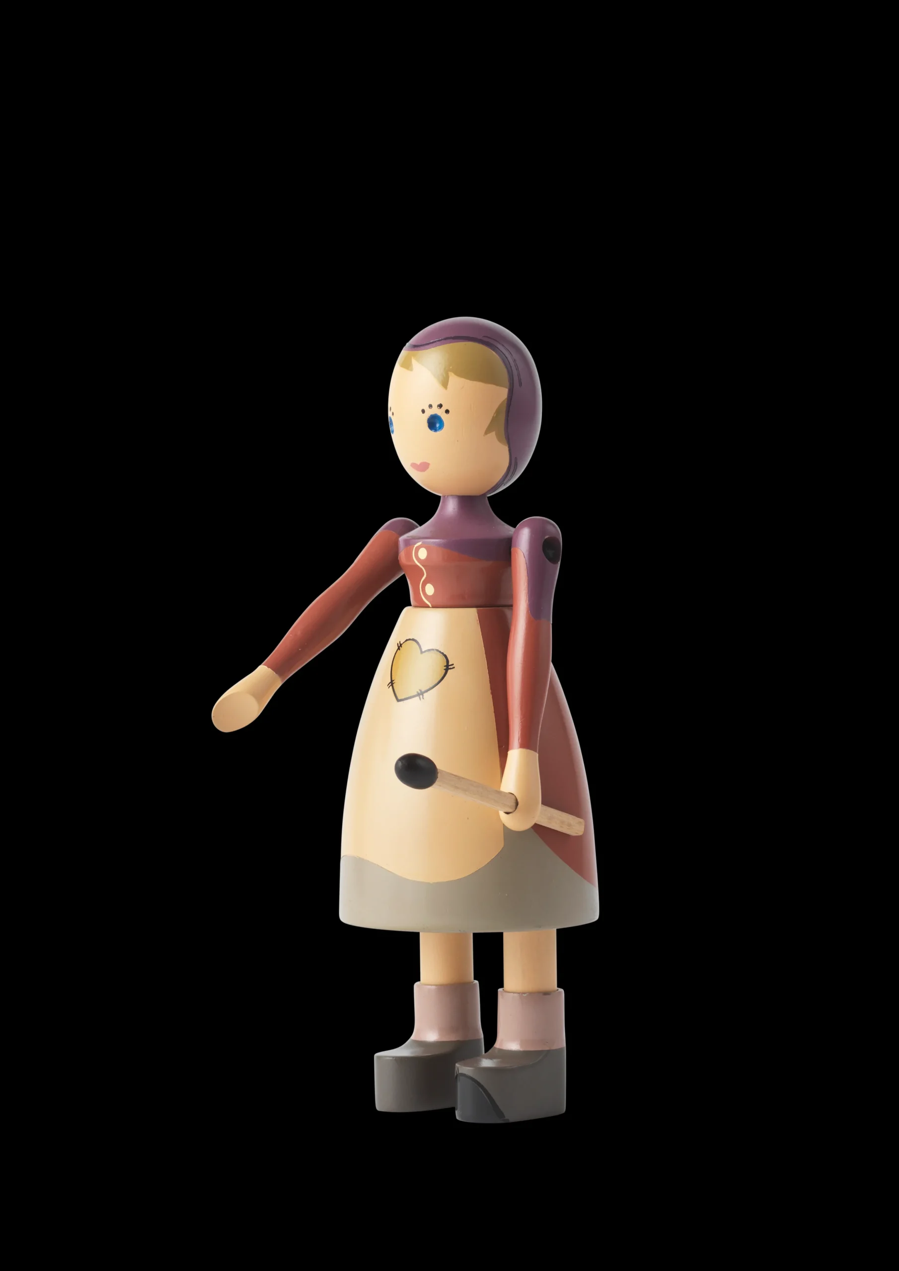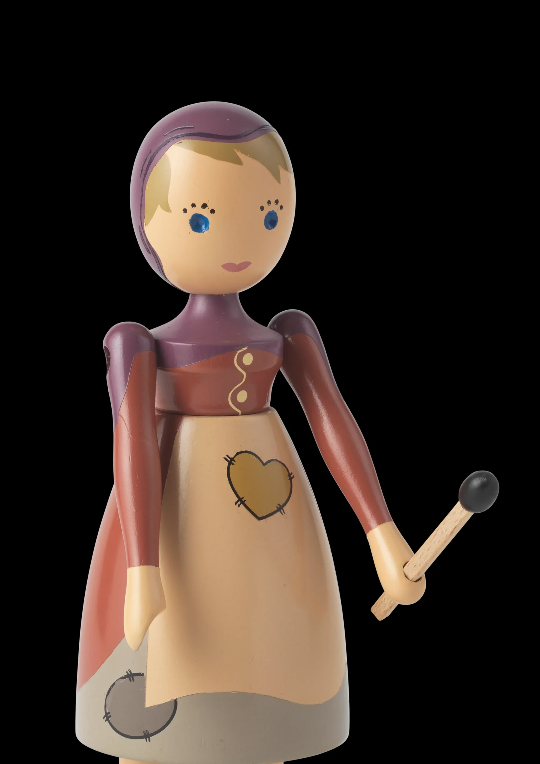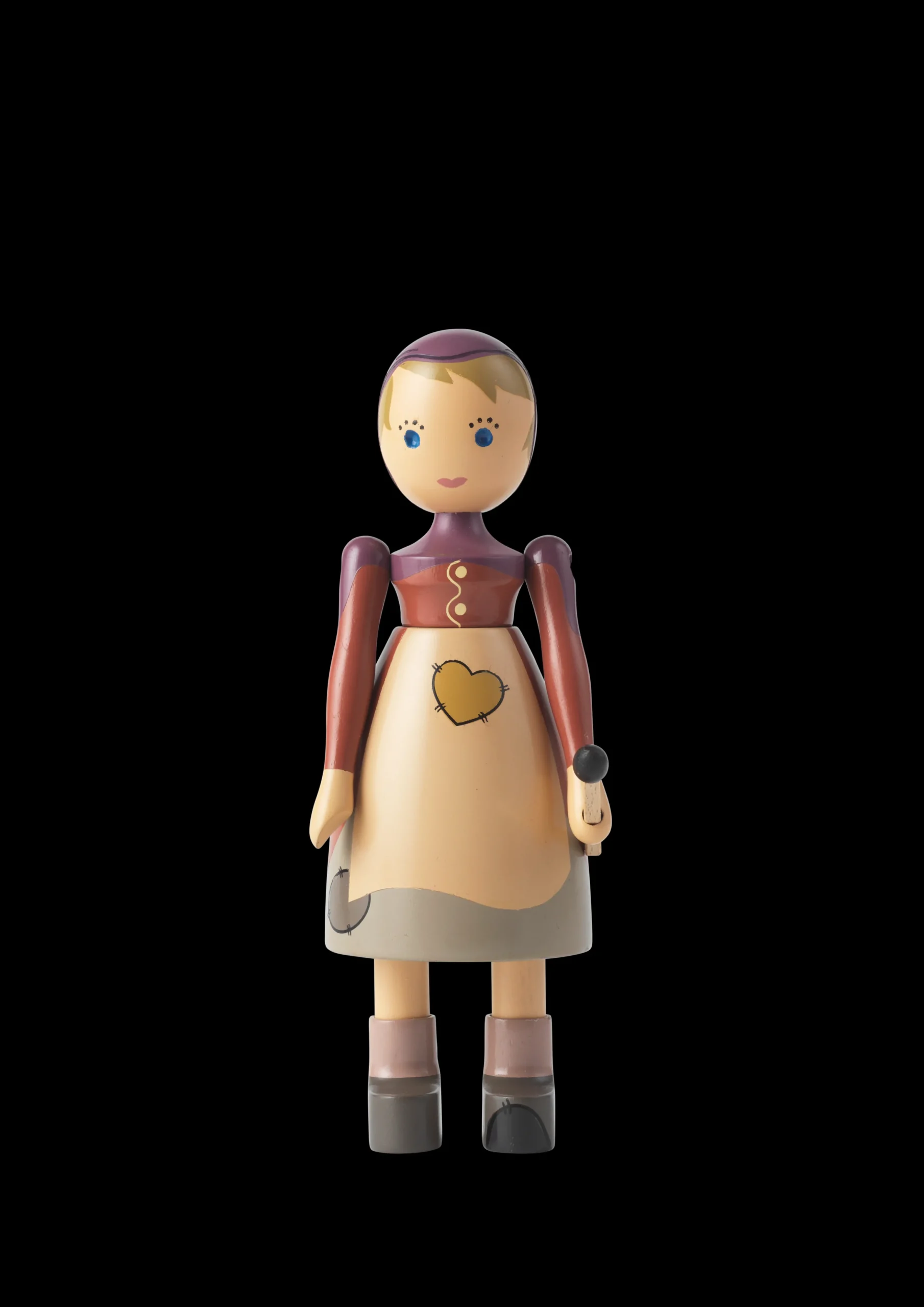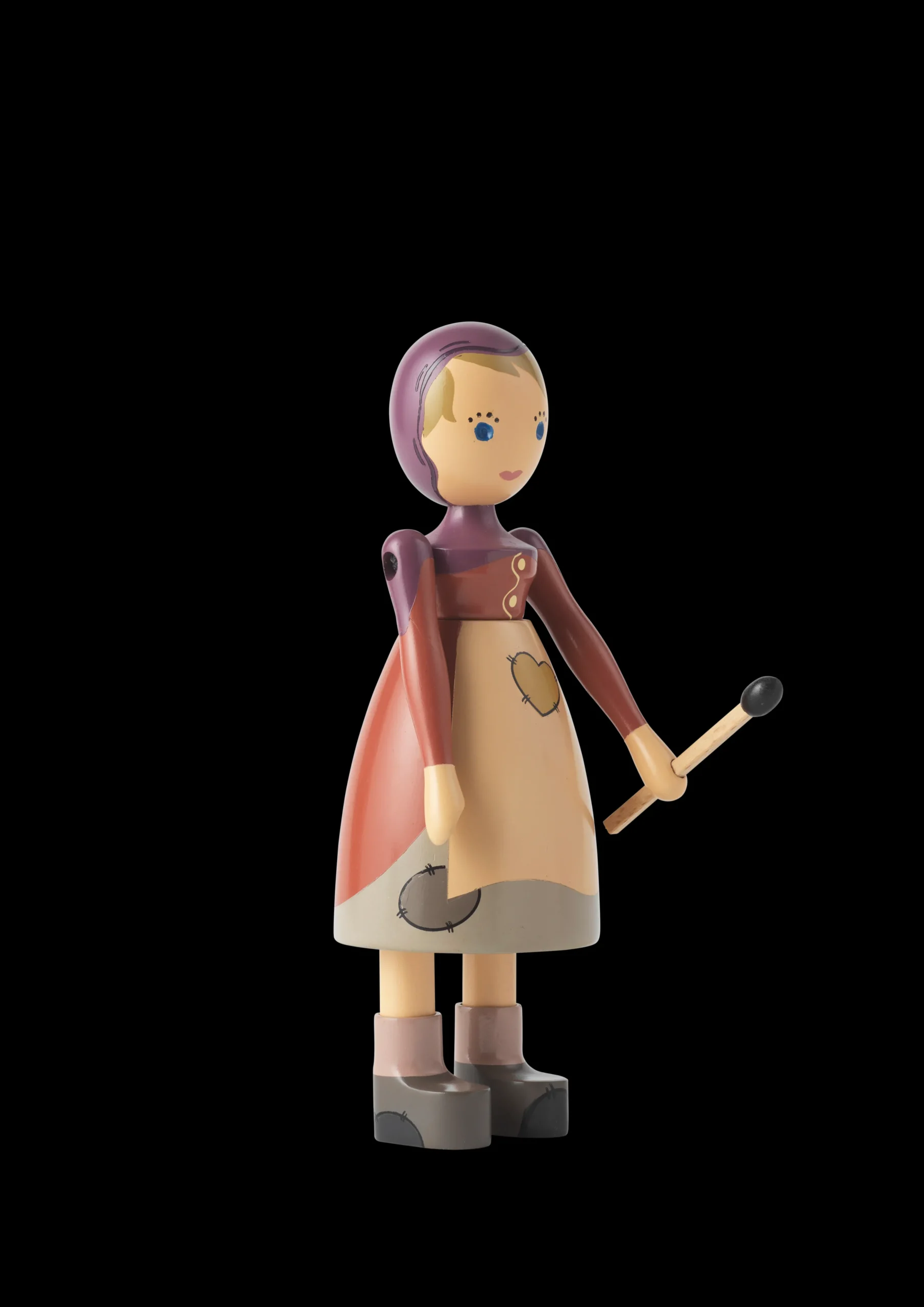 Lad eventyret leve videre gennem originale fortællinger i træ. I Odense åbnede i 2021 museet H.C. Andersens Hus, og i den forbindelse indledte museet og Kay Bojesen Danmark et samarbejde, så det nu ville være muligt at finde nogle af de mest kendte og elskede figurer fra de verdensberømte eventyr fortolket i Kay Bojesens univers af originale fortællinger i træ. Nattergalen, Hyrdinden u0026 Skorstensfejeren og Ole Lukøje var de første til at flytte ind på hylderne i museumsbutikken i Odense – og selvfølgelig også i din lokale designbutik. Og nu har Den lille Pige med Svovlstikkerne også fundet ind i varmen. I Kay Bojesens fortolkning er hun iklædt en hætte, der går ned over skuldrene. Hun har lapper på kjole og forklæde, som er holdt i nedtonede farver, der understreger, at den lille pige kommer fra fattige kår. Hendes lune smil og milde og uskyldige udtryk er affødt af de smukke oplevelser, hun ser for sit indre blik i lyset fra flammerne, hvor hun en kold nytårsaften får vækket fantasien med nogle fantastiske drømmesyn fyldt med glæde og tryghed. I hånden holder hun en svovlstik, der fuldender fortællingen. Den Lille Pige med Svovlstikkerne måler 14,5 cm i højden og er drejet i FSC®-certificeret bøgetræ, og den manuelle produktion med maling og tryk er udført med den store præcision og omhyggelighed, der kendetegner træfigurerne fra Kay Bojesen. Formen er baseret på den originale Lise-figur fra Kay Bojesens arkiv, der er enkel og minimalistisk, men fuld af liv og sjæl. Det giver Den Lille Pige med Svovlstikkerne den følelse af magi og eventyr, der er i tråd med Kay Bojesens ånd og den historiefortælling, han formåede at skabe, når han designede sine fantasifulde figurer.