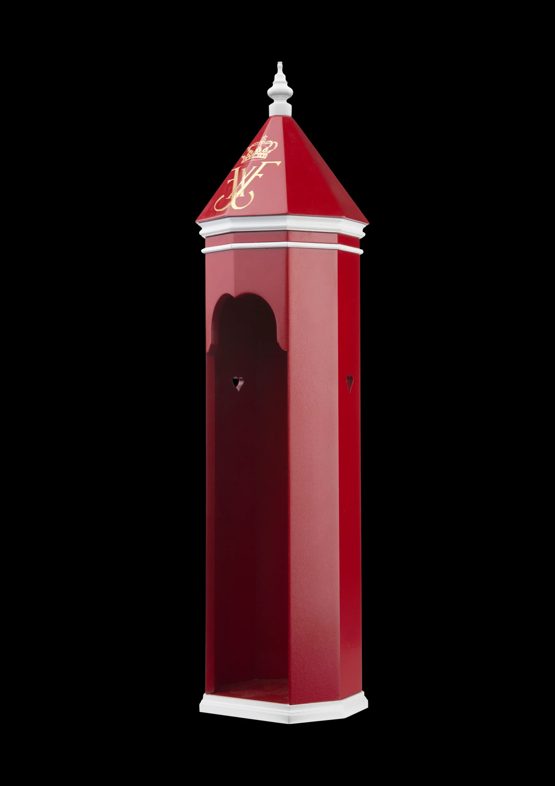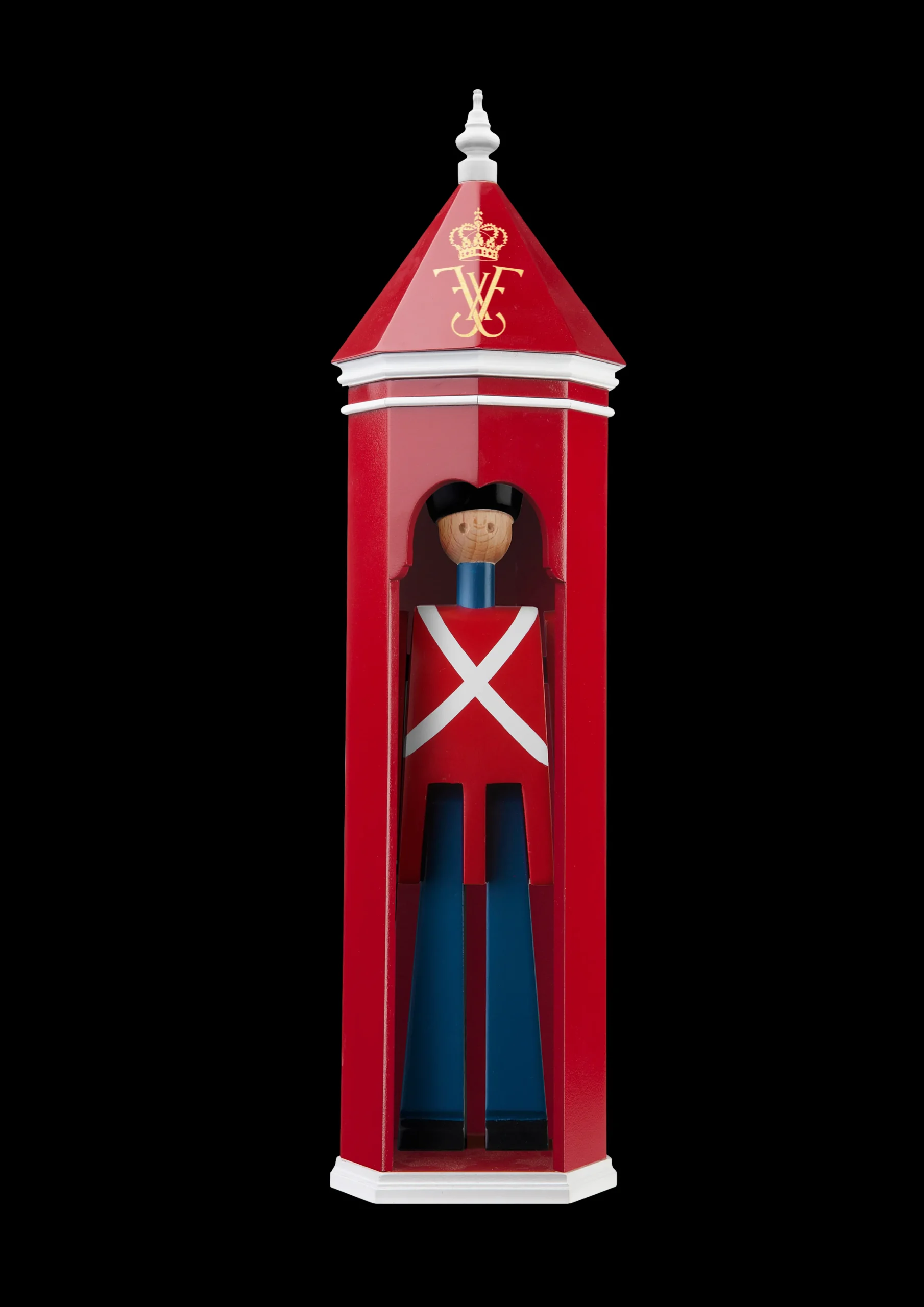 Giv dine gæster en royal velkomst med det flotte skilderhus i træ til de fine gardere fra Kay Bojesen. Kay Bojesen kunne som ingen anden skabe originale fortællinger i træ. Han kunne få træet til at leve, og det gør det hele vejen igennem serien af træfigurer – den ene mere ikonisk end den anden. Dette unikke skilderhus er som alle de berømte Kay Bojesen-gardere inspireret af et af Danmarks nationalsymboler fra Amalienborg Slotsplads. Kay Bojesen skabte garderne for første gang i 1940 i anledningen af Kong Christian X’s 70-årsfødselsdag som en hyldest til den danske konge, og med det nye skilderhus kan du både fejre dine fødselsdage derhjemme med manér og hylde den nye Kong Frederik X. Skilderhuset måler 36 cm i højden og er nedskaleret efter originale tegninger af Forsvarets skilderhuse. Den Kongelige Livgarde har stået vagt ved de danske slotte siden 1658, og nu kan du give din garder husly med det smukt udførte skilderhus i FSC®-certificeret træ, der er malet i de traditionelle røde og hvide farver og dekoreret med det kongelige monogram i guld.