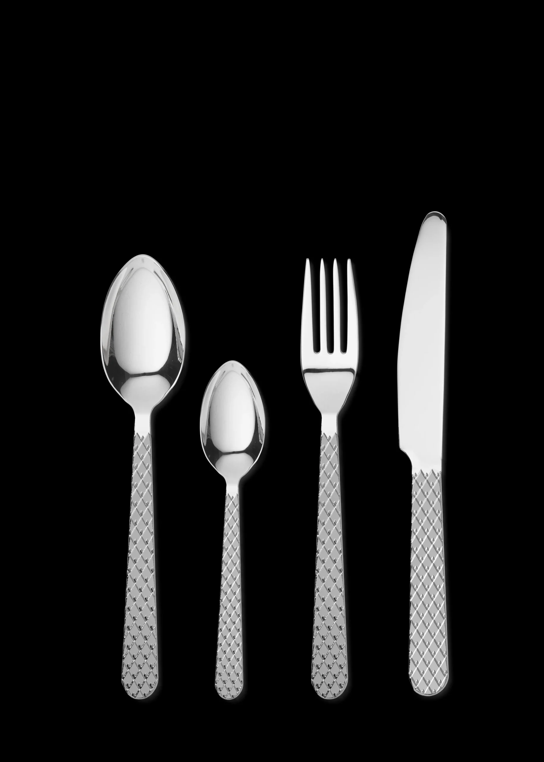 Skab samhørighed i din borddækning med den ikoniske Rhombe-signatur. Med Rhombe-bestiksættet fra Lyngby Porcelæn kan du nu få en unik helhed på tværs af alle Rhombe-serier og nyde den ekstra dybde og taktilitet, som et smukt bestiksæt i 100% genanvendt stål tilfører med sine stilrene linjer til perfektion. Hvert enkelt stykke bestik er skabt til at harmonere med detaljerne i porcelænet, så du har muligheden for at skabe præcis den følelse af luksus, der gør hvert måltid til en sublim sanseoplevelse – komponere dit eget personlige mesterværk til at fejre alle de små øjeblikke og forvandle hverdagen til noget særligt og til at gøre hver festlig sammenkomst uforglemmelig med en fuldendt stil og finesse. Kniv, gaffel, ske og teske. Fire stk. af hver. Og det velkendte grafiske Rhombe-udtryk går selvfølgelig igen på alle 16 dele i det nye bestik, hvor mønsteret ligger på skaftet og er hævet som et lavt relief, præcis som du kender det fra seriens steldele. Det er ikke kun smukt og stilfuldt, men sikrer dig også en udsøgt taktil fornemmelse i hænderne, når du holder bestikket. Du får med Rhombe-bestiksættet et strømlinet og eksklusivt design, der indbyder til, at du griber om bestikket og mærker reliefferne i hånden. Og samtidig forlænger det smukt og stilfuldt Rhombe-mønsteret ud på bordet. Den blanke finish på alle dele i bestiksættet er med til at forstærke den visuelle dybde i Rhombe-mønsteret, der med det samme fanger øjet og giver et helt unikt visuelt blikfang, du kun kan få med det originale Rhombe-design. Med en flot finish og et lille diskret logo præget i det i polerede stål matcher det både det klassiske hvide Rhombe-stel, Rhombe Earth-kollektionen og Rhombe Color-delene, og vil som noget helt nyt bidrage med at udvide hele Rhombe-seriens mange porcelænsdele med et nyt lækkert og naturligt materiale, der lader det diskrete mønster træde frem på en ny måde – og hvor kontrasten mellem det bløde formsprog og den stramme Rhombe-reflief trækker mønsterets former endnu mere tydeligt frem og skaber fokus.