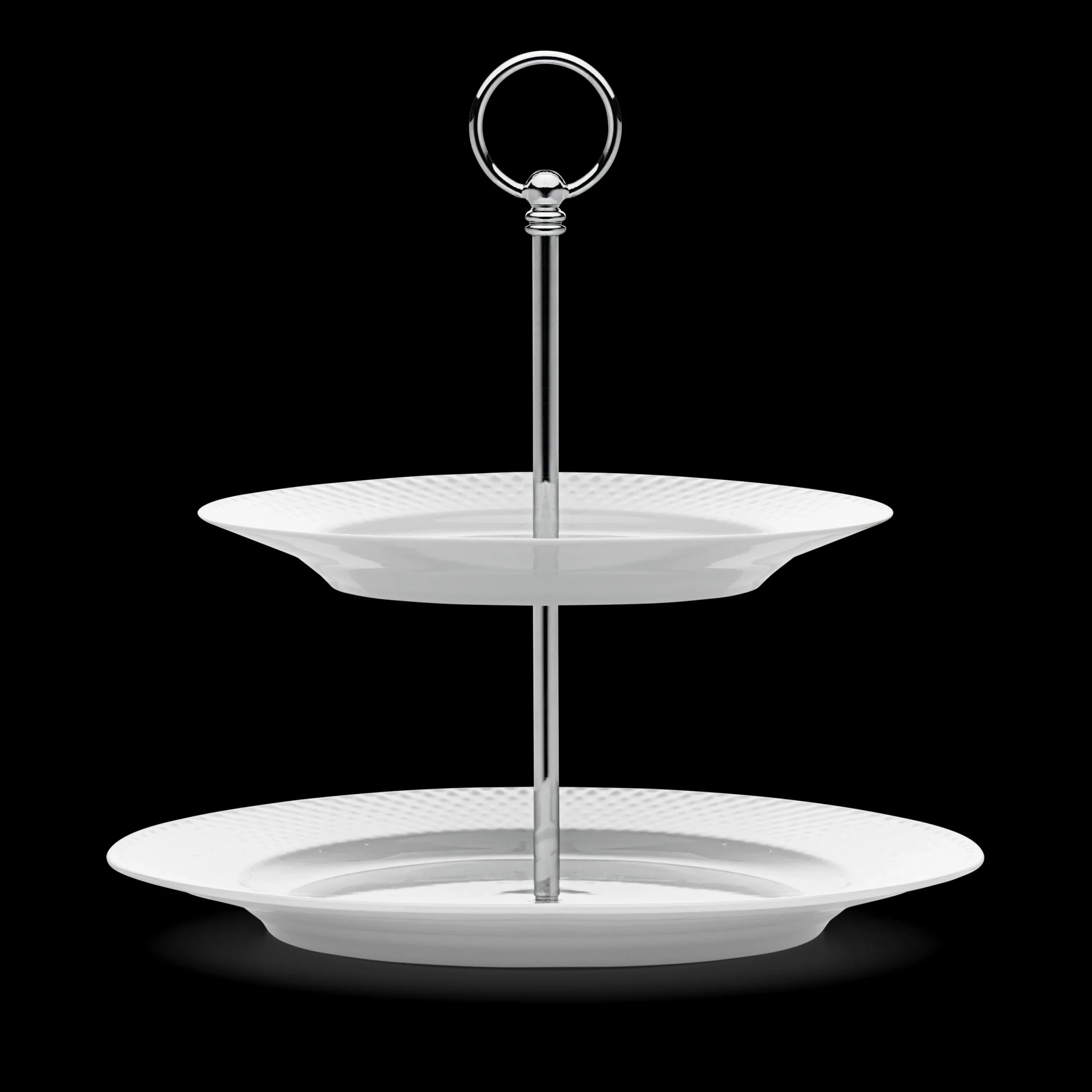 Kageopsatsen, eller den såkaldte etagere, fra Lyngby Porcelæn er udsmykket med det unikke Rhombe-mønster. Kageopsatsen har to opsatser på henholdsvis 23 cm og 27 cm i diameter, og du får således masser af plads til kreativ og elegant servering. Opsatsen er produceret i hvid, blankglaseret porcelæn, og det enkle og klassiske udtryk gør den egnet til brug både i hverdagen og til fest. Inspirationen til Rhombe-mønstret er hentet i Lyngby Porcelæns designarkiver og er oprindeligt blevet brugt på produkterne i Danild-serien fra 1961. Her blev mønstret påført produkterne som decal, imens mønstret, på produkterne i Rhombe-serien, er brugt som relief. Således er designet og mønstret ikke helt identisk, hvilket gør Rhombe-serien til helt sin egen. Rhombe kageopsatsen har 2 års brudgaranti.