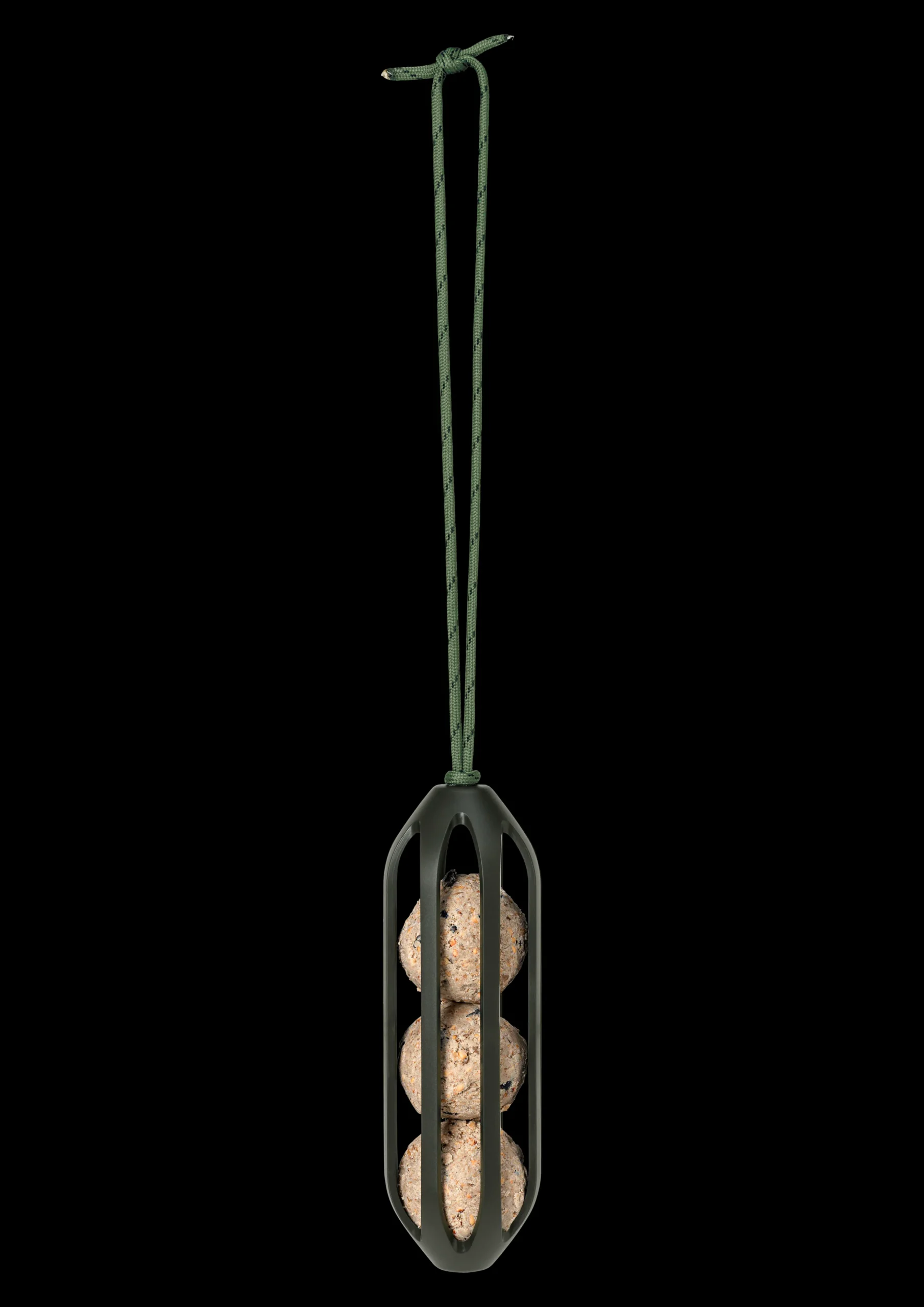 Rosendahl Birds skaber liv og fuglesang i haven, byd vinterens småfugle velkommen med god grøn samvittighed. Birds Fedtkugleholder er skabt i 100% genanvendt plast, og snoren er lavet i genanvendt PET, den fungerer både som ophæng og lås, ved at trække let i snoren får man adgang til at genopfylde holderen. Den fås i en afdæmpet farveskala, så den falder godt ind i havens naturlige miljø. Den er brud- og frostsikker. Birds recycled er skabt med ambitionen om at gøre ansvarligt produceret design tilgængeligt for alle. Birds er fremstillet i Danmark af genanvendt plast indsamlet fra danske husholdninger, forarbejdet og produceret i Danmark. Der findes flere produkter i serien, her ses Mejsekugleholder.