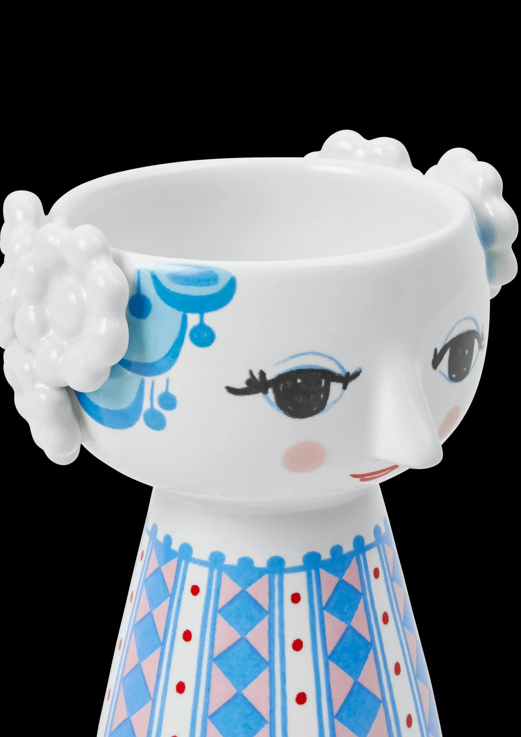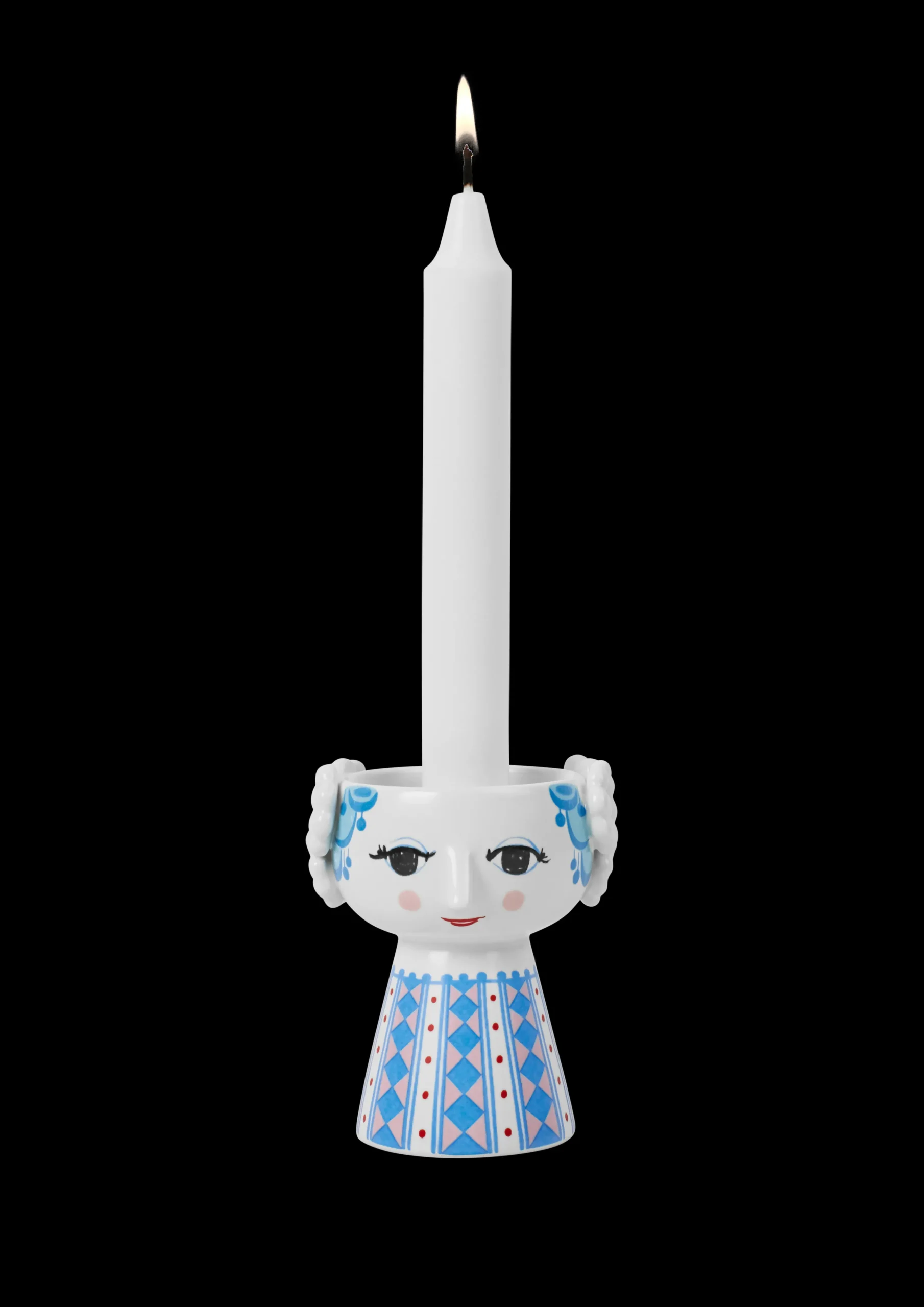 Bjørn Wiinblads stil er alt andet end minimalistisk. Den er overdådig, finurlig, vidunderlig – og stærkt defineret af levende farver og et unikt look. Du finder også mange af hans skæve og kunstneriske dekorationer på Eva-lysestagerne fra Bjørn Wiinblad. Designet er et sandt sammensurium af farver og geometriske former med en håndtegnet fornemmelse, der på en eller anden måde passer perfekt sammen. Og med denne smukke Eva-lysestage fra Bjørn Wiinblad med en dejlig blå nuance skaber du finurlighed i fuldt flor overalt i hjemmet. Lysestagen er 9,5 cm høj og har en diameter på 8 cm. Den er dekoreret med blåt hår og en farverig kjole med et flot diamantmønster i blå og lyserøde nuancer suppleret med rækker af røde prikker. Eva-lysestagen emmer af kærlighed til overdådighed og er perfekt til både fyrfadslys og stearinlys – eller helt alene som et lille skulpturelt indslag i indretningen. En Eva-lysestage pynter og skaber glæde både på bordet og på hylden, hvor den lyser op og gør hverdagen lidt mere farverig – præcis som Bjørn Wiinblad elskede det. Bjørn Wiinblad var en livsglad kunstner med en stor og farverig personlighed, der gik sine egne veje og ikke var bange for at drømme og tænke stort. Den sjæl mærkes også i Eva, der hviler i sig selv og inviterer os til at udtrykke vores egen stil og personlighed i indretningen. En ting er sikkert: Det bliver ikke kedeligt, når Eva flytter ind.