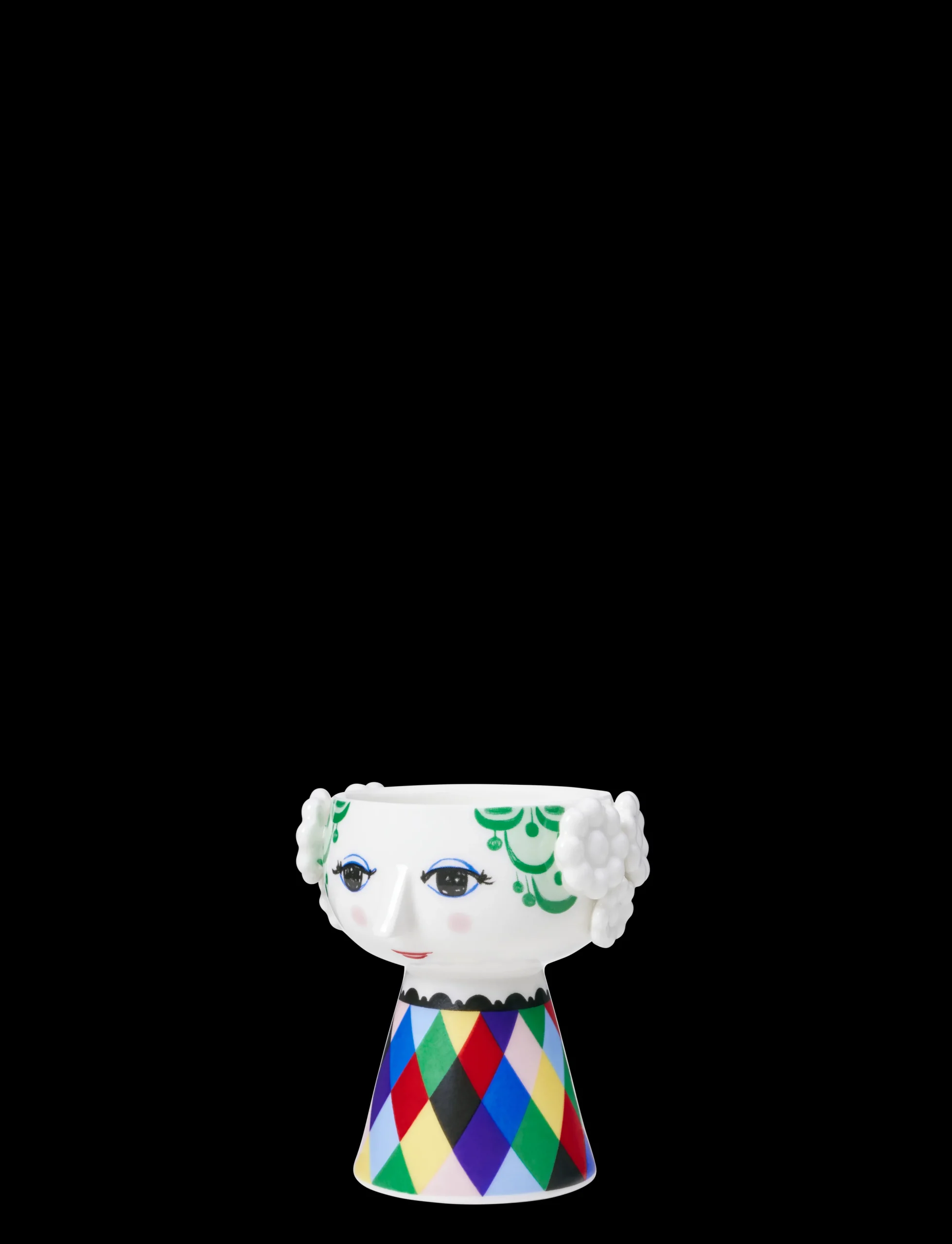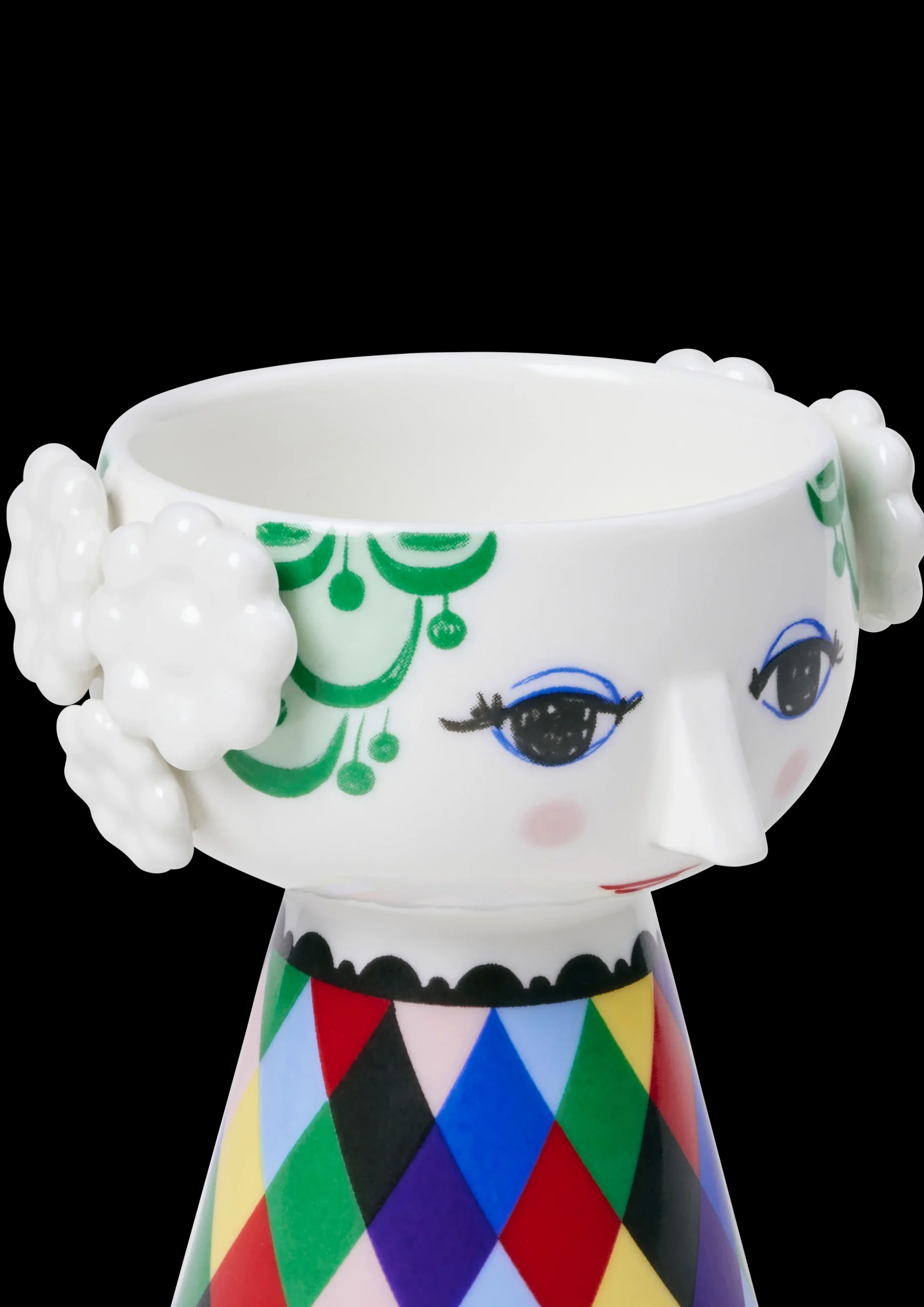 Bjørn Wiinblad repræsenterer alt, hvad der er skørt, skævt, kreativt og vidunderligt. Og med denne fine Eva-lysestage lavet af blankglaseret porcelæn med farvet decal i en speciel Tivoli-udgave med harlekinmønster får du finurlighed i fuldt flor i en sand farveeksplosion, der er både flot og skæv på samme tid. Det er ikke første gang, at Bjørn Wiinblad har haft et samarbejde med Tivoli. Tilbage i 1981 skabte den alsidige danske kunstner og den ikoniske forlystelsespark nemlig sammen en plakat, der stadig den dag i dag er udstillet i Tivoli. Det delikate ansigt på lysestagen er fra Wiinblads oprindelige streg hentet fra hans illustrationer, mens harlekinmønsteret på kjolen er en nyfortolkning af denne berømte Tivoli-plakat. Lysestagen er 9,5 cm høj og har en diameter på 8 cm. Designet emmer af kærlighed til overdådighed og er perfekt til både fyrfadslys og kronelys – eller helt alene som et lille skulpturelt indslag i indretningen. Eva-lysestagen vil pynte og skabe glæde i hjemmet og gøre hverdagen lidt mere farverig – præcis som Bjørn Wiinblad elskede det.
