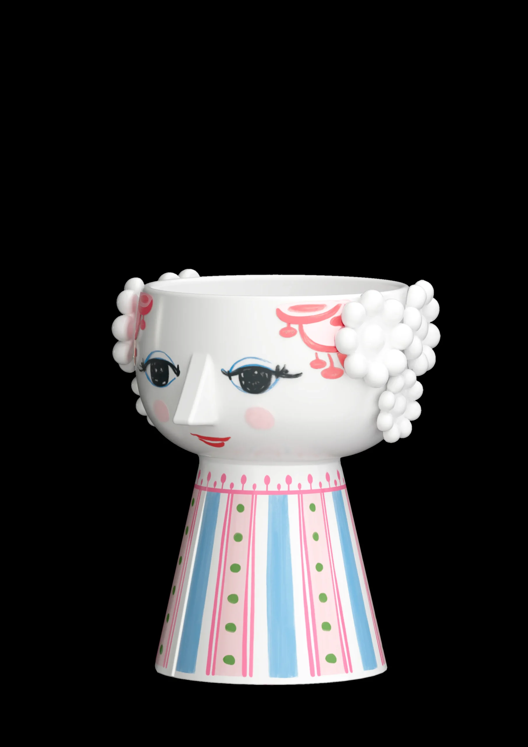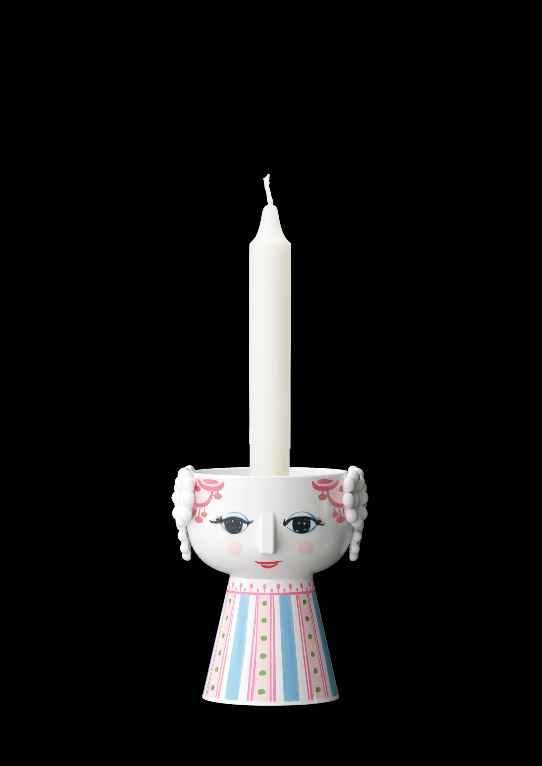 Udfold din farverige personlighed og lad kreativiteten lyse med Bjørn Wiinblads Eva. Med sit glade smil, de blussende kinder og farverige dekorationer rummer Eva på alle måder essensen af Bjørn Wiinblad som person og kunstner – også når hun tager form som lysestage. Glad og drømmende skaber hun liv og personlighed i indretningen med sit poetiske udtryk og sine sprudlende farver. Denne Eva-lysestage er 9,5 cm i højden og er primært pink i kombination med detaljer i lyseblå og grøn, der skaber et friskt og levende udtryk. Og når et tændt lys placeres i stagen, lyser den endnu mere op og gør hverdagen lidt mere farverig. Lysestagen er lavet af blankglaseret keramik med farvet decal og er inspireret af Bjørn Wiinblads originale Eva-univers, hvor brede hoveder med blomsterdekorationer og en kegleformet krop dannede grundstenene. Ansigtet med de mandelformede øjne og den spidse næse er Wiinblads oprindelige streg, og det farverige kjolemønster er en nyfortolkning af Bjørn Wiinblads illustrationer fra arkiverne.