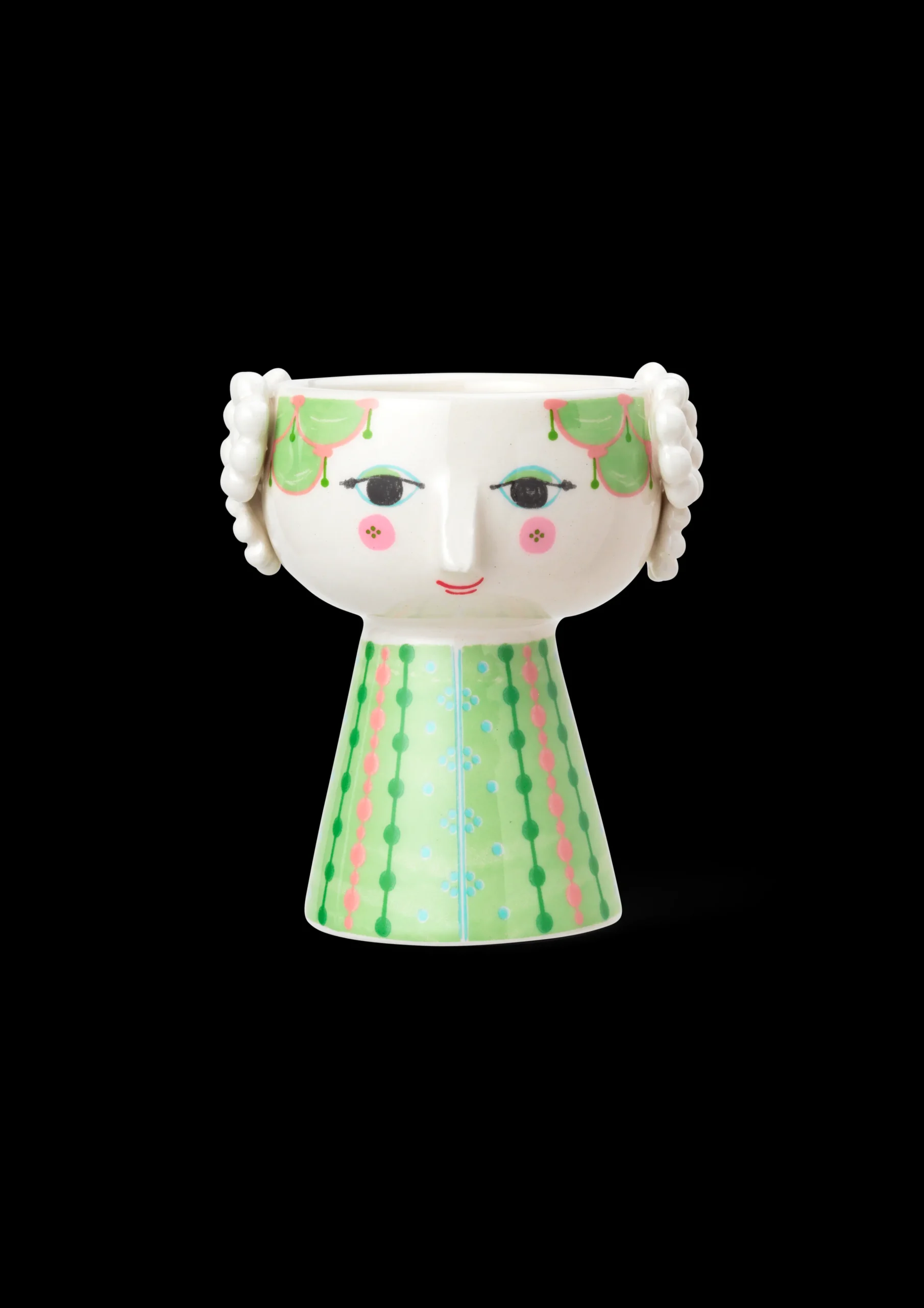 Gå foråret i møde med sarte, lyse grønne nuancer og finurlige mønstre. Den rødkindede lysestage er en nyfortolkning af Wiinblads originale lysestage, Eva. Eva er karakteriseret ved det brede hoved og en kegleformet stageform. Det venlige ansigt er lavet efter Wiinblads egen streg.