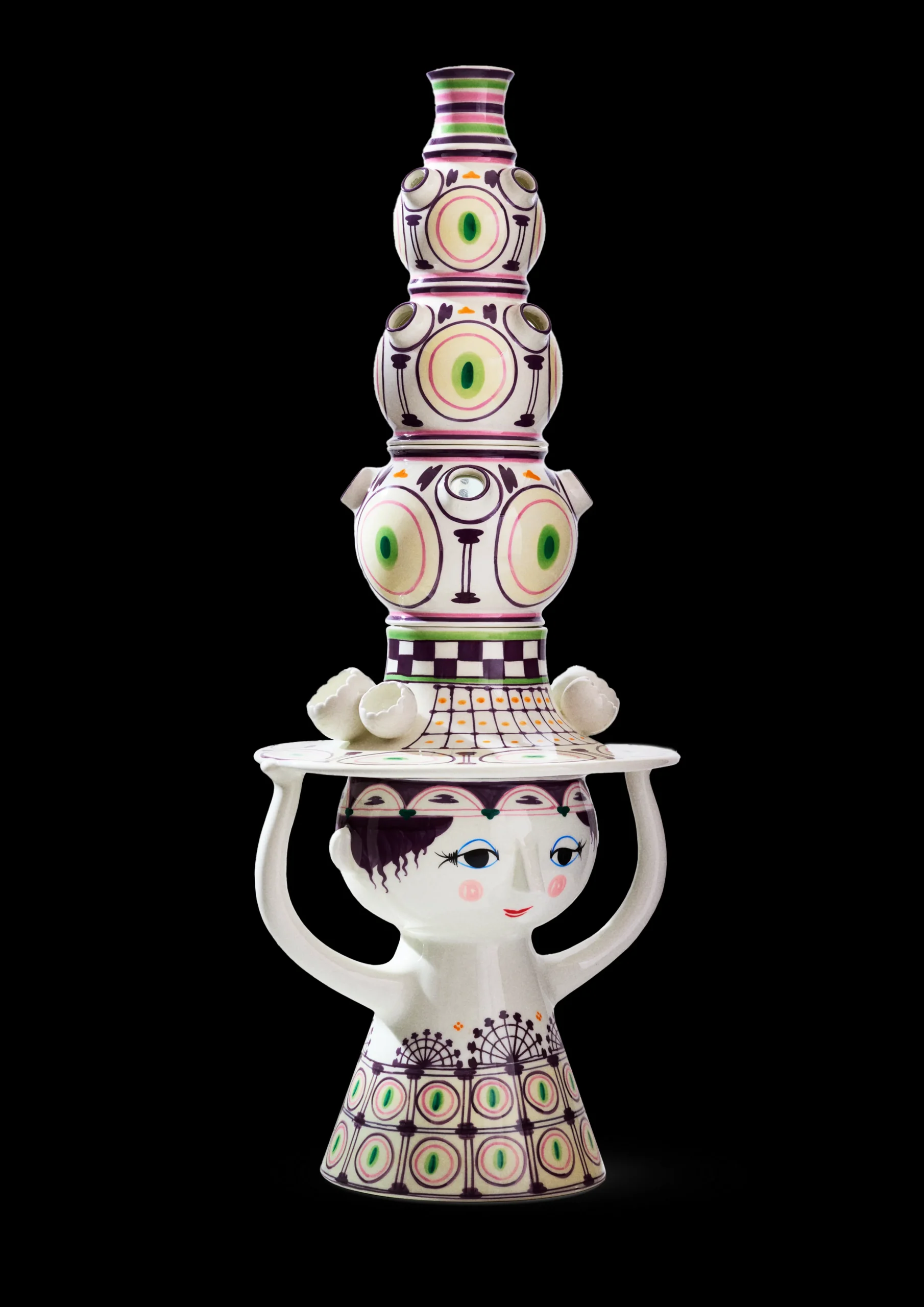 Invitér en rigtig Lady indenfor og lad hende skabe glæde i boligen med sine fine farver, finurlige detaljer og håndmalede dekorationer. Bjørn Wiinblad havde en forkærlighed for figurer med hatte, og arkiverne rummer utallige eksempler på, hvordan hatten dukker op igen og igen på nye, kreative og legende måder. Han designede selvfølgelig ikke små uanseelige pyntehatte. Nej, det var store voluminøse kreationer, der var både skulpturelle og avantgarde i deres udtryk – præcis som i serien Lady with hat. Og Bjørn Wiinblads univers bliver nok heller ikke meget mere magisk, fantasifuldt, fantastisk og overdådigt, end det er tilfældet med denne meterhøje vase – et ekstravagant showpiece lavet i glaseret keramik der omfavner alt, hvad der er skørt, skævt, kreativt og vidunderligt i Bjørn Wiinblads verden. Vasen måler intet mindre end 100 cm og er 100 procent hånddekoreret med motiver inspireret af Bjørn Wiinblads mangfoldige arkiv. Og det er ikke bare én vase. Gulvvasen består af tre individuelle vaser, der både fungerer sammen og kan stå alene. Vasens base prydes af det ikoniske ansigt med den trekantede næse, de mandelformede øjne, rosenrøde kinder og det finurlige smil på læben. Med sine skulpturelle arme holder den håndmalede hattefrøken den store hat, der er udsmykket med yndige tulipaner formet i keramik på hver side. Kjolen er fuldt dekoreret med cirkler og striber i blommefarvede nuancer, der er smukt afbalanceret i gule, lilla og grønne toner – farver der forbinder mystikkens verden med udforskning og fantasi. Og går du lidt tættere på, vil du også finde de fineste små prikker i en lys orange farve, der repræsenterer håb og positivitet og bidrager til at give vasen endnu mere varme og klarhed. De to andre vasedele er afrundede og har samme diametre på bunden, så du kan også vælge at sætte den øverste del direkte oven på bundvasen med det karakteristiske hoved og så bruge den midterste del som en selvstændig kuglevase ved siden af. Begge de to øverste vaser kommer i samme farvepalet som basen og har små åbninger på siderne, hvor tulipanerne falder flot hele vejen ned – eller op. På bunden af alle tre dele ses den originale Bjørn Wiinblad-signatur med den ’håndmalede’ tekst og et nummer fra 1 til 50. Alle Lady with hat-gulvvaser er nemlig individuelt nummereret, så du er sikret dit helt eget unikke håndmalede designikon. Selvom vasen er stor og prætentiøs, og selvom den måske vil give dine gæster en overdådig velkomst på trappen, bør den ikke stå udendørs.