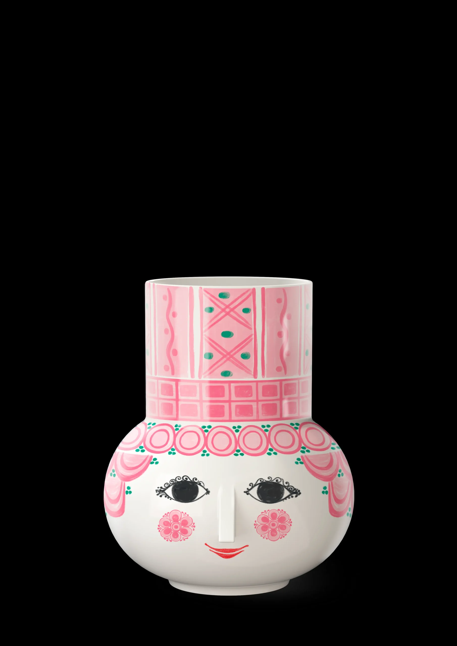 Udfold din farverige personlighed og lad kreativiteten blomstre med Bjørn Wiinblads Olga. Med sit glade smil, de blussende kinder og farverige dekorationer rummer Olga på alle måder essensen af Bjørn Wiinblad som person og kunstner – også når hun tager form som vase. Glad og drømmende skaber hun liv og personlighed i indretningen med sit poetiske udtryk og sine sprudlende farver. Olga-vasen er en nyfortolkning af en ikonisk vase, som Bjørn Wiinblad lavede i samarbejde med den keramiske fabrik Nymølle. Den har den samme cylindriske top som vasen fra Bjørn Wiinblads imponerende designarkiv og prydes af et sødt rundt ansigt med de mandelformede øjne og den ikoniske trekantede næse, der nok nærmest er selve personificeringen af Bjørn Wiinblads kunst. Den mindste vase i serien måler 15 cm i højden, men her er der så til gengæld med en klar pink med små grønne prikker fråset lidt mere med farverne. Alle Olga-vaser er lavet af skinnende glaseret keramik med farverige decals, og dekorationerne er en skøn blanding af originale Bjørn Wiinblad-mønstre, der i en skøn varieret farvepalet giver dig et moderne og friskt udtryk. Bjørn Wiinblad var en livsglad kunstner med en stor og farverig personlighed, der gik sine egne veje og ikke var bange for at drømme og tænke stort. Den sjæl mærkes også til fulde i Olga, der hviler i sig selv og inviterer os til at udtrykke vores egen stil og personlighed i indretningen med farverige blomsterbuketter, eksotiske planter og kreative dekorationer. En ting er sikkert: Det bliver ikke kedeligt, når Olga flytter ind.