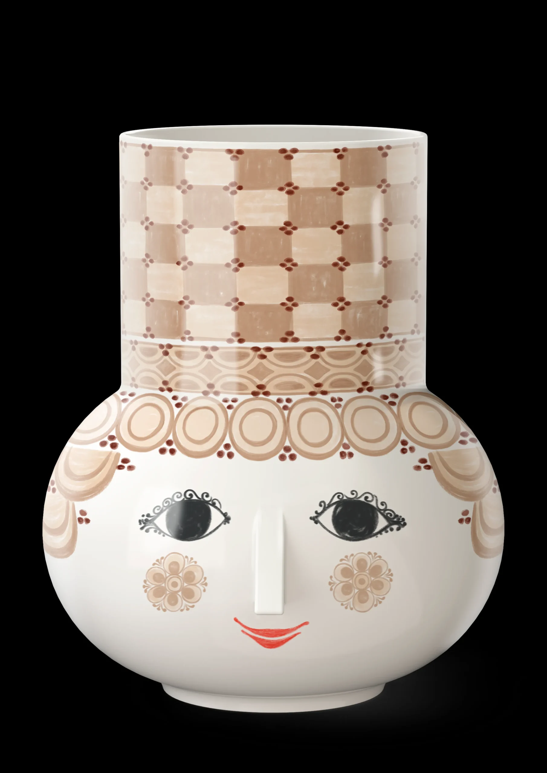 Udfold din farverige personlighed og lad kreativiteten blomstre med Bjørn Wiinblads Olga. Med sit glade smil, de blussende kinder og farverige dekorationer rummer Olga på alle måder essensen af Bjørn Wiinblad som person og kunstner – også når hun tager form som vase. Glad og drømmende skaber hun liv og personlighed i indretningen med sit poetiske udtryk og sine sprudlende farver. Olga-vasen er en nyfortolkning af en ikonisk vase, som Bjørn Wiinblad lavede i samarbejde med den keramiske fabrik Nymølle. Den har den samme cylindriske top som vasen fra Bjørn Wiinblads imponerende designarkiv og prydes af et sødt rundt ansigt med de mandelformede øjne og den ikoniske trekantede næse, der nok nærmest er selve personificeringen af Bjørn Wiinblads kunst. Den største vase i serien måler hele 35 cm i højden og smiler i al sin storslåede skønhed til os smukt dekoreret i en dæmpet sandfarve med støvede røde prikker. Alle Olga-vaser er lavet af skinnende glaseret keramik med farverige decals, og dekorationerne er en skøn blanding af originale Bjørn Wiinblad-mønstre, der i en skøn varieret farvepalet giver dig et moderne og friskt udtryk. Bjørn Wiinblad var en livsglad kunstner med en stor og farverig personlighed, der gik sine egne veje og ikke var bange for at drømme og tænke stort. Den sjæl mærkes også til fulde i Olga, der hviler i sig selv og inviterer os til at udtrykke vores egen stil og personlighed i indretningen med farverige blomsterbuketter, eksotiske planter og kreative dekorationer. En ting er sikkert: Det bliver ikke kedeligt, når Olga flytter ind.