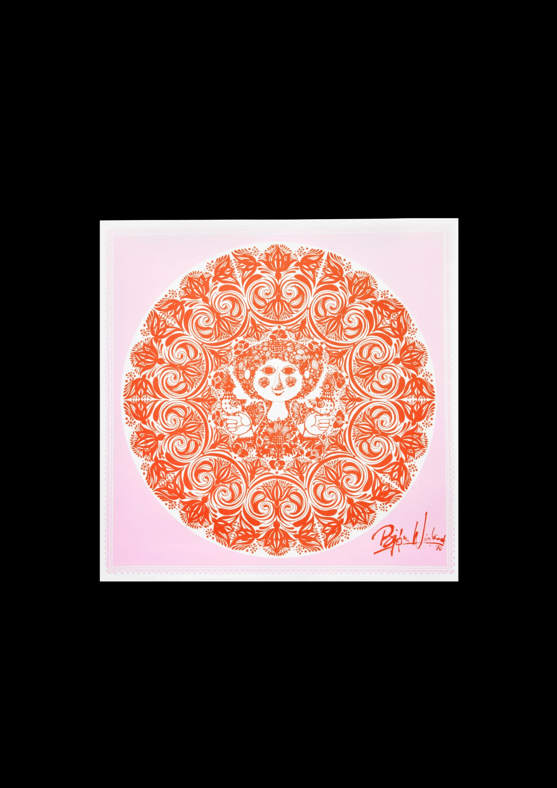 Wiinblad Art Faience 30×30 cm. I skøn symmetri holder kvinden med et mildt smil og mandelformede øjne kækt en fugl på hver pegefinger som symbol på fred og kærlighed. Bjørn Wiinblad lavede illustrationen til Nymølle’s Art Faience lancering og sagde i den forbindelse et interview i 1954, ”Jeg forstår ikke, hvorfor der ikke bliver gjort mere for at muntre folk op med farve i hverdagslivet”. For Wiinblads kunst var glæde og harmoni, og plakaten Art Faience er ingen undtagelse. Wiinblad lavede flere farvekombinationer, og denne reproduktion er i lyserød og orange.