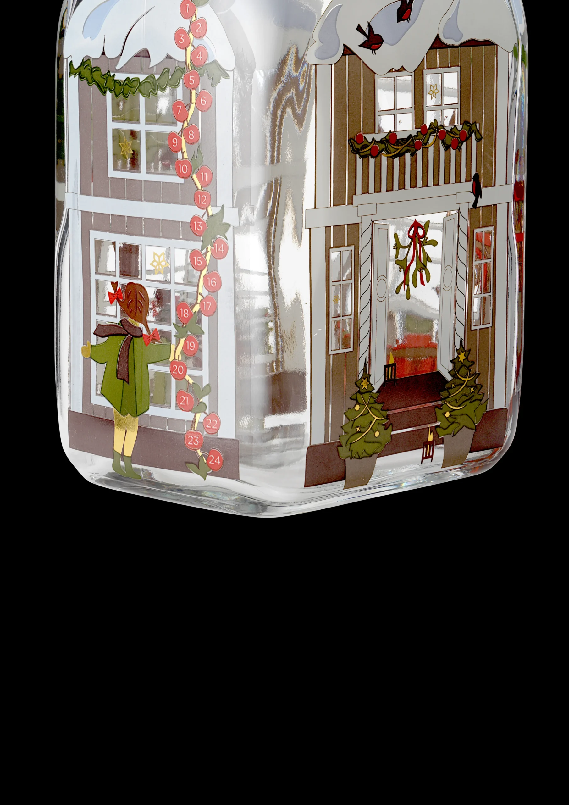 I 1981 skabte Jette Frölich for første gang sit karakteristiske papirklip til Holmegaards Juleflaske. Og her fire årtier senere er Holmegaards julekollektion blevet et højtelsket samlerobjekt for mange julefans. I år er designprocessen gennem refleksioner over julens magi mundet ud i en smukt illustreret julekollektion for Holmegaard, hvor Jette Frölich inviterer os til at holde julen sammen. Frölichs 2022-fortolkning af den stemningsfulde højtid illustrerer på smukkeste vis budskabet om vores fælles jul med hjemmet som omdrejningspunkt, og illustrationerne på flasken giver da også frit spil til forventningens glæde, når vi kryber sammen indenfor og samles med familie og venner fra nær og fjern. På forsiden ser du en hoveddør flankeret af juletræer, lanterner på trappen, julelys, sne og stakit. På siderne kan du gennem vinduerne se, at der er er pyntet op med julepynt, juletræ og gaver. Og for at understrege forventningens glæde – små børn der står ved vinduet og kigger ind. Der er også sørget for traditioner og forventningens glæde for de voksne, da du igen i år ned langs siden finder den klassiske kalender, så du dag efter dag indtil jul kan se frem til at nyde lidt af flaskens indhold og langsomt, men sikkert, nærme dig den 24. december.
