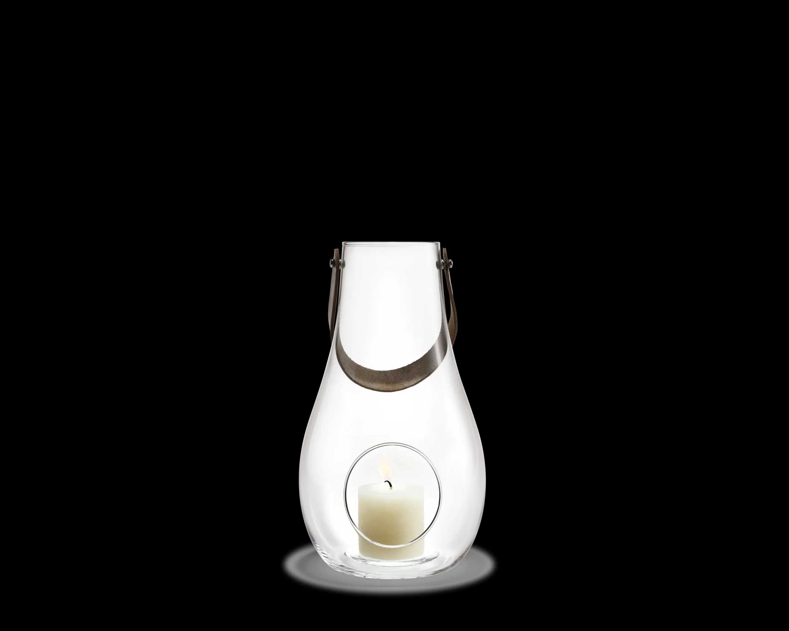 Brug Design with Light lanternen året rundt. Til sommeraftener på terrassen, til dekoration på gulv, bord, trappe og vinduer – og som en stilfuld juledekoration tilsat et par kogler, gran og kanelstænger i bunden. Maria Berntsen har skabt den mobile lyskilde i glas og kernelæder til at sprede hygge i skandinavisk stil. Denne lanterne er 29 cm høj, men den findes også i en lille version på 16 cm, en mellem version på 24,8 cm og en gulvversion på 45 cm. Lanternerne findes i både klart glas og er smukke at kombinere. En god gaveidé til en særlig anledning. Hvert stykke mundblæst glas er unikt og håndlavet af glaspusteren, som omhyggeligt blæser den rigtige mængde luft gennem den smalle pibe. Luftbobler i glasset er derfor uundgåelige og udgør en del af den charme, der kendetegner mundblæst glas.