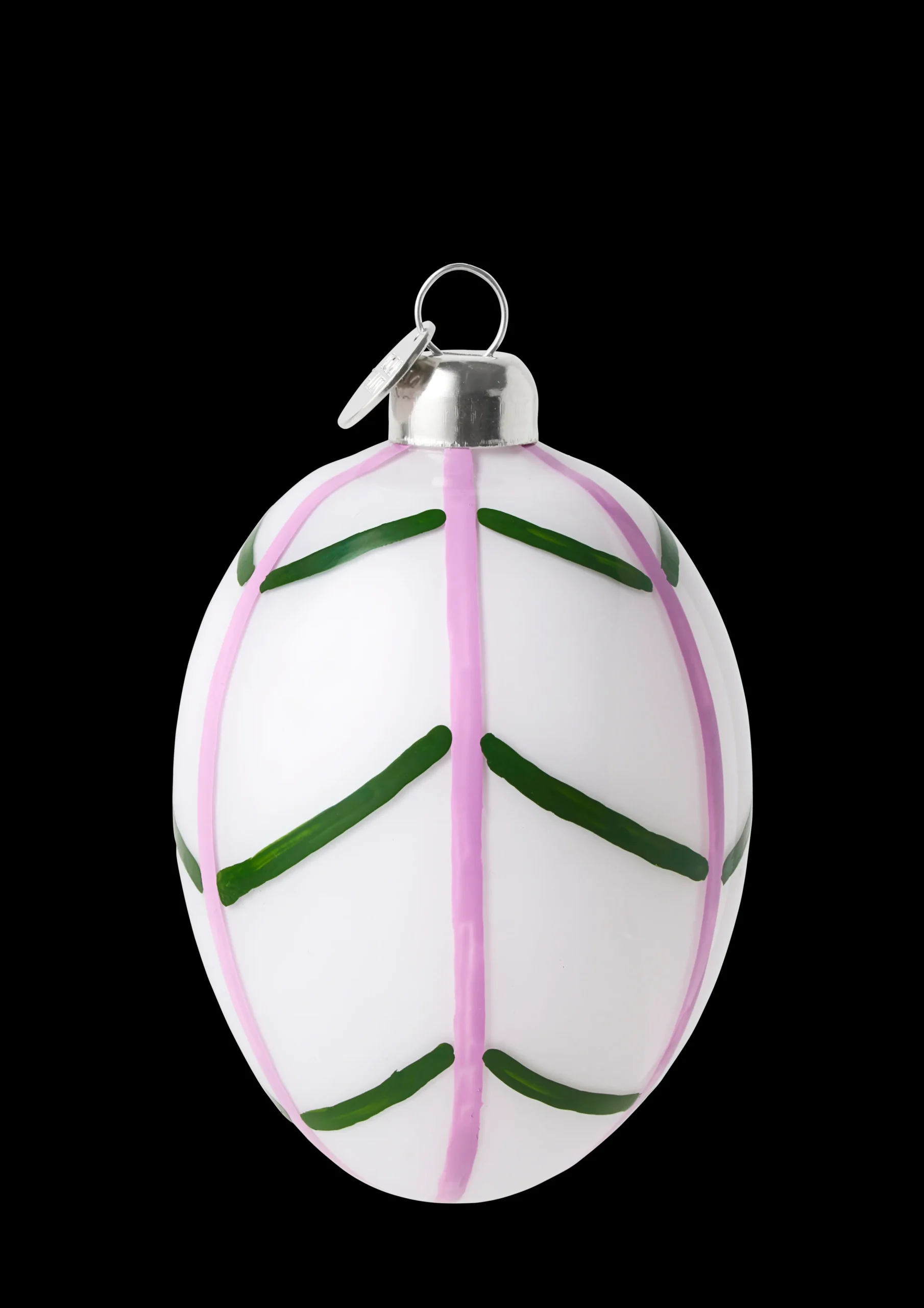 De fine Souvenir-påskeophæng i mundblæst borosilikatglas fra Holmegaard er inspireret af forårets optimisme og klare farver. Dette ophæng måler 7,5 cm og fortolker de første blade, der modigt folder sig ud efter den lange vinter. Enkelt og minimalistisk fornemmer du bladets linjer, der er malet i hånden med lethed og poesi. De klare, lilla striber skaber en moderne kontrast til den klassiske mørkegrønne, og forenet på den hvide baggrund giver det et rent og enkelt udtryk. Et sølvfarvet ophæng gør det nemt at hænge æggene på afklippede grene – eksempelvis i en stor vase – hvor de vil skabe øjeblikkelig påskestemning i boligen. De kan også hænges i vinduet, hvor de vil reflektere forårssolens stråler og kun blive endnu smukkere. Og et påskeophæng fra Holmegaard er også en oplagt værtindegave til påskefrokosten med familien eller vennerne.