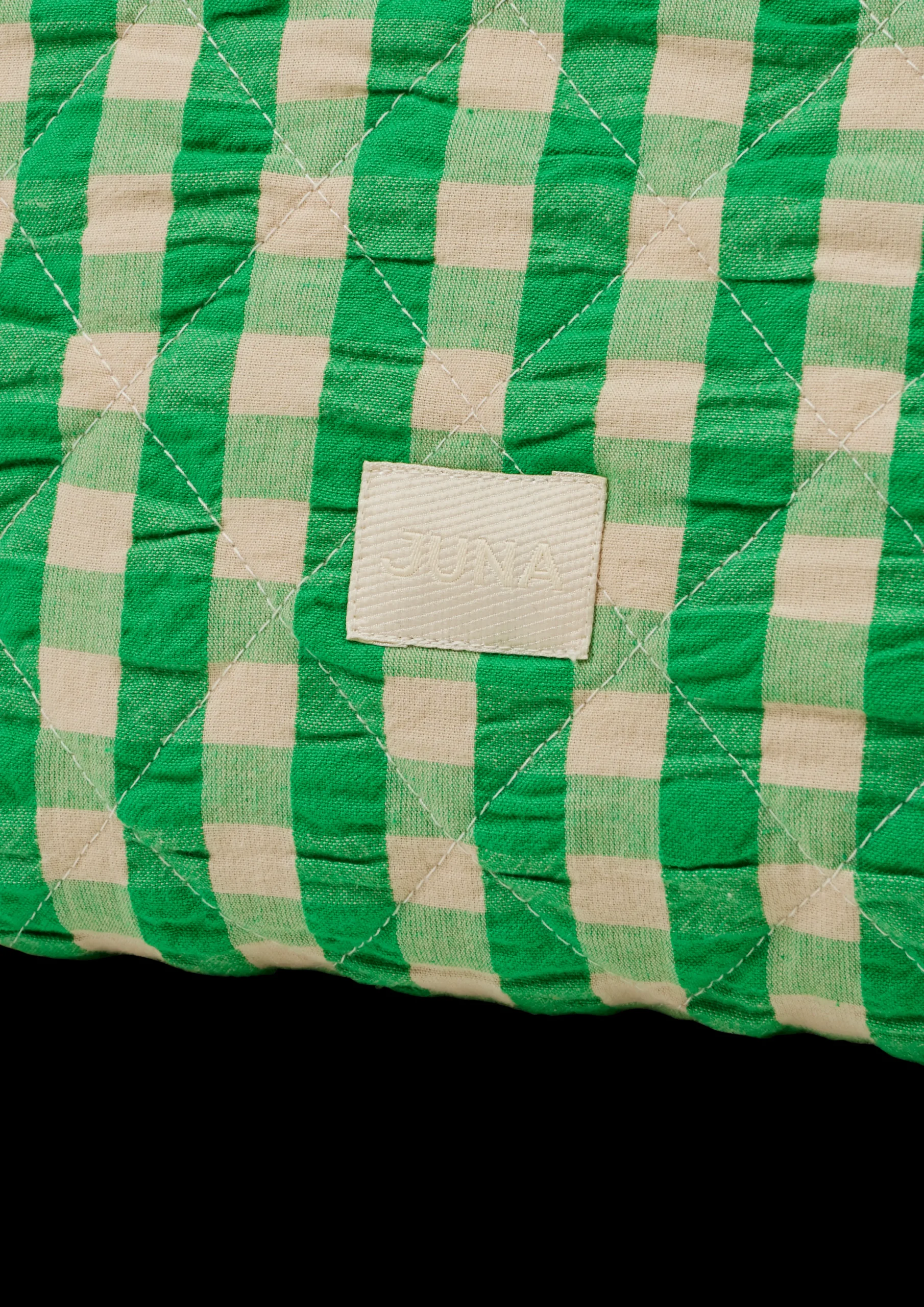 JUNA handler om glæden ved at omgive sig med tekstiler, der gør livet smukkere, blødere, mere farverigt og sjovere. Og med makeuppungen Bæku0026Bølge Nola fra JUNA får du en smart og praktisk quiltet pung til alt fra blush til mascara, der samtidig er nem at have med på farten. Den rummelige makeuppung måler 23x15x5 cm og kan også sagtens bruges til rejsedokumenter, skriveredskaber eller andre mindre genstande, som du gerne vil holde styr på i tasken eller derhjemme. Nola-makeuppungen er syet i 100% økologisk Bæku0026Bølge-bomuld i den meget populære farvekombination grøn/sand. Og som en del af JUNAs ansvarlige designfilosofi er makeuppungen naturligvis som altid produceret af overskudsstof fra produktionen af JUNA-sengetøj. Den tåler maskinvask op til 40 grader, hvilket ikke blot er skånsomt for miljøet, men også for bomuldsstoffet, der får længere levetid ved den lavere temperatur.