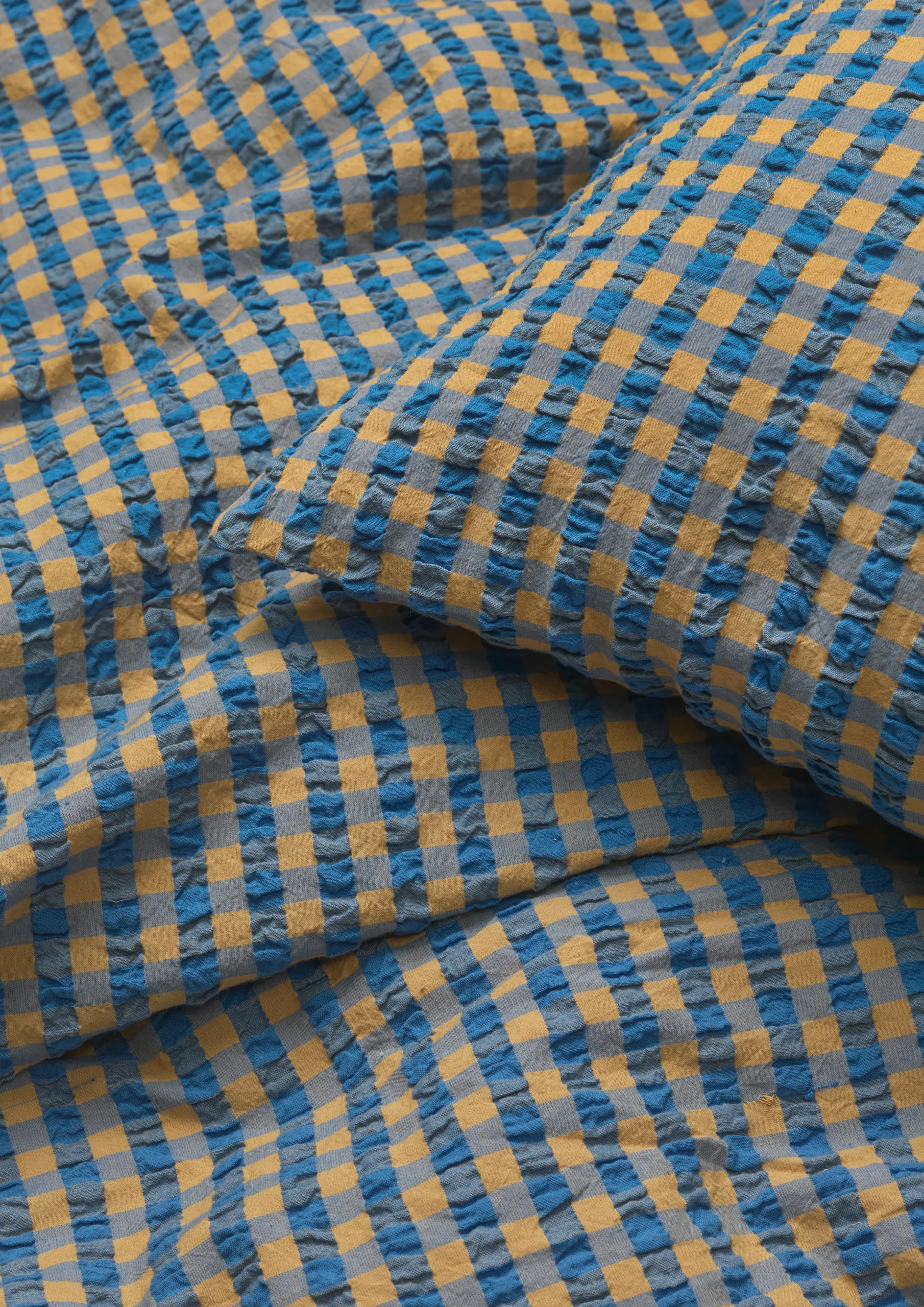 Det nye sengesæt i ternet Bæku0026Bølge kommer i farven blå/okker. Blå har en varm og afdæmpet friskhed over sig, mens okker giver en dybde og ro, der minder om en gåtur ved skov og strand på en smuk efterårsdag. Materialet er 100% økologisk bomuld, der både er OEKO-TEX®-mærket og GOTS-certificeret – og så er det ovenikøbet strygefrit. Pudebetrækket lukkes med kuvertlukning, mens dynebetrækket lukkes med knaplukning. Har du flere forskellige sengesæt fra JUNA, kan du mikse og matche de forskellige farver og mønstre på kryds og tværs og skabe din helt egen stil i soveværelset.