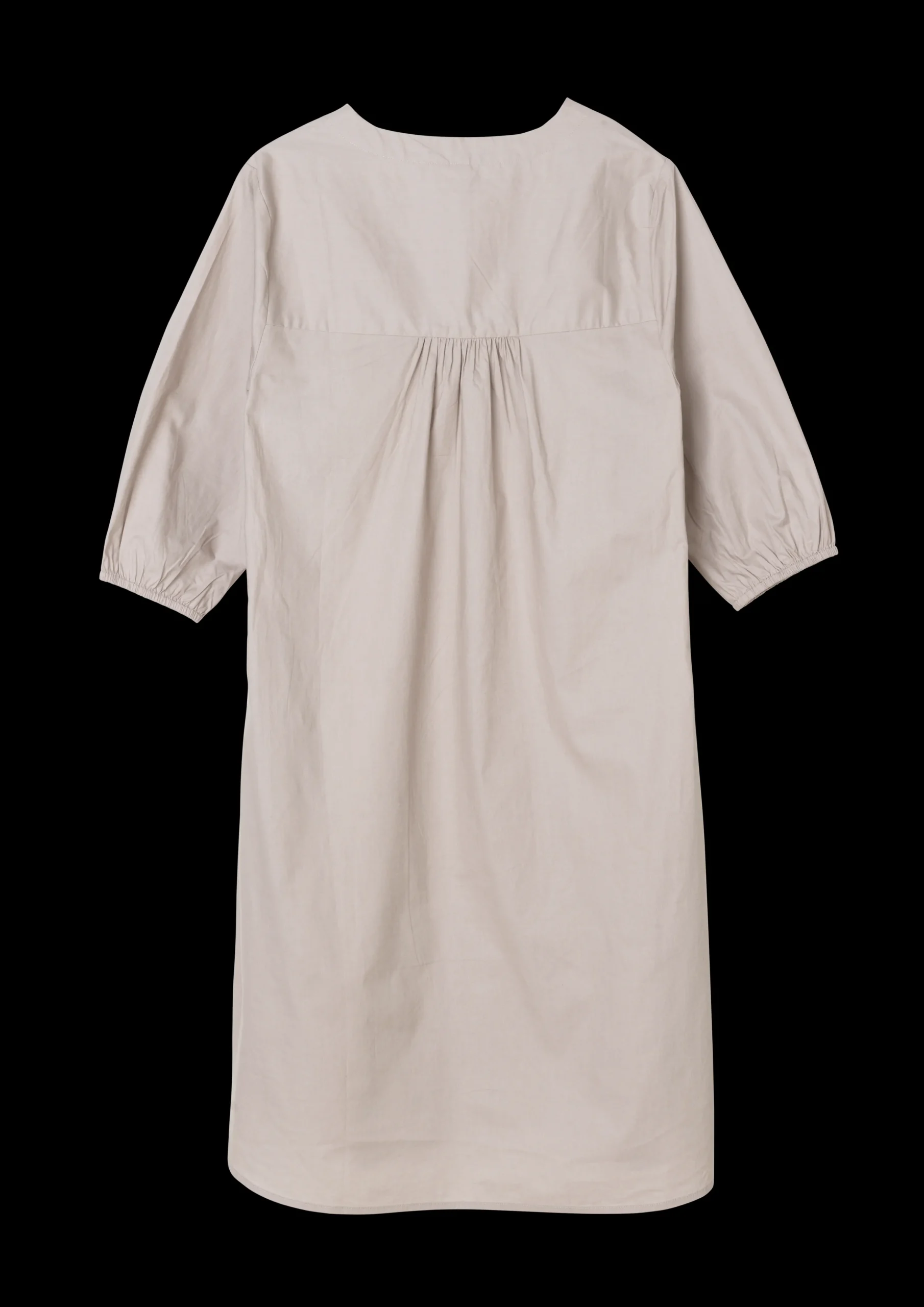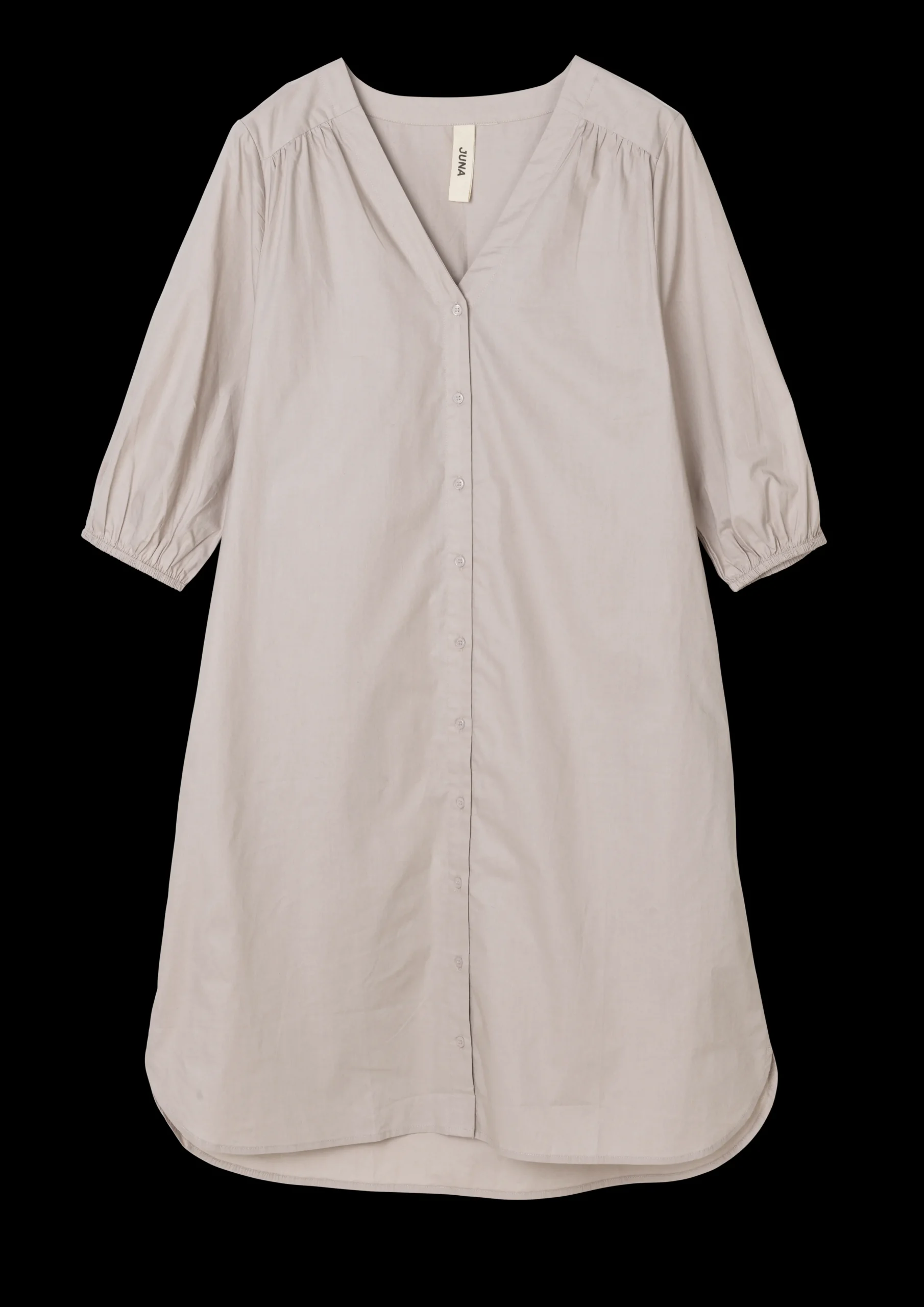 Juna Garderobe er fyldt med det fineste lette og luftige sommertøj, der både kan bruges som nattøj til de varme sommernætter og som en del af en casual sommergarderobe perfekt til lange sommerdage i haven, is på kajen og ture ud i det blå. Som en del af Junas bæredygtige designfilosofi bruges der altid overskudsstof fra produktionen af sengetøj til Juna Garderobe, og lige netop denne vævning og farve er den sidste af sin slags på Junas lager. Juna Soft har en helt unik struktur og kvalitet, der nærmest svæver over huden – stilfuldt og elegant. Stoffet kommer i grå farve som passer til alt og er smuk mod solgylden sommerhud. Kjolen i modellen Laura har mange fine detaljer som V-neck, gennemgående knapper, læg ved skuldrene og øverst på ryggen, elastik ved ærmerne, der giver et klassisk og feminint look og går til cirka midt på læggen. Skødesløst og casual, men i et skarpt snit og en lækker stofkvalitet. Tøjet i Juna Garderobe er altid fremstillet i 100% økologisk bomuld, produceres i overensstemmelse med EU standarder og tåler maskinvask op til 40°, hvilket ikke blot er skånsomt for miljøet, men også for tøjet, som får længere levetid ved den lavere temperatur. Bemærk, at dette produkt er stor i størrelsen.