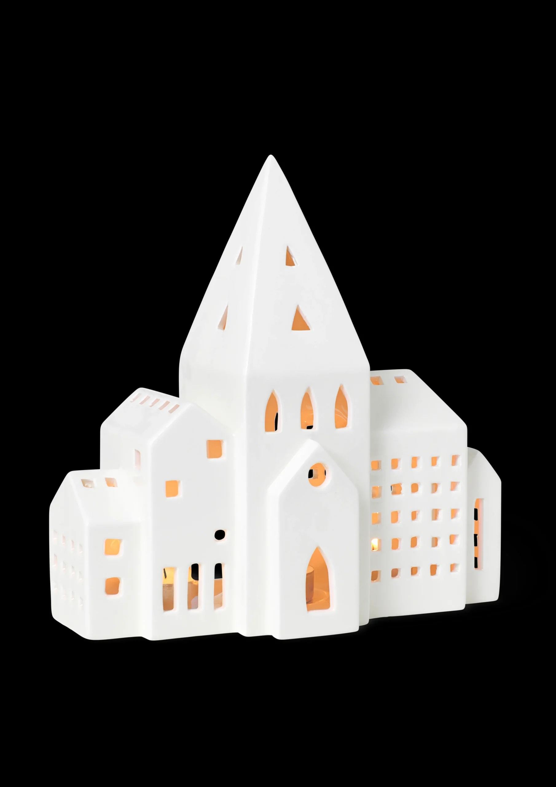 I år gør et nyt, større Urbania-lyshus sin entré i Kählers serie af arkitektoniske lyskilder, hvor det varme, levende lys kaster sit smukke skyggespil fra byens top. Det nye Lyshus City har form som en række af bygninger, der består af flere små huse og måske mest af alt minder om en del af byens torv. Der er plads til et fyrfadslys inde i bygningen – eller byen – og du vælger selv, om du vil bruge LED eller stearin. Lyshuset er 20 cm bredt og 8 cm dybt og passer fint i vindueskarmen eller som dekorationen på bordet, kommoden eller reolen, hvor det vil skabe dejlig julestemning i hele december. Alle Urbania-lyshuse er designet af Mette Bache og Barbara Bendix Becker og er kendetegnet ved en særlig formgivning, hvor bygningens stramme silhuet skaber rum til kreativitet i udformningen af hvert enkelt vindue.