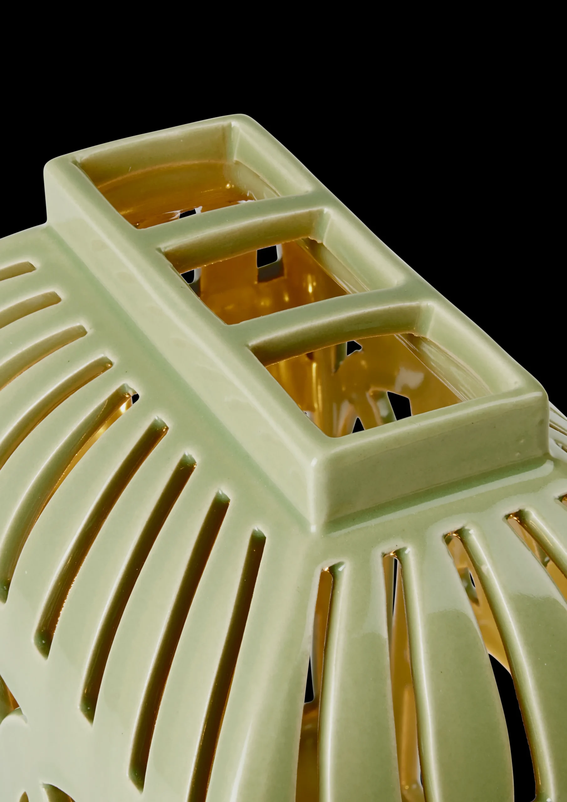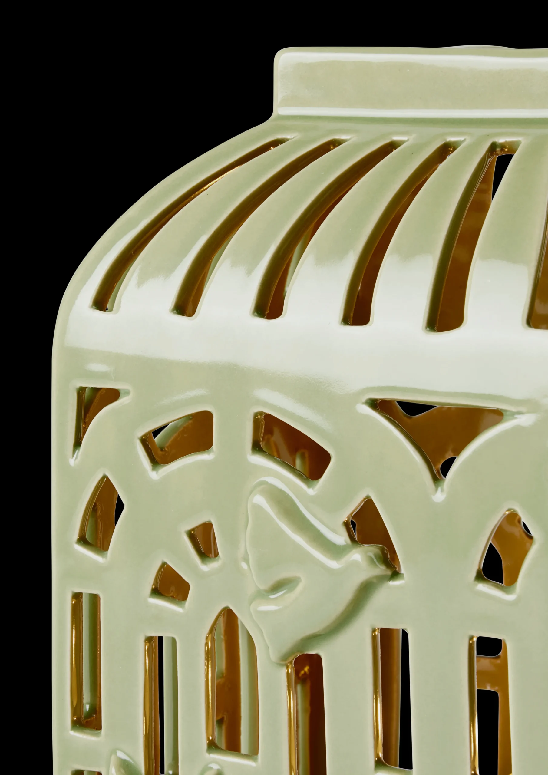 Det fine Orangery-lyshus på 16 cm er fremstillet i keramik og glaseret i den elegante og naturlige mellemgrønne farve Spring Leaf. Det er udformet som et gammeldags, romantisk orangeri, og du fornemmer tydeligt arkitekturen, stemningen og stofligheden. De mange små ruder, der udgør et orangeri, er gengivet som udskårne dekorationer i klassiske former. Herfra kan lyset fra fyrfadslyset strømme ud og skabe en hyggelig og varm stemning. Hver eneste lille udskæring er lavet i hånden ligesom de stiliserede fugle i forskellige silhuetter, der pryder ydersiden. Smukt keramisk håndværk fra Kähler, når det er bedst.