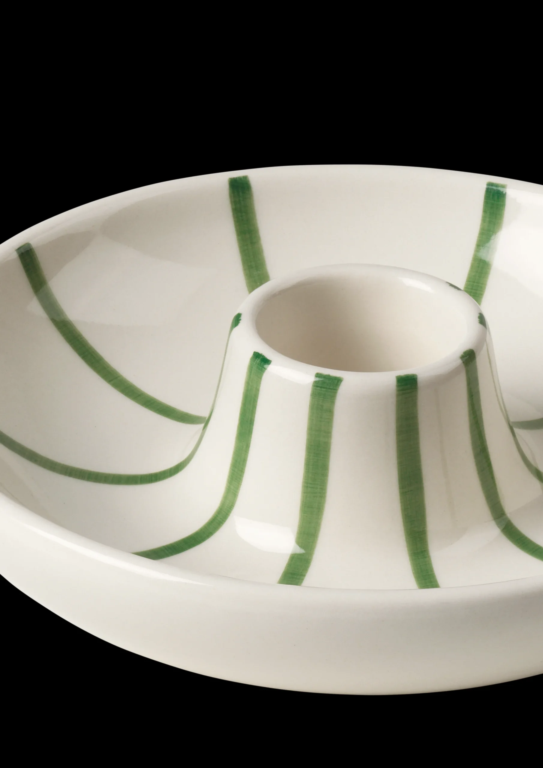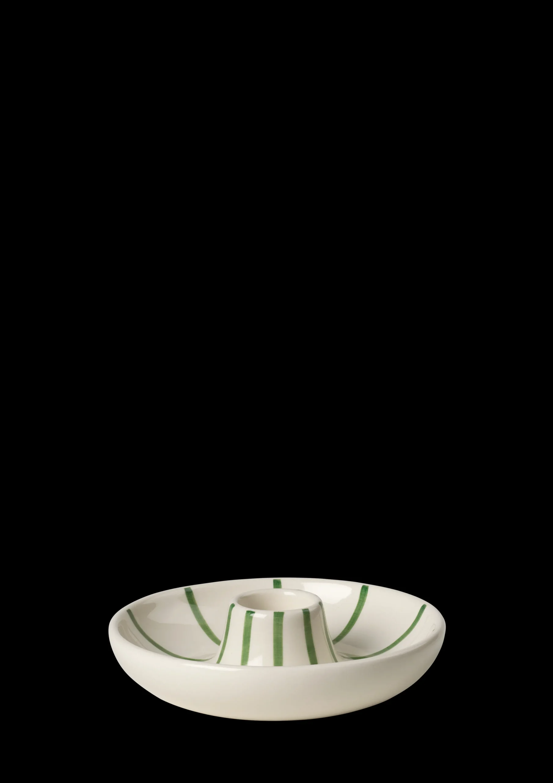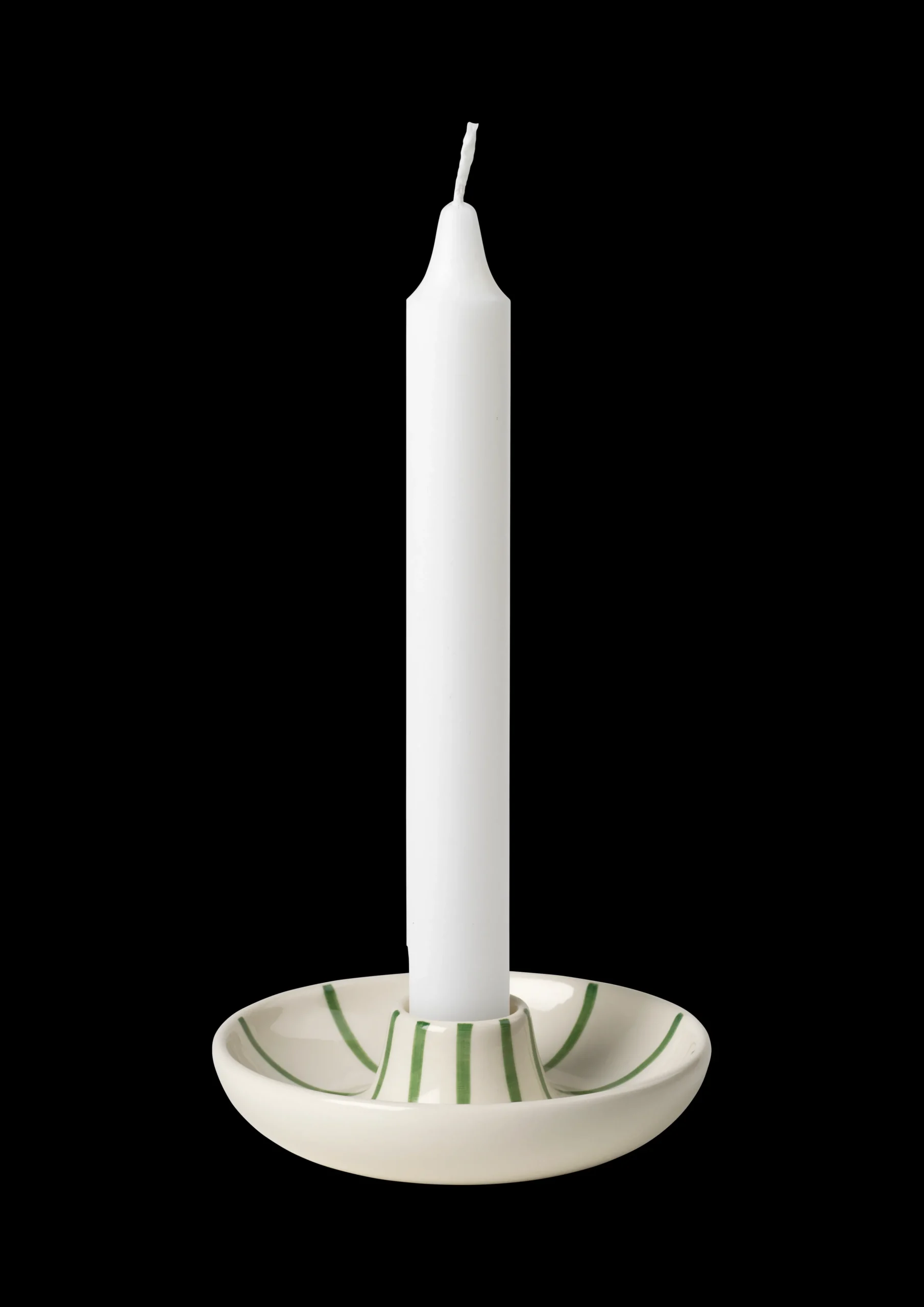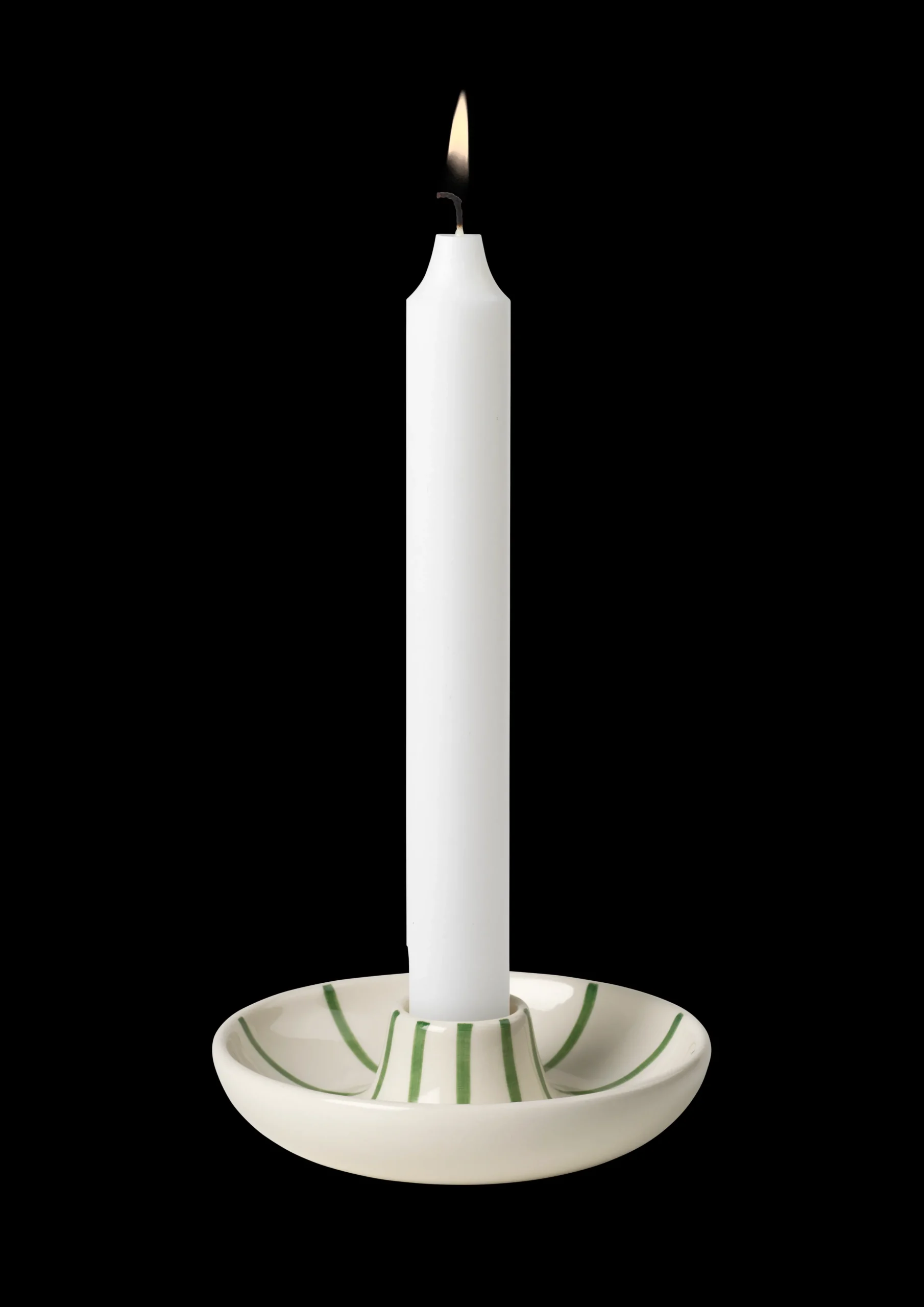 Med naturen som inspirationskilde har Meyer Lavigne skabt to vaser for Kähler med det legende og underfundige udtryk, der er designduoens signatur – deraf navnet Signature. Serien suppleres nu med en ny lysestage, der er skabt i forlængelse af vasernes poesi, formsprog og motiver. Stentøjsstagen har et blødt og organisk udtryk med en smuk symmetri, som man ser det på blomster og blade. Indersiden af den lave stage er dekoreret med håndmalede striber i en støvet grøn nuance, mens lyset placeres i midten og fuldender designet. Stagen passer til et almindeligt kronelys, og med et farvet, snoet eller ombre lys er det muligt at skabe en helt personlig stil i boligen. Som Kählers håndværksmæssige designtradition foreskriver det, er de grønne striber malet i hånden og har det liv, den dynamik og autenticitet i udtrykket, der er vigtig for Meyer Lavigne at få frem.