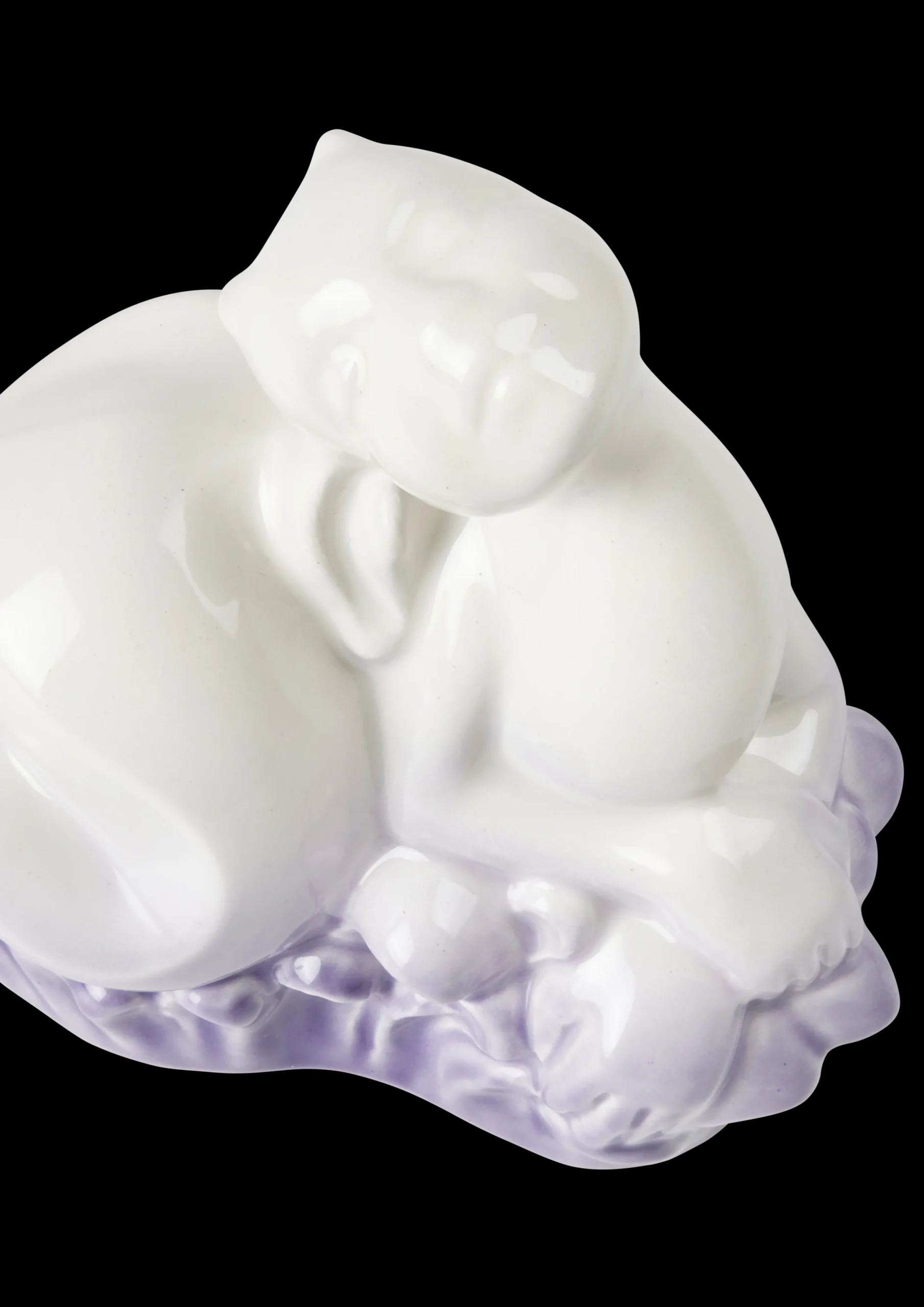 Den travle tilværelse, som vi ofte byder os selv, giver tit så meget uro og så mange forstyrrelser omkring os, at vi nemt kan glemme, at der overhovedet eksisterer en tilstand af ro. Og tilfredshed. For selvom vi jo godt ved, at denne fred findes, så hører det nok alligevel til sjældenhederne, at vi får fundet helt ind til den. Måske netop derfor er det en efterstræbt følelse, som vi håber at kunne finde på en eller anden vis. Med serien The Quietness inviterer kunstner Louise Hindsgavl gennem sin figurative kunst os til at tænke over flere af livets dybe følelser. Med de udtryksfulde figurer vil Louise Hindsgavl og Kähler have os til at stoppe op. Og ved at lade blikket falde på Quietness-figurerne blive smittet af udtrykket og tage et strejf af ro med os. Quietness-figurerne i glaseret keramik skal få os til at puste ud og reflektere over noget så stort som glæden ved selve eksistensen. Figurerne symboliserer ro, glæde ved livet og tilfredshed omkring ens egen eksistens. Samtidig symboliserer de styrke. The Quietness-figurerne er 12,5 cm høje og fås i grå, blå og denne lilla variant. Farven starter med en hvid glasur fra hovedet og fader langsomt ud i en farve, så figuren går fra lys til mørk. Alle emmer af Kählers autenticitet og håndlavede designtraditioner. Og som altid lægger Louise Hindsgavls udfordrende udtryksform op til, at vi tager en samtale om nogle af livets ofte lidt svære spørgsmål – som hvorfor vi som moderne mennesker ofte har så svært ved at slappe af og bare være os selv? For ud over at skabe moderne kunst og design til boligen så vil Louise Hindsgavl med The Quietness-figurerne gerne skabe en mental platform for, at vi kan finde ro til at være i nuet og være til stede. Vi skal ikke bekymre os, men være tilfredse med os selv og med forholdene. The Quietness bliver kun solgt på Holmegaard værket og på Rosendahl.com. Der bliver kun produceret 200 stk. af hver farve, og de er alle nummererede. Vi kan ikke oplyse om hvilket nummer din figur har/får.