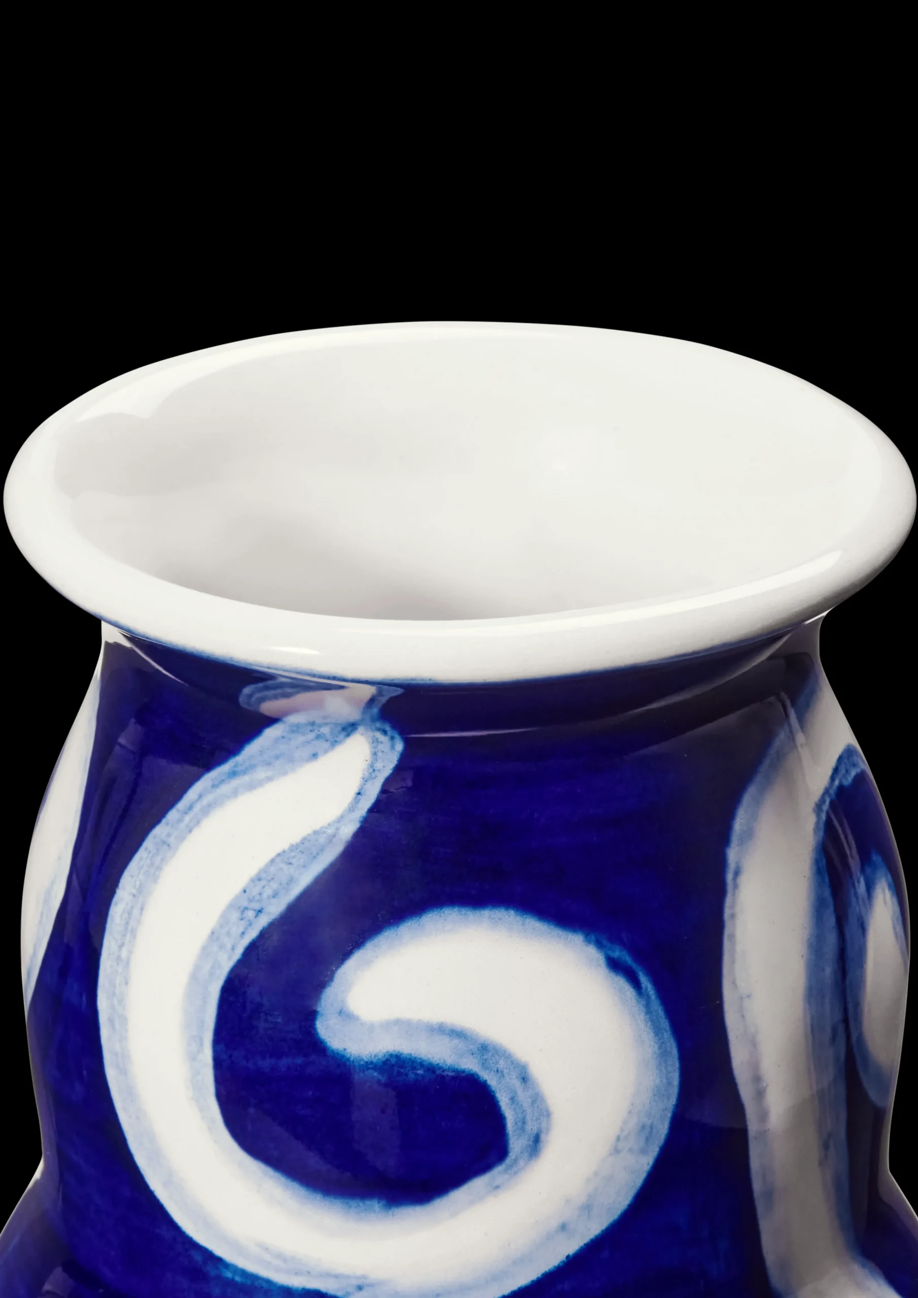 Med vaseserien Tulle hylder Kähler nostalgien og romantikken med håndmalede dekorationer inspireret af de ældre Kähler-vaser. Den skulpturelle vase i mellemstørrelsen på 12,5 cm i højden har en mørkeblå bund, hvor der ovenpå er malet hvide snørkler, der efterfølgende er glaseret. Her er penselstrøgene tydelige, organiske og naturlige og er med til at give vasen et unikt udtryk. Vasen er skabt i et lækkert autentisk og kunstnerisk udtryk i en moderne kontekst i en lille størrelse, hvor der til gengæld er blevet leget med at skabe ekstra dybde og liv gennem dybe og fyldige glasurer med oprindelse i det gamle Kähler-værksted. Det er en af dygtigste malerdamer fra dengang, Tulle Emborg, der nu får æren af at lægge navn til Tulle-serien. Og du kan både se og føle, at der er et menneske bag, der har gjort sig umage med at male vasen i hånden for at skabe et ekspressivt og levende udtryk. I dekorationerne fornemmer du også tydeligt den kunstneriske forståelse og de intuitive bevægelser, der gør Tulle-vasen til et lille kunstværk i sig selv og tilfører den en helt særlig nostalgisk autenticitet. De runde former skaber en skulpturel og grafisk silhuet, så vasen også sagtens kan stå alene uden blomster som en del af en både romantisk og moderne indretning.nnu003cpu003eNår du køber din Tulle-vase på Rosendahl.com, får du en mulepose til en værdi af 129 kr. med i købet. nnu003cpu003eMuleposen fås kun på Rosendahl.com.nnu003cpu003eFor at keramikken kan ånde, skal den opbevares og tørre med bunden i vejret, da den ellers kan afgive fugt på grund af vandabsorbering.nnVi anbefaler altid at sætte møbelsko under vaser og urtepotter for at forhindre kondensvand, som kan være årsag til fugtpletter på underlaget.