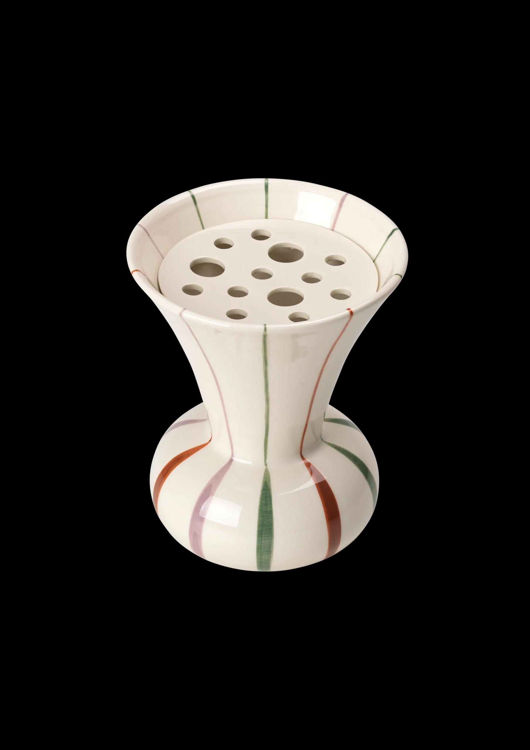 Med naturen som inspirationskilde har MeyerLavigne skabt to nye vaser for Kähler med en unik blomstertragt lignede form. Vasen har medfølgende keramikplade med huller inspireret at lotusplantens frøstand, der gør det muligt at arrangere blomsterne præcis, som man vil have dem. Vasen kan naturligvis også bruges på traditionel vis uden pladen til en almindelig bundet buket. Vasen er lavet i stentøj, og som Kählers håndværksmæssige tradition foreskriver det, er vaserne håndmalede og har liv, dynamik og autenticitet i udtrykket. Vasen er dekoreret med striberne der starter brede på den runde del af vasen og bliver tynde og fine på den tragtformede del. Striberne er i mosgrønne, terracotta og lilla afdæmpede farver, der smukt komplementerer hinanden. Design MeyerLavigne