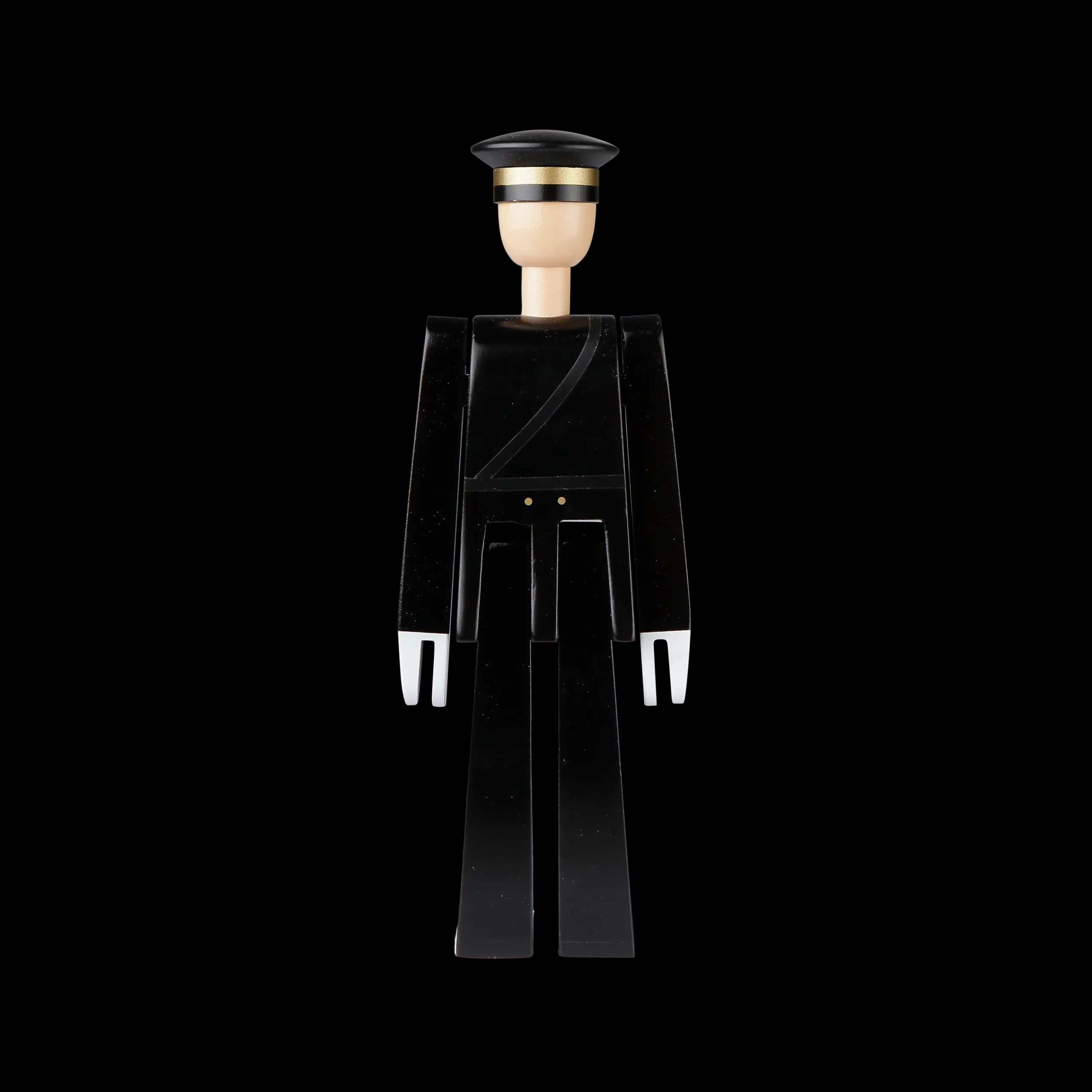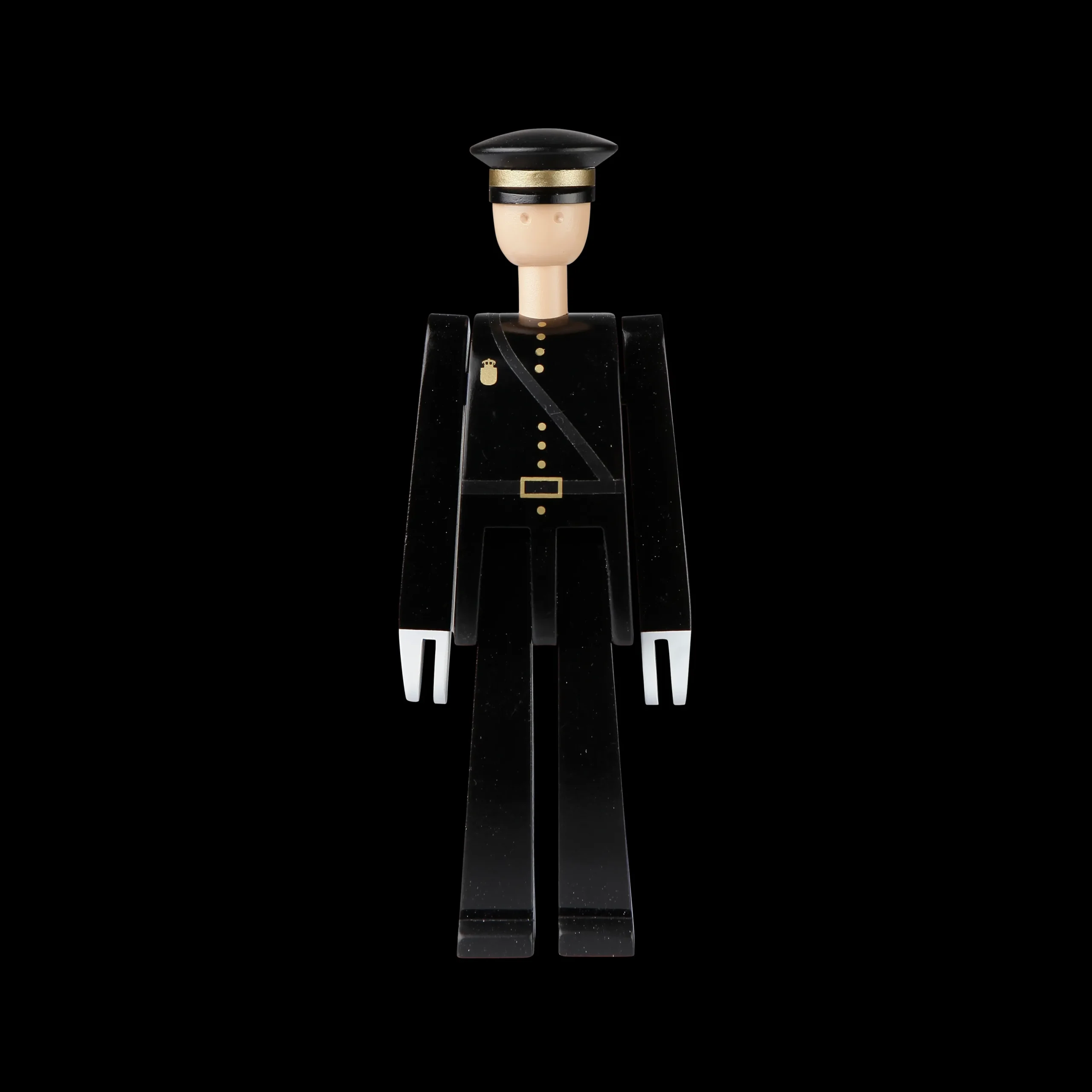 Politimanden fra Kay Bojesen blev designet i forbindelse med inspirationen til andre uniformerede institutioner. Politimanden er i samme serie som garderen og postbuddet. Disse uniformerede træfigurer har vundet danskernes hjerter. I dag er de fast inventar i de fleste danske hjem. nPolitimanden er med sin sorte farve et tidløst indretningselement. Han passer særligt godt ind i det moderne designhjem. Men kan lige så vel pryde en almindelig dansk familieindretning. nDen unikke og tidløse politimand er fremstillet i bøg, som herefter er blevet malet i sort. Han måler 18,5*7*4 cm. Den uniformerede træfigur er en perfekt gave til designelskeren, som kan se det smukke og unikke i politimanden.