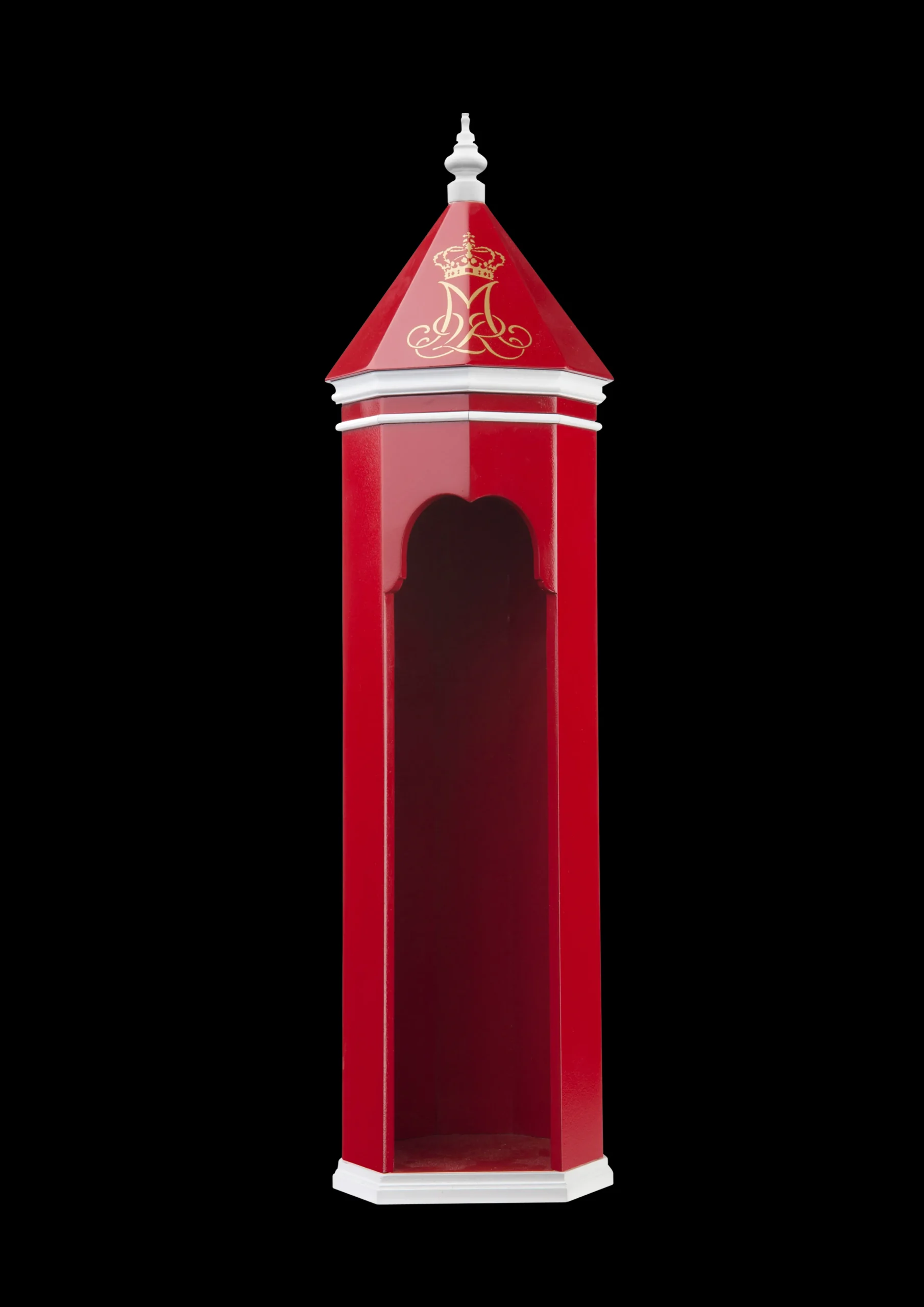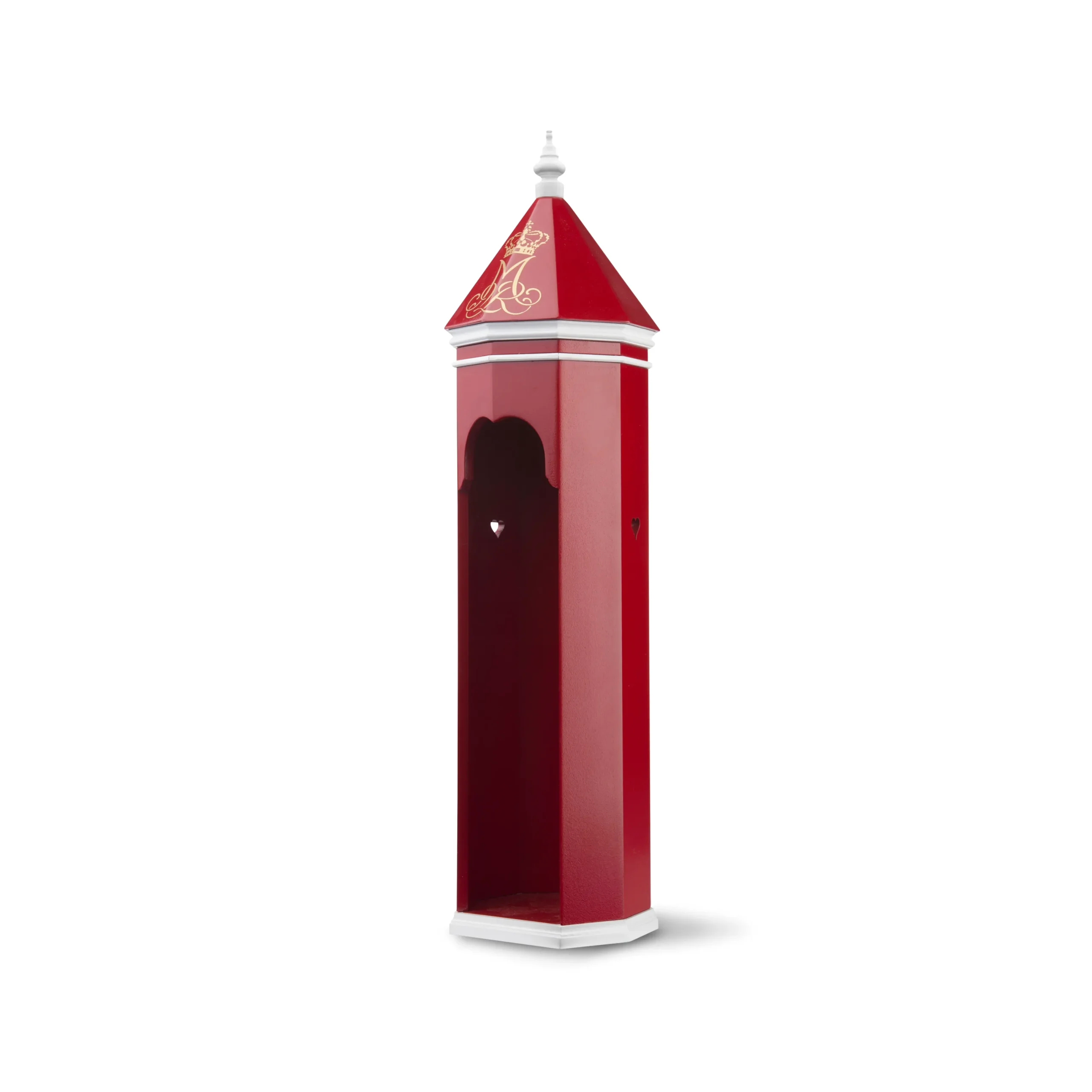 Flot skilderhus i træ til de fine gardere fra Kay Bojesen. Skilderhuset måler 36 cm i højden og er nedskaleret efter originale tegninger af Forsvarets skilderhuse. Den Kongelige Livgarde har stået vagt ved de danske slotte siden 1658, hvor Kay Bojesen tegnede de klassiske gardere i 1942. Nu kan du give din garder husly med det smukt udførte skilderhus, der er malet i de traditionelle røde og hvide-farver og dekoreret med det kongelige monogram i guld.