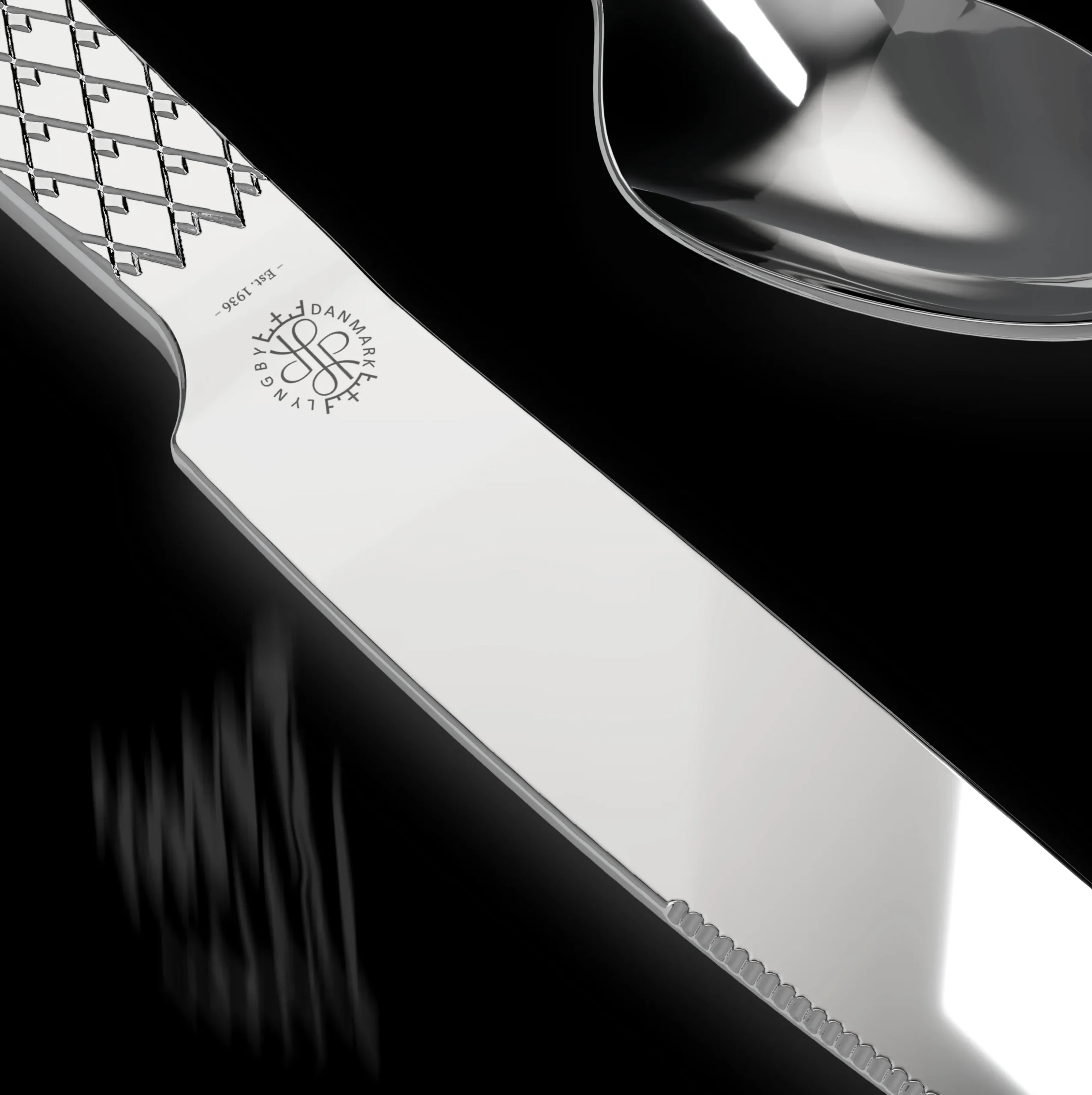 Skab samhørighed i din borddækning med den ikoniske Rhombe-signatur. Med Rhombe-bestiksættet fra Lyngby Porcelæn kan du nu få en unik helhed på tværs af alle Rhombe-serier og nyde den ekstra dybde og taktilitet, som et smukt bestiksæt i 100% genanvendt stål tilfører med sine stilrene linjer til perfektion. Hvert enkelt stykke bestik er skabt til at harmonere med detaljerne i porcelænet, så du har muligheden for at skabe præcis den følelse af luksus, der gør hvert måltid til en sublim sanseoplevelse – komponere dit eget personlige mesterværk til at fejre alle de små øjeblikke og forvandle hverdagen til noget særligt og til at gøre hver festlig sammenkomst uforglemmelig med en fuldendt stil og finesse. Kniv, gaffel, ske og teske. Fire stk. af hver. Og det velkendte grafiske Rhombe-udtryk går selvfølgelig igen på alle 16 dele i det nye bestik, hvor mønsteret ligger på skaftet og er hævet som et lavt relief, præcis som du kender det fra seriens steldele. Det er ikke kun smukt og stilfuldt, men sikrer dig også en udsøgt taktil fornemmelse i hænderne, når du holder bestikket. Du får med Rhombe-bestiksættet et strømlinet og eksklusivt design, der indbyder til, at du griber om bestikket og mærker reliefferne i hånden. Og samtidig forlænger det smukt og stilfuldt Rhombe-mønsteret ud på bordet. Den blanke finish på alle dele i bestiksættet er med til at forstærke den visuelle dybde i Rhombe-mønsteret, der med det samme fanger øjet og giver et helt unikt visuelt blikfang, du kun kan få med det originale Rhombe-design. Med en flot finish og et lille diskret logo præget i det i polerede stål matcher det både det klassiske hvide Rhombe-stel, Rhombe Earth-kollektionen og Rhombe Color-delene, og vil som noget helt nyt bidrage med at udvide hele Rhombe-seriens mange porcelænsdele med et nyt lækkert og naturligt materiale, der lader det diskrete mønster træde frem på en ny måde – og hvor kontrasten mellem det bløde formsprog og den stramme Rhombe-reflief trækker mønsterets former endnu mere tydeligt frem og skaber fokus.