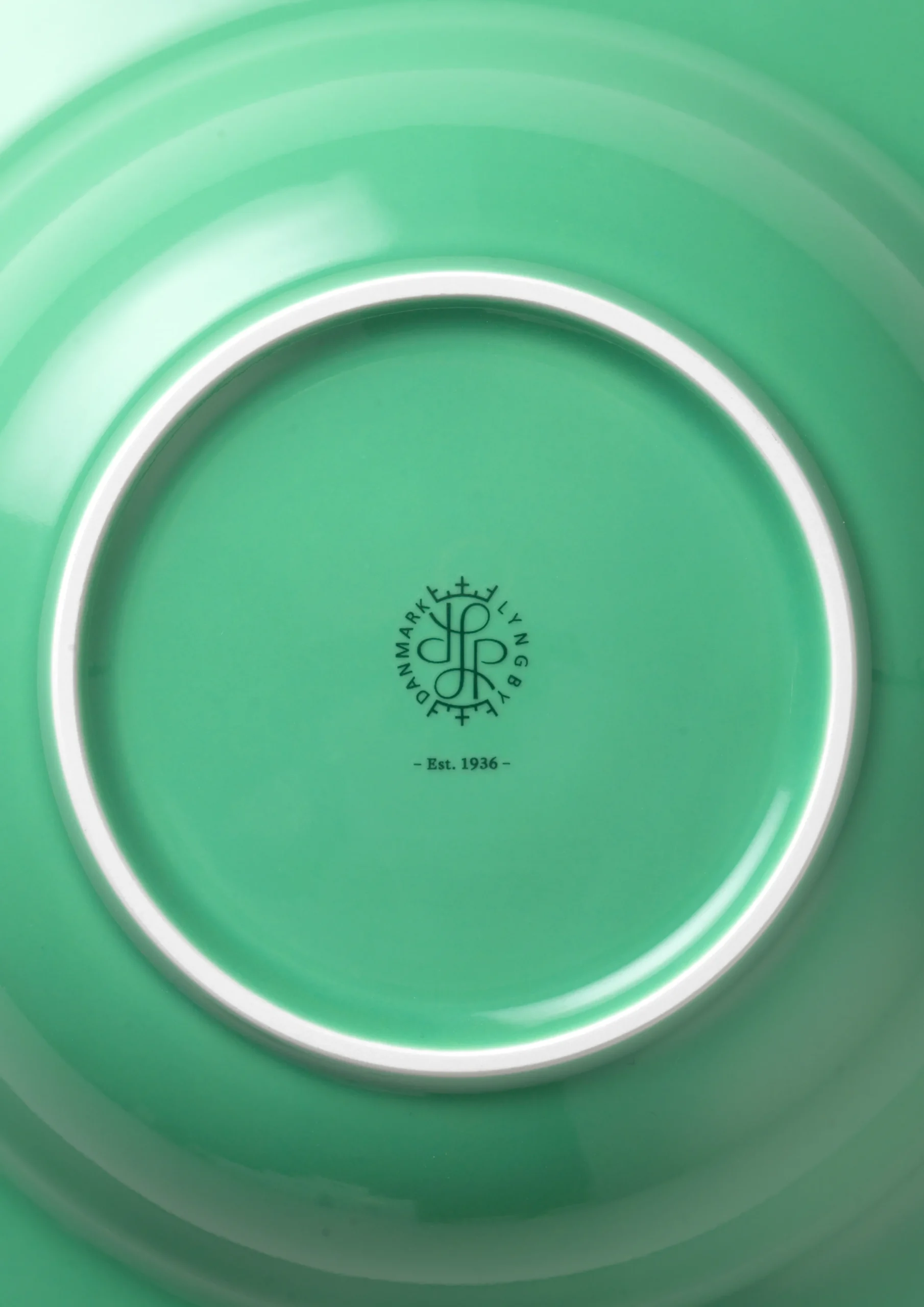 De markante farver i Rhombe Color er udvalgt i et samarbejde med designduoen Stilleben. Serien tilføjer endeløse kreative muligheder og all farvevarianterne kan mixes på kryds og tværs eller sammen med det hvide Rhome stel, præcis som man har lyst til. Rhombe-mønsteret stammer fra Lyngby Porcelæns arkiver og så første gang dagens lys tilbage i 1961. På den fine Rhombe-pastatallerken i håndlavet porcelæn er mønstret ikke ligesom dengang overført på porcelænet som et mønster, men brugt som relief. Dette giver tallerkenen et simpelt og klassisk udtryk, der pryder borddækningen til både hverdag og fest. Middagstallerkenen er vist i grøn porcelæn. Rhombe middagstallerken har 2 års brudgaranti.